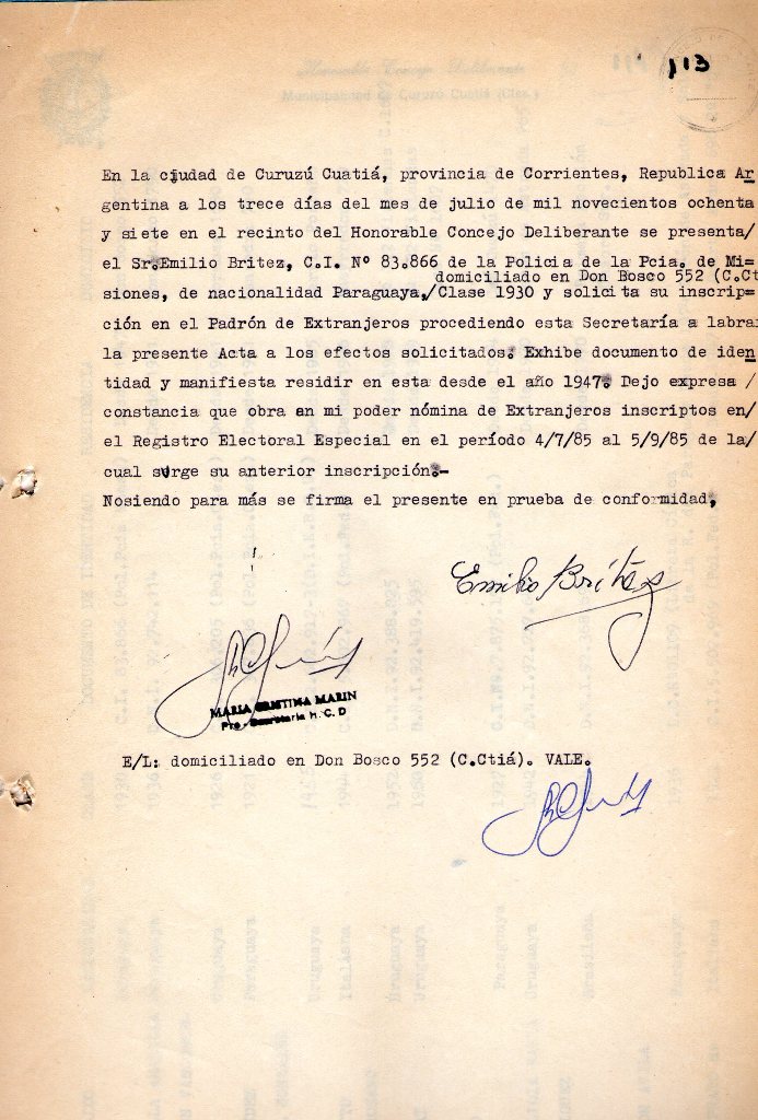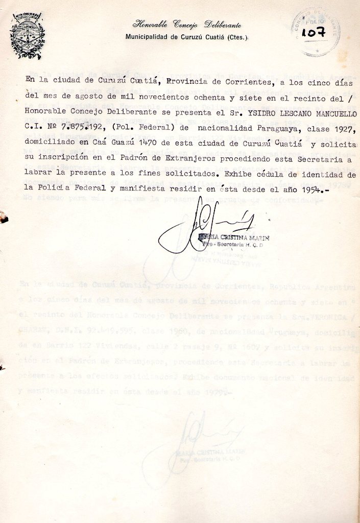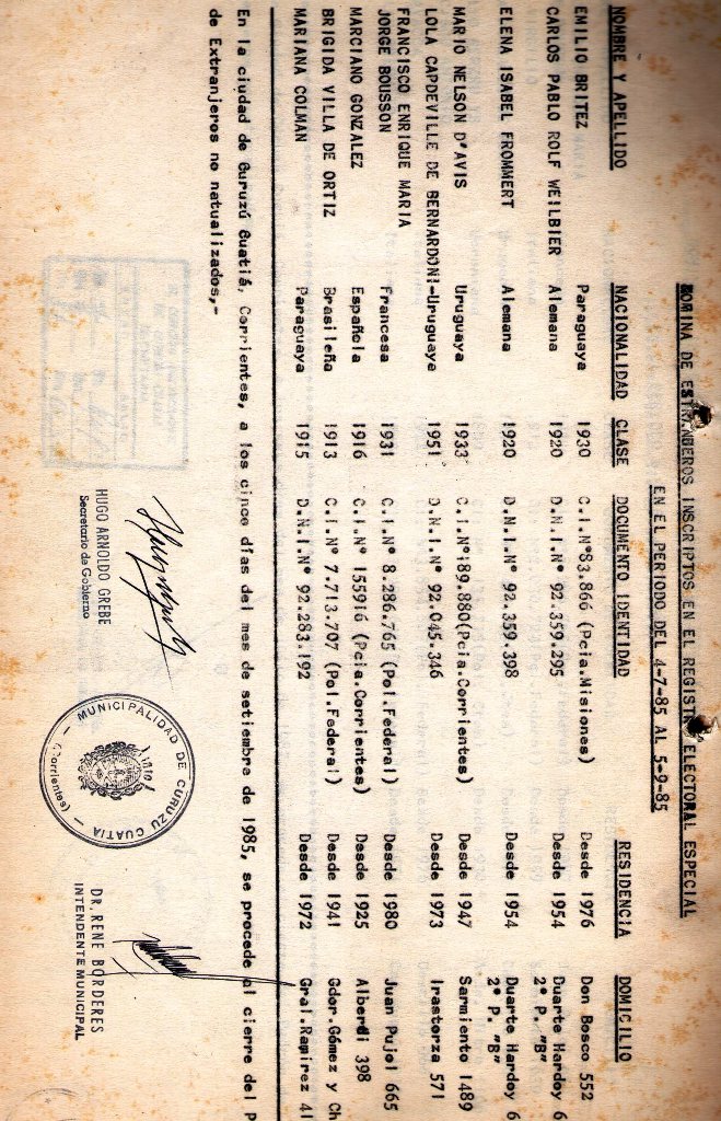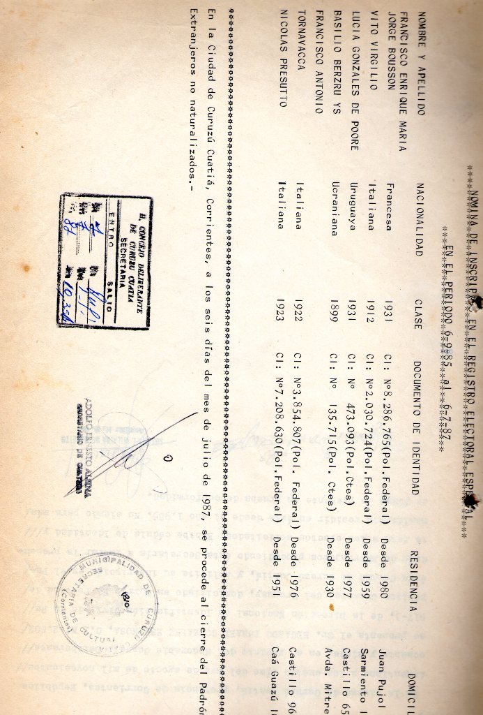 Art 7 °.- Los extranjeros podrán emitir su voto exhibiendo el documento con el que son identificados en el padrón respectivo, los extranjeros sufragaran en las mismas mesas y ante las mismas autoridades comiciales dispuestas para las elecciones generales del 6 de setiembre de 1.987, debiendo figurar en dichas mesas el padrón complementario de extranjeros (art. 112 de la Ley N° 2498).
