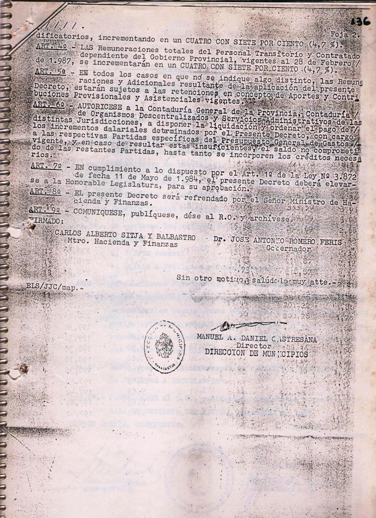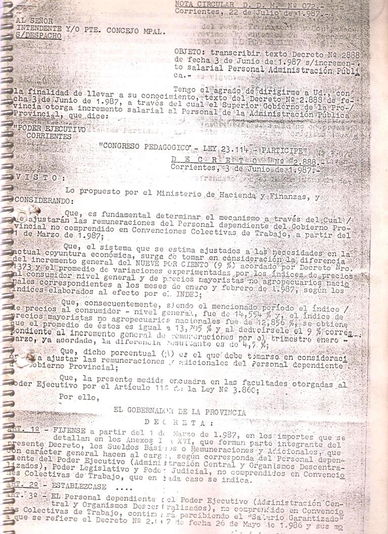 Art. 1°.- ADHIERASE esta Municipalidad a los términos del Decreto Provincial N° 2888/87, cuyo texto forma parte integrante de la presente, y que se refiere a incrementos de sueldos para el personal de la Administración Pública, a partir del 1° de Marzo de 1987, en los montos fijados para la Escala Única de Remuneraciones Anexo II aplicable a esta Comuna.