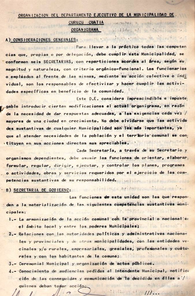 Art. 1°.- APRUEBASE, y pónese en vigencia provisoria, por el "término de ciento cincuenta días a partir de su promulgación, el REGLAMENTO DE ORGANIZACION DEL DEPARTAMENTO EJECUTIVO DE LA MUNICIPALIDAD DE CURUZÚ CUATIÁ, que se agrega en Anexos “I” y “II”, y forma parte de la presenten.