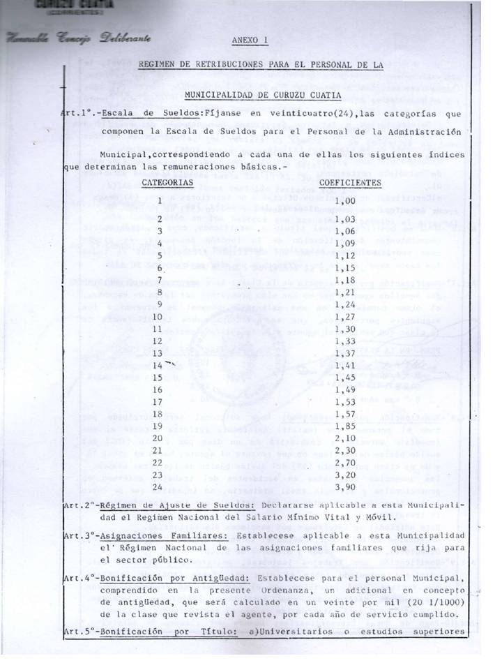 Art. 1°.- APRUEBASE el REGIMEN DE RETRIBUCIONES, para el Personal de la Municipalidad de Curuzú Cuatiá, cuyo Cuerpo forma parte como ANEXO I de la presente Ordenanza.-