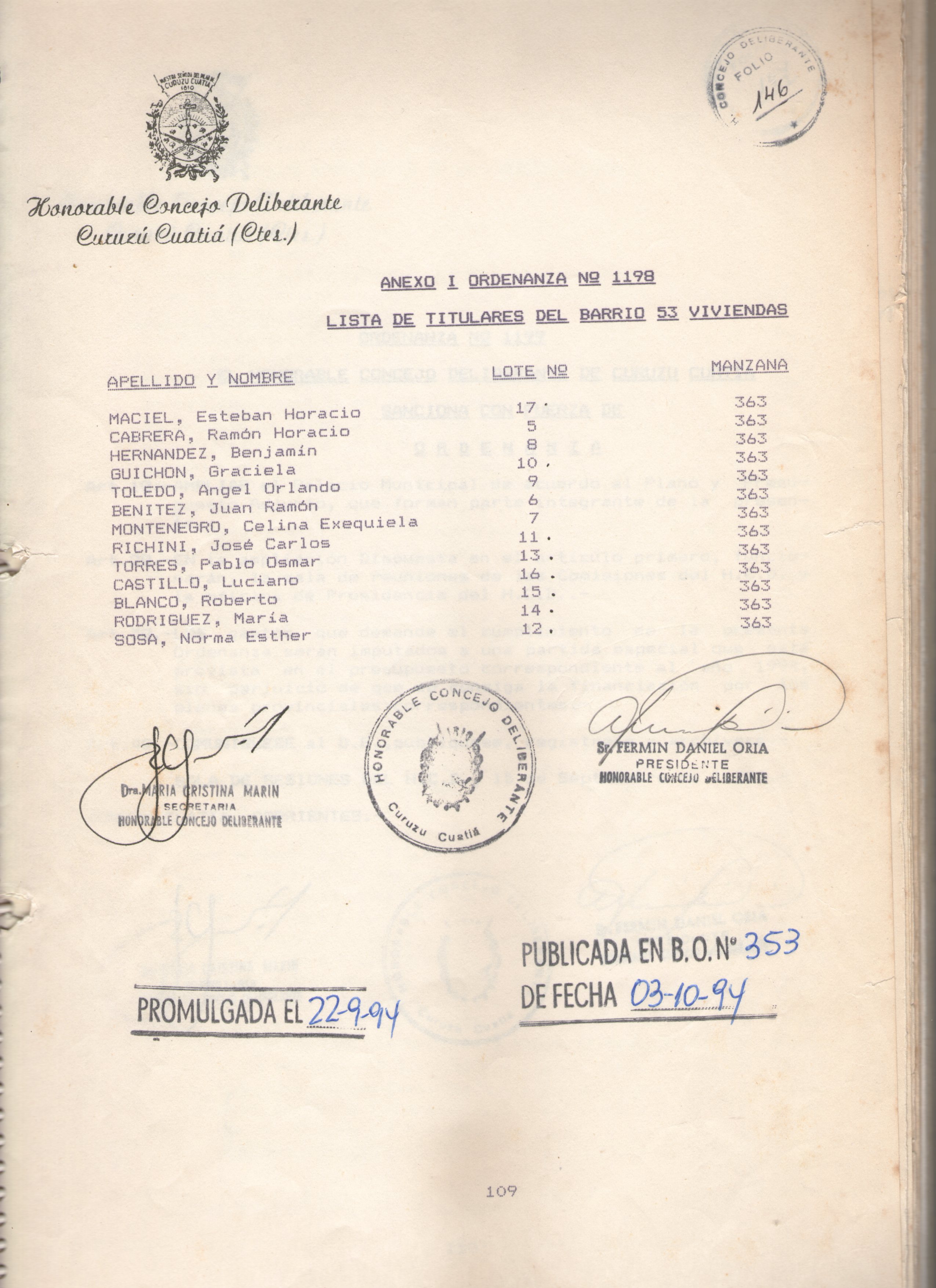 SALA DE SESIONES DEL H.C.D., 15 de Septiembre de 1.994.-
