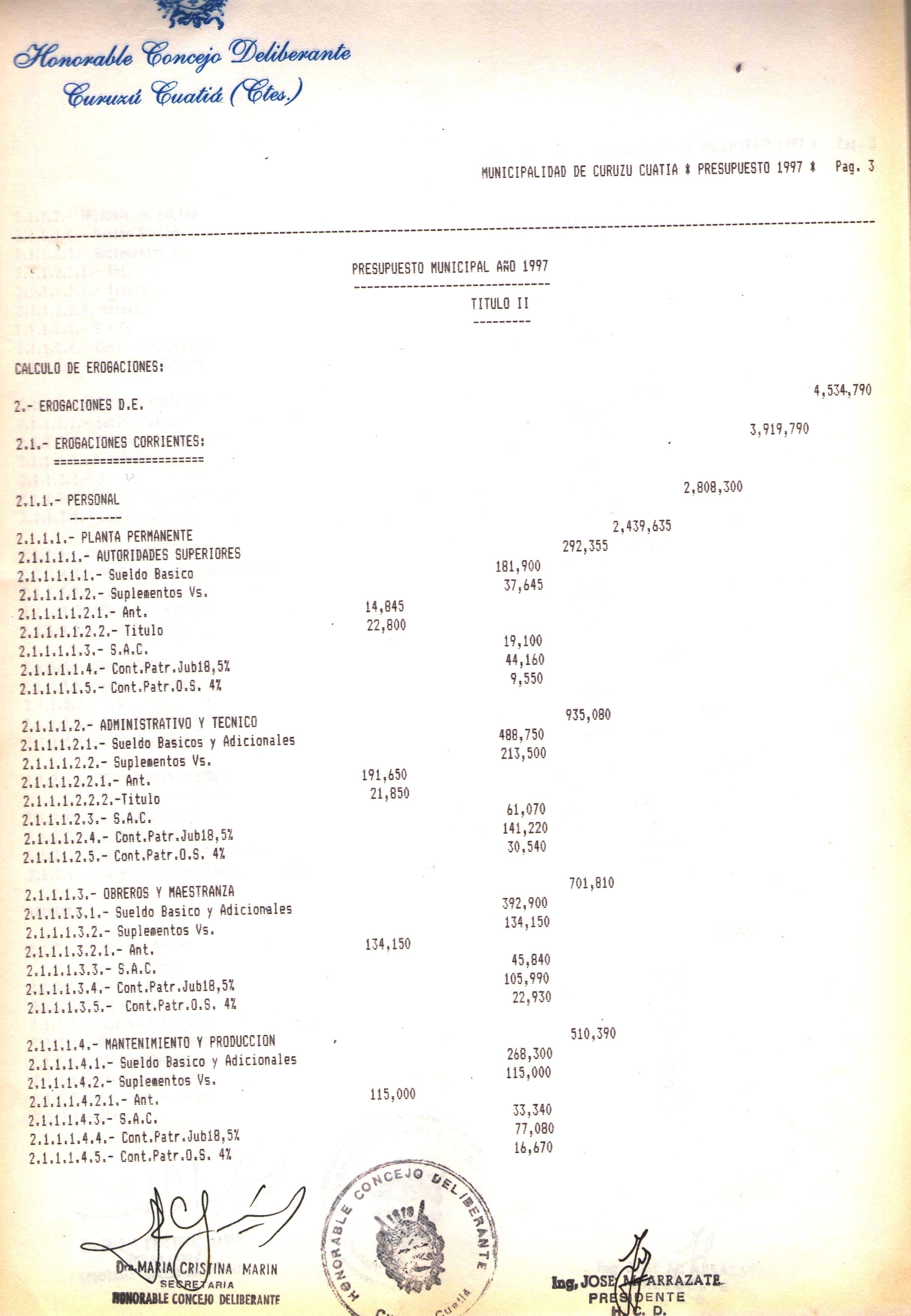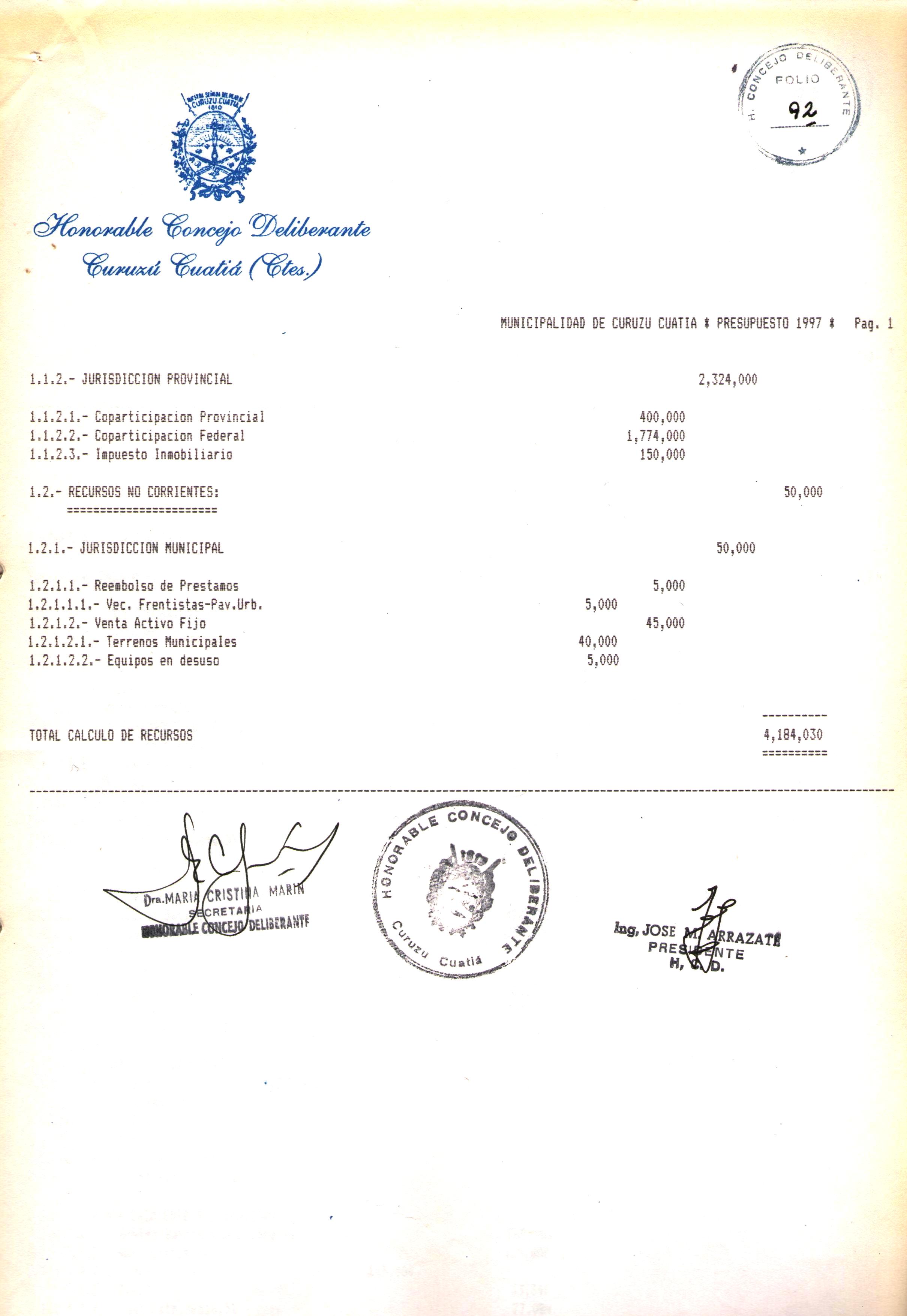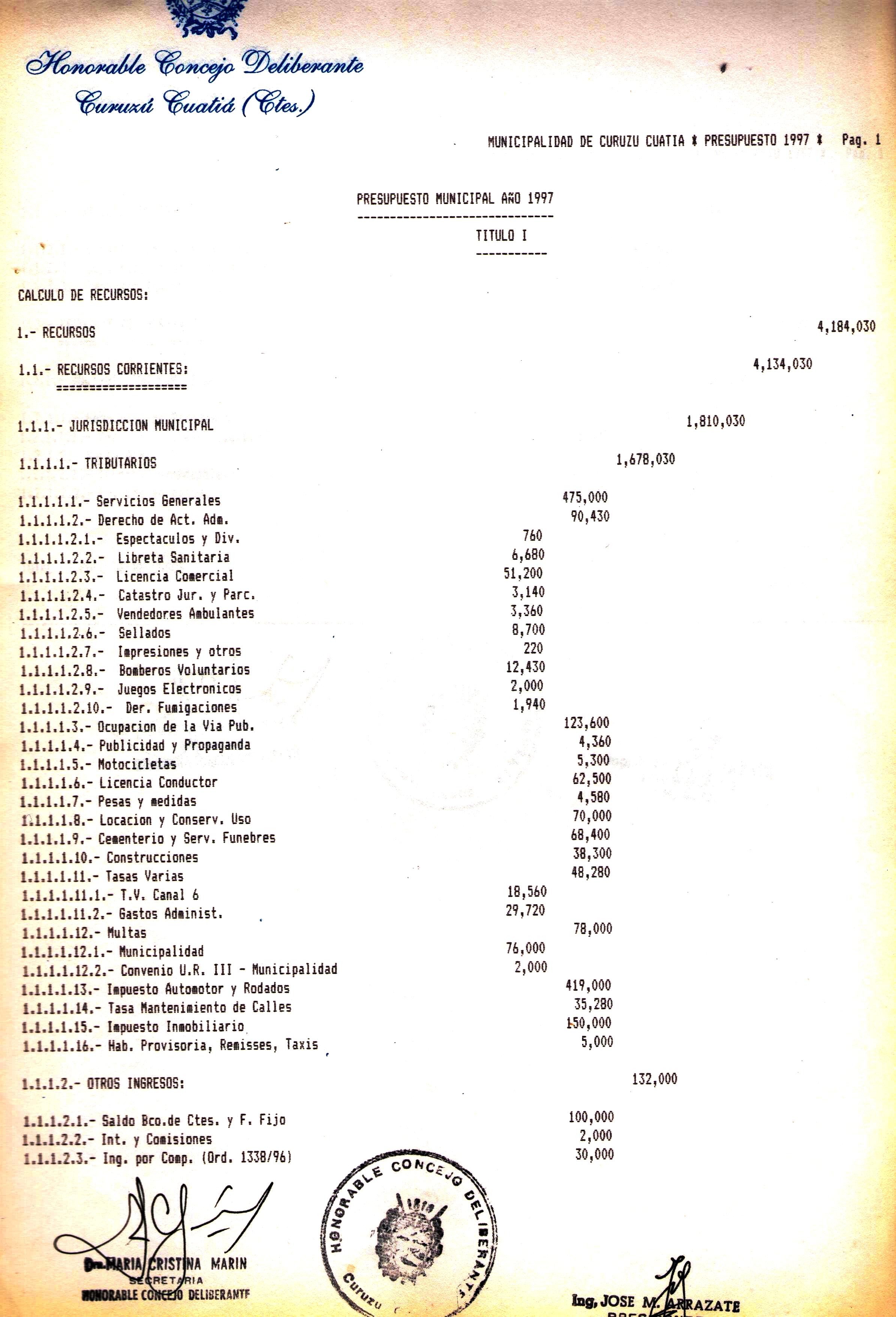 Art. 1º.- APRUEBASE el PRESUPUESTO GENERAL DE GASTOS Y CALCULO DE RECURSOS de la municipalidad de Curuzú Cuatiá correspondiente al año 1997, que Obran como ANEXOS I y II e integran la presente.-