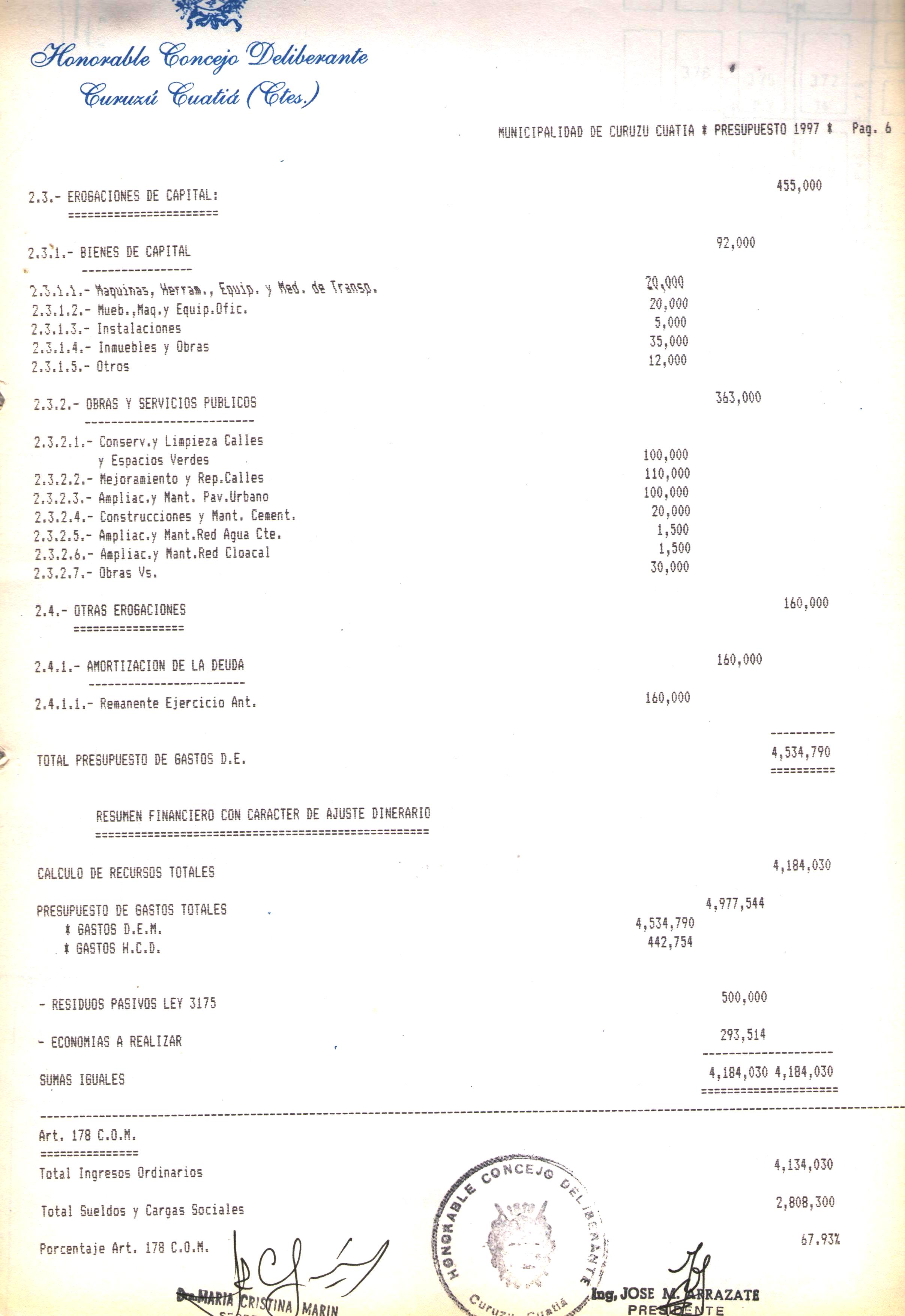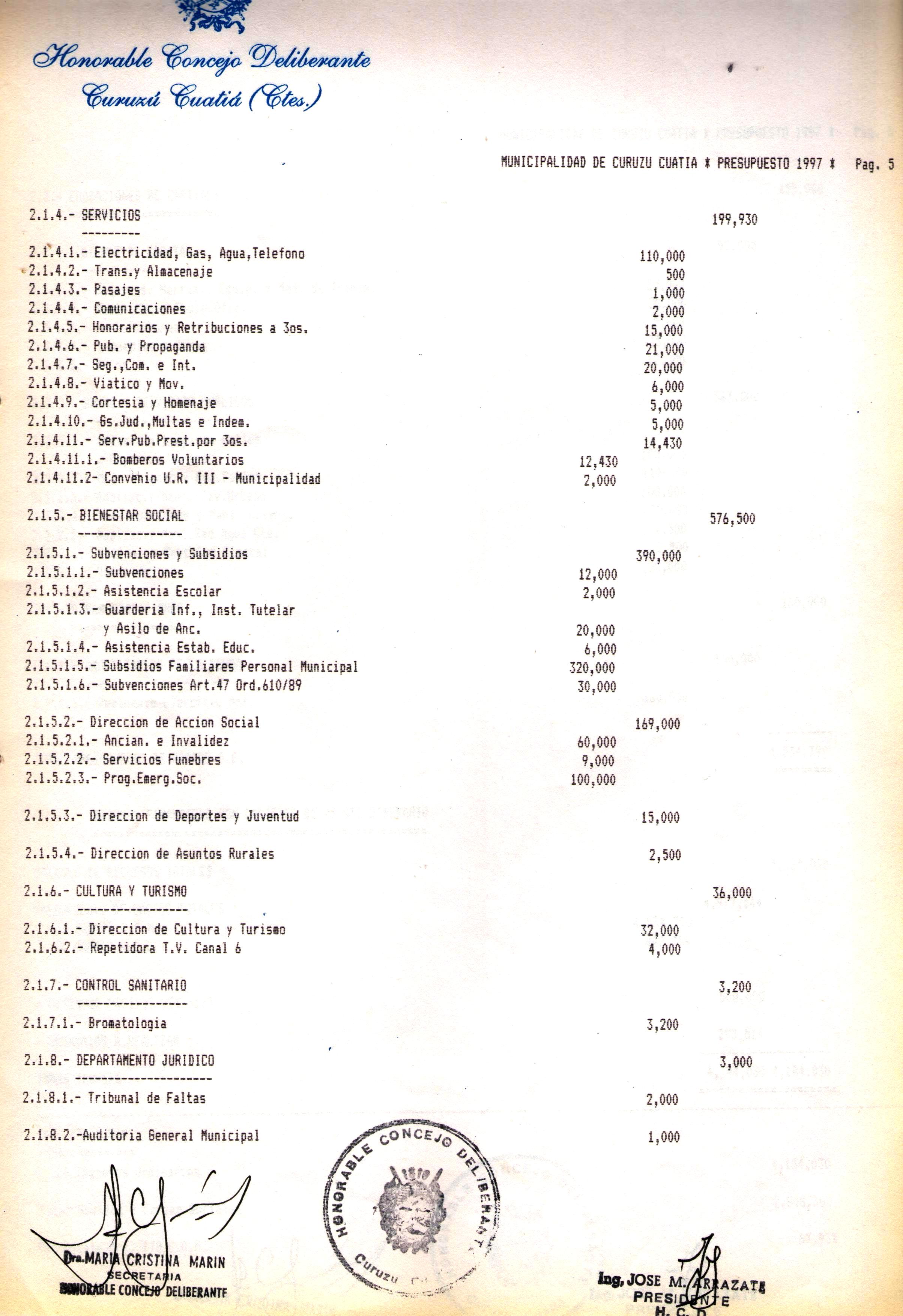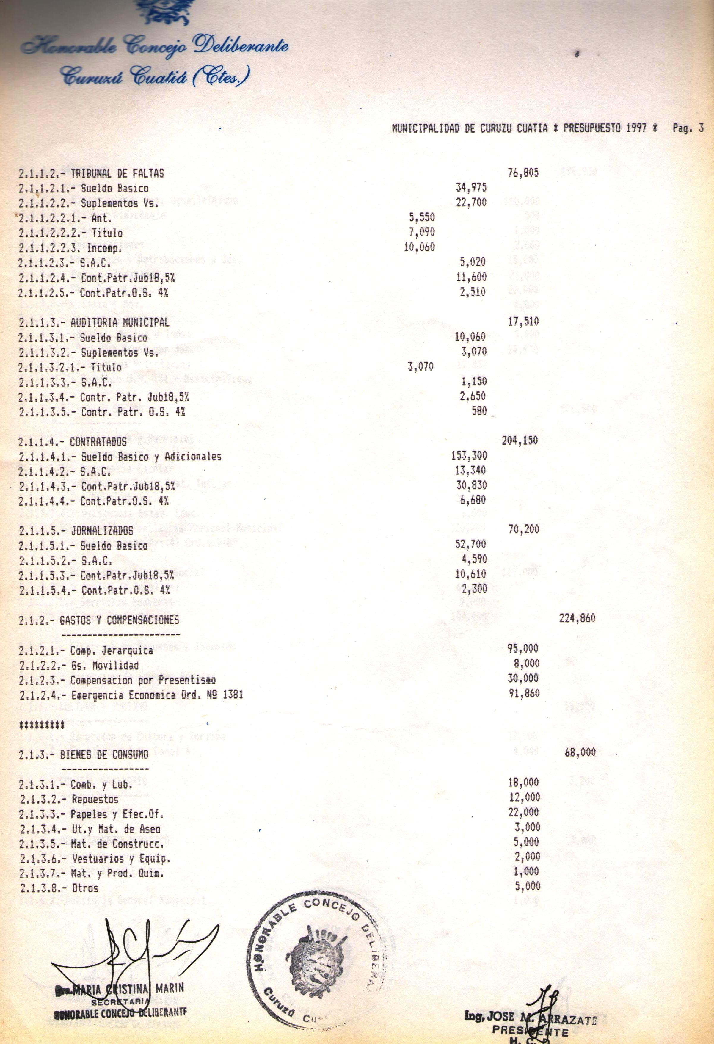 Art. 1º.- APRUEBASE el PRESUPUESTO GENERAL DE GASTOS Y CALCULO DE RECURSOS de la municipalidad de Curuzú Cuatiá correspondiente al año 1997, que Obran como ANEXOS I y II e integran la presente.-