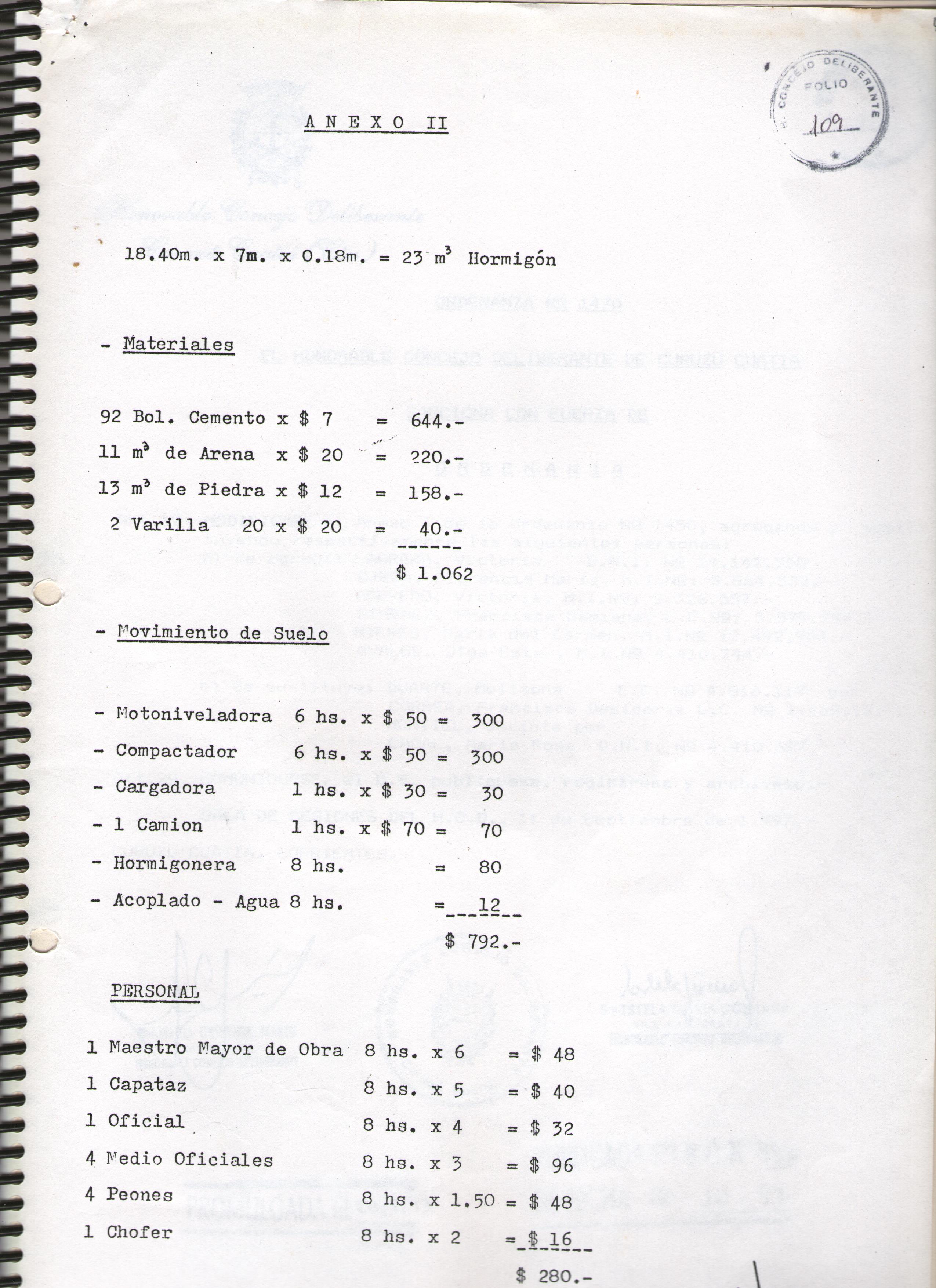 Art.2º.- APRUEBASE el cálculo de gastos presentado como anexo II y corre agregado para la ejecución de los trabajos mencionados en el artículo anterior.-