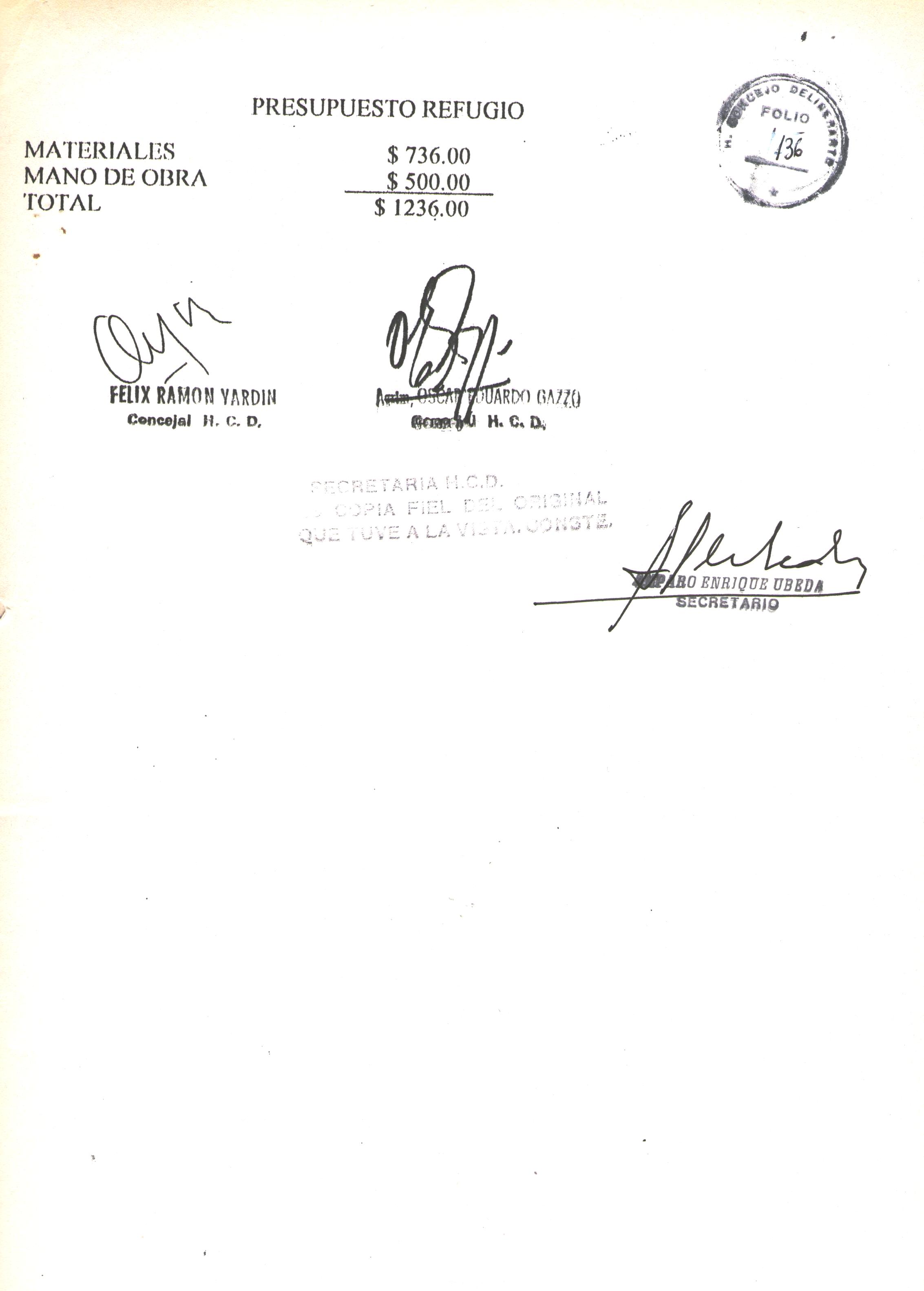 Art.2º.- IMPUTESE la suma de $1236.- correspondiente al presupuesto de materiales y mano de obra, que como anexo 1 integra la presente ordenanza, al Presupuesto del año 1999 del D.E.-