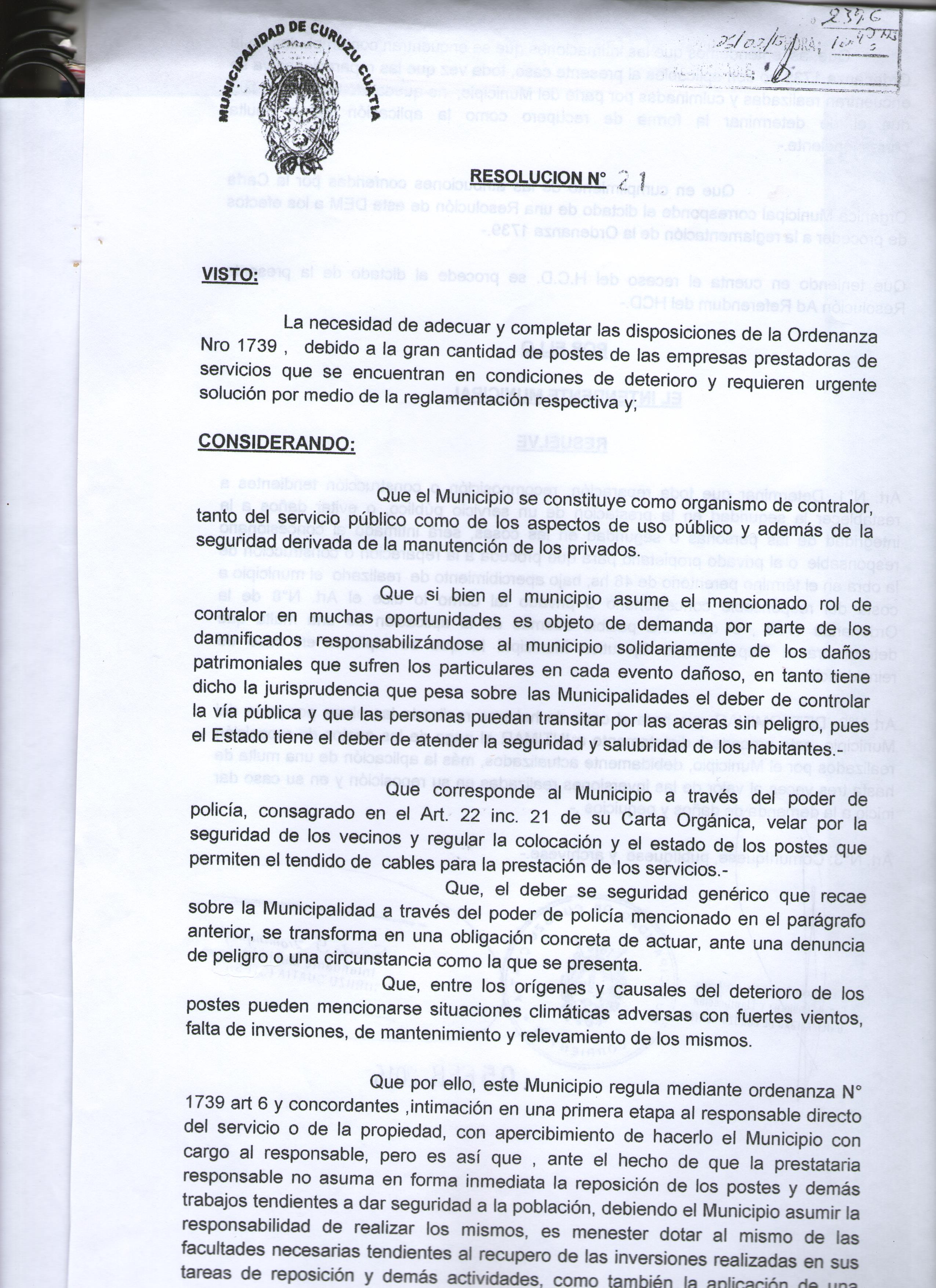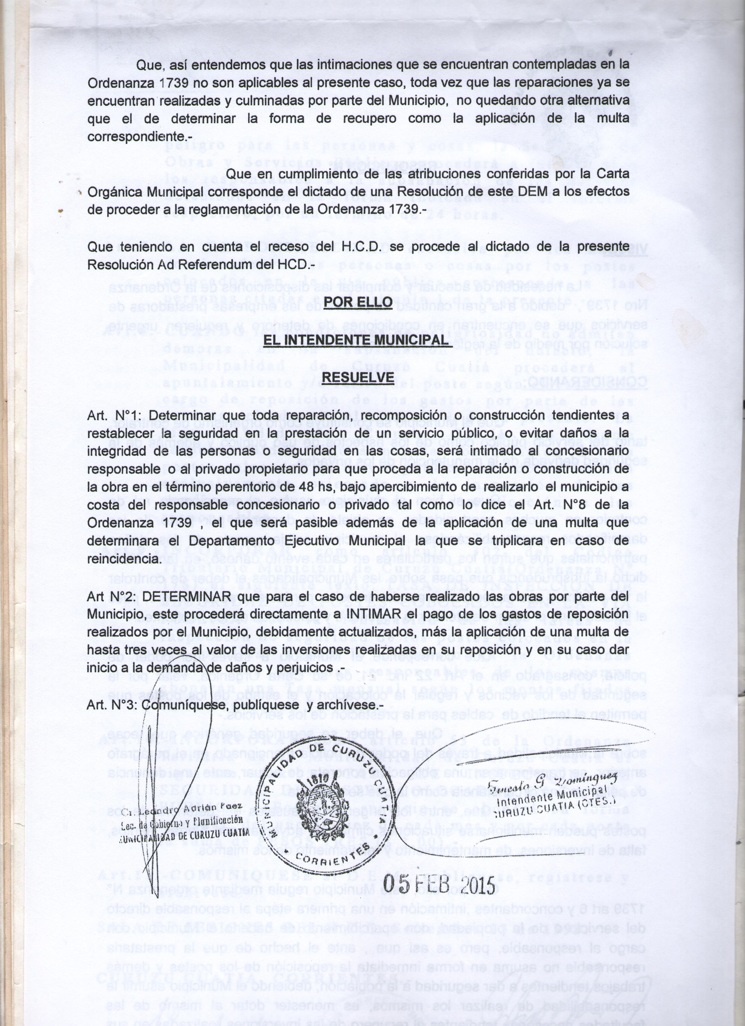 Art.5º.- LA MUNICIPALIDAD de Curuzú Cuatiá, por intermedio de la secretaría de obras y servicios Públicos, procederá a efectuar la inspección periódica sobre las condiciones de seguridad de los postes colocados en la vía publica.