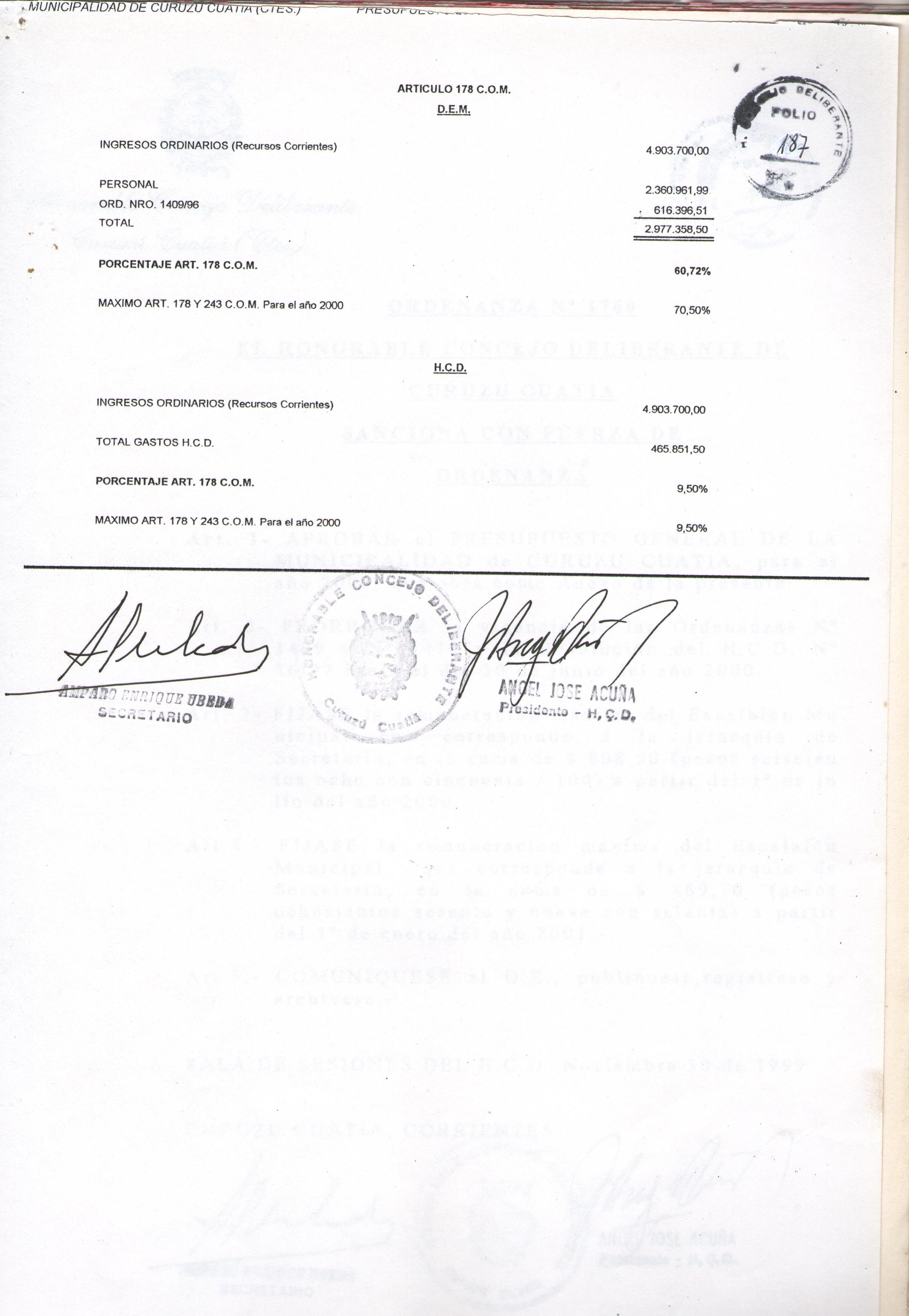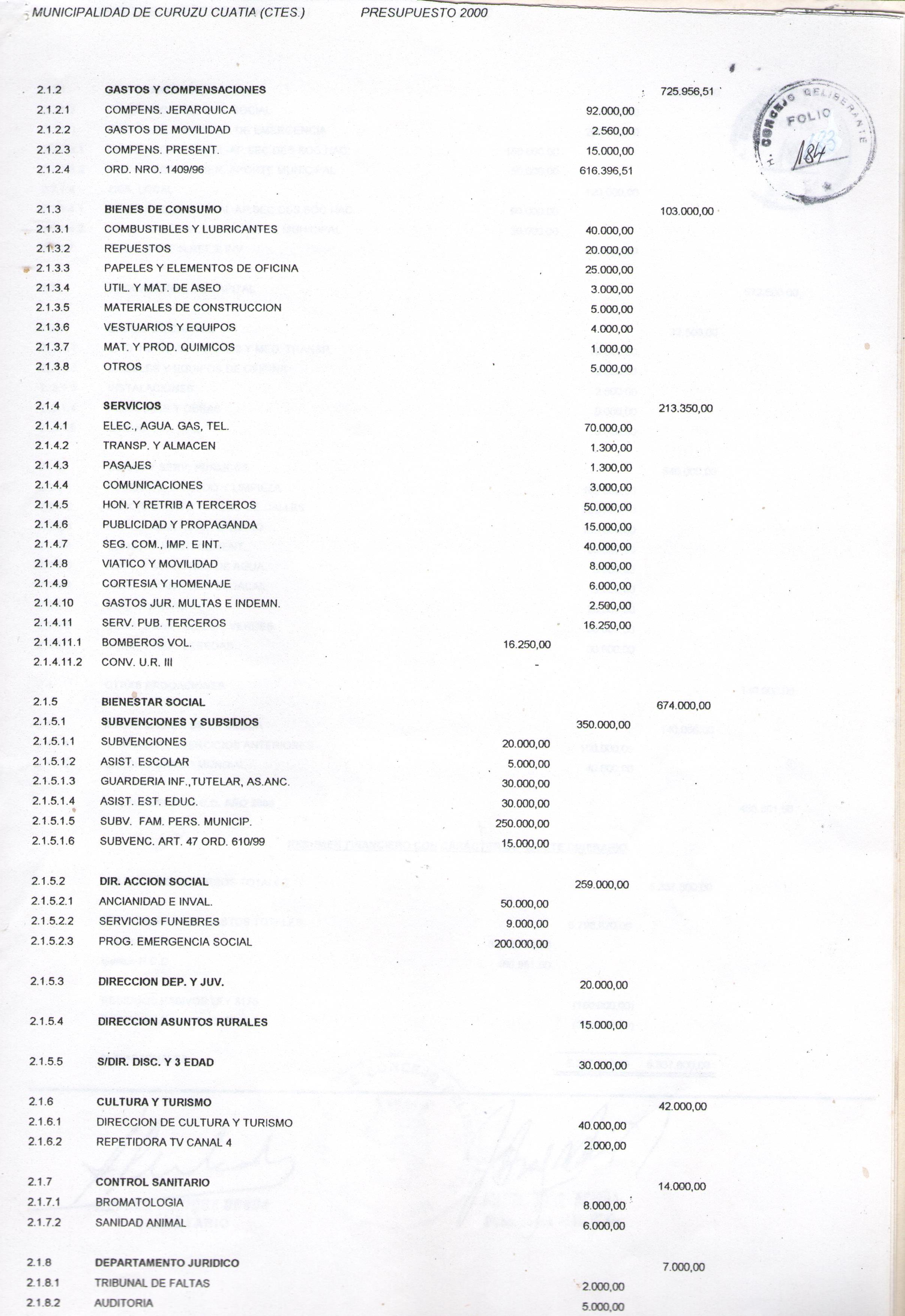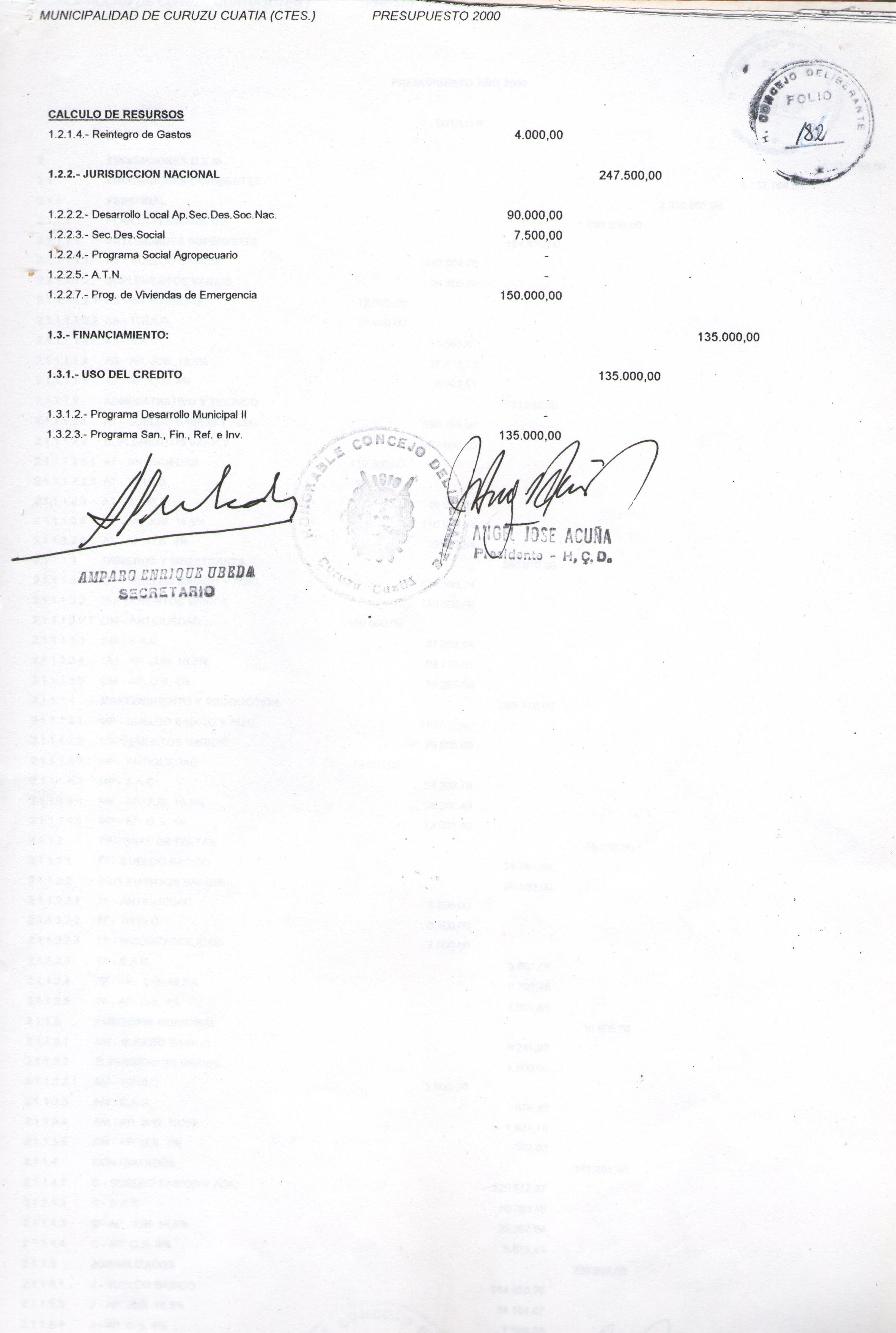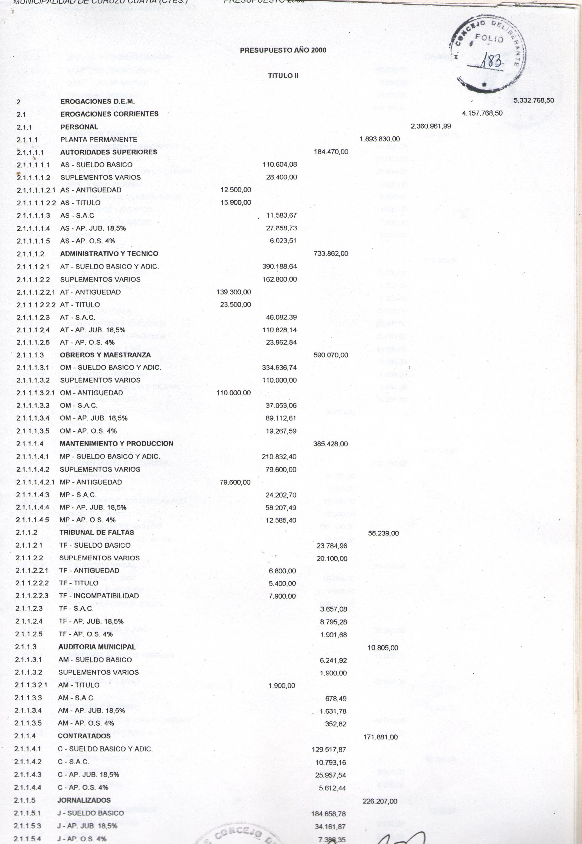 Art.1º.- APROBAR el PRESUPUESTO GENERAL DE LA MUNICIPALIDAD de CURUZU CUATAIA, para el año 2000, que obra como Anexo de la presente.
