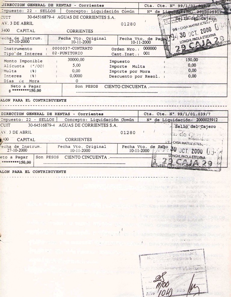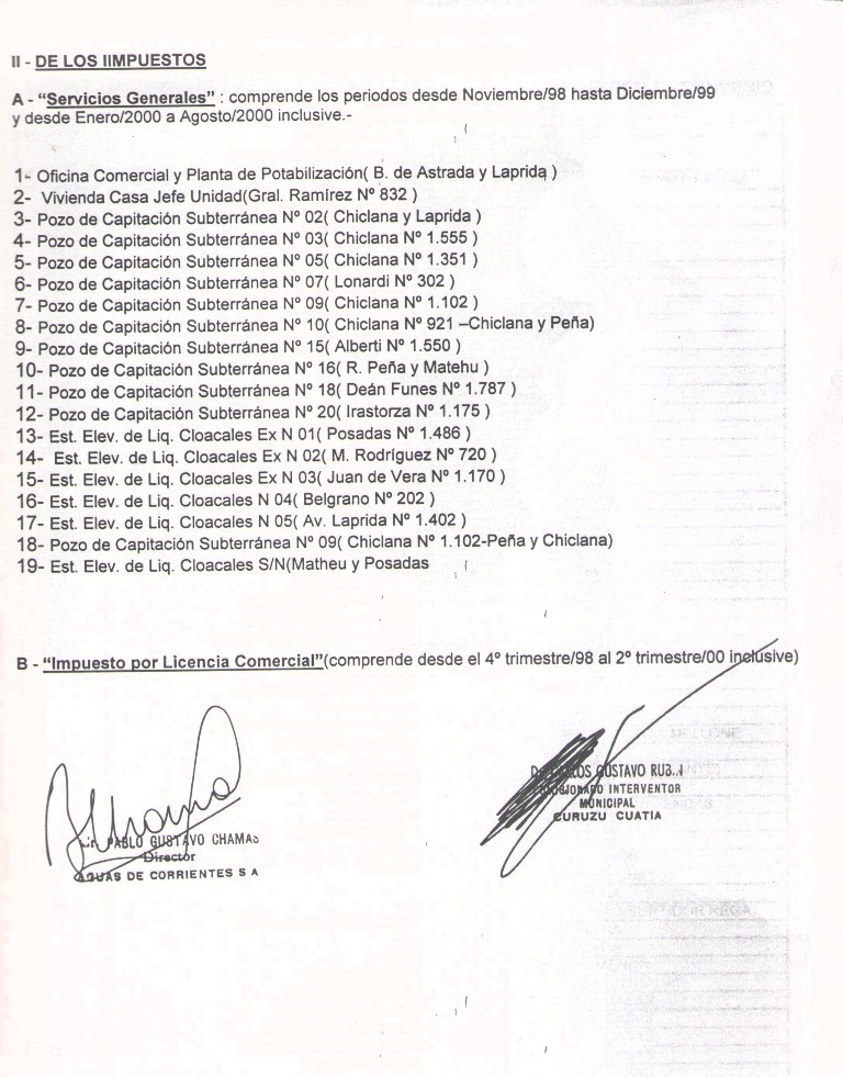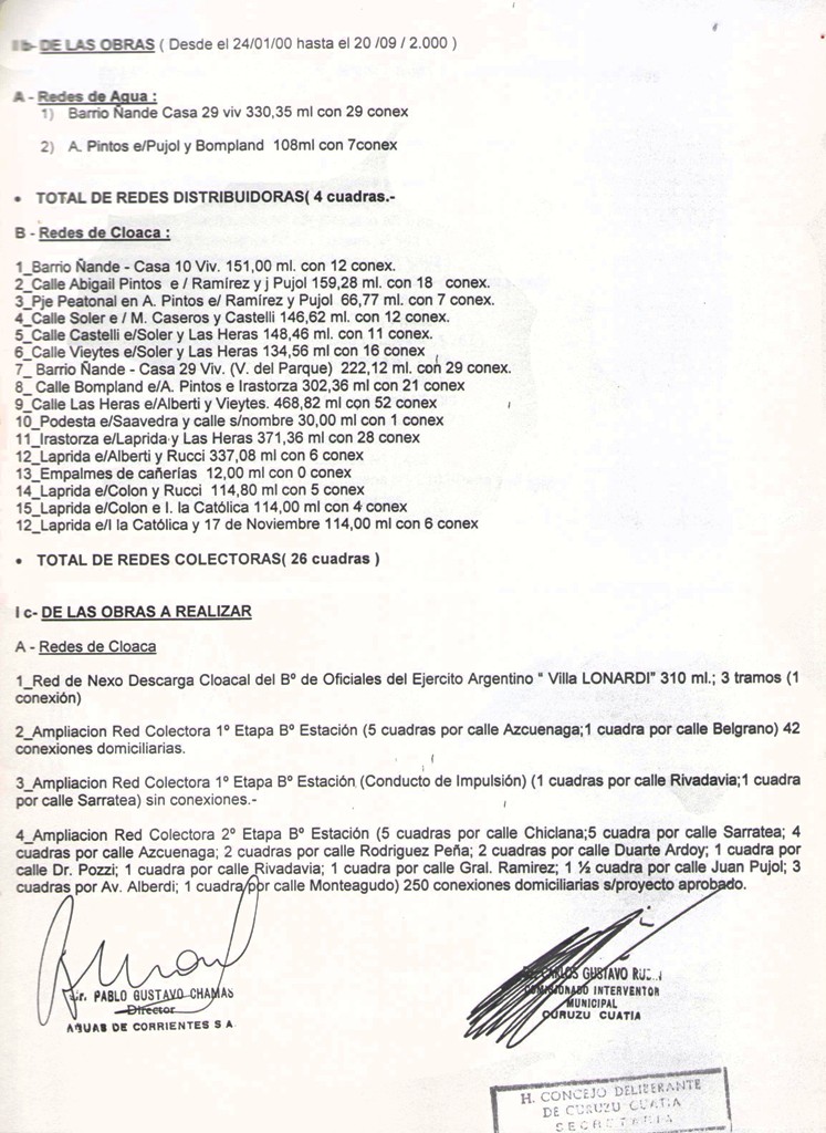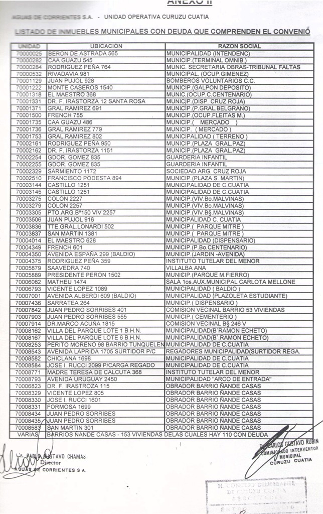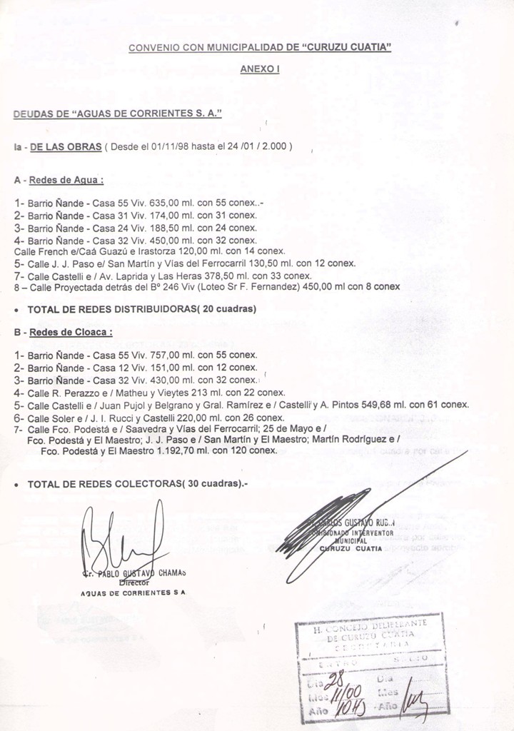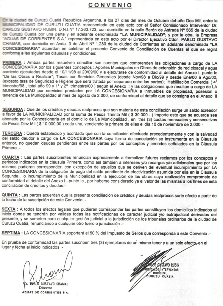 VISTO: El CONVENIO MUNICIPALIDAD DE CURUZU CUATIA - AGUAS DE CORRIENTES S.A. firmado el día 27 de octubre de 2000, por el SEÑOR COMISIONADO INTERVENTOR DE LA MUNICIPALIDAD DE CURUZU CUATIA, DR. CARLOS GUSTAVO RUBIN y el SEÑOR DIRECTOR EJECUTIVO DE AGUAS DE CORRIENTES S.A., CDOR. PABLO GUSTAVO CHAMAS y
