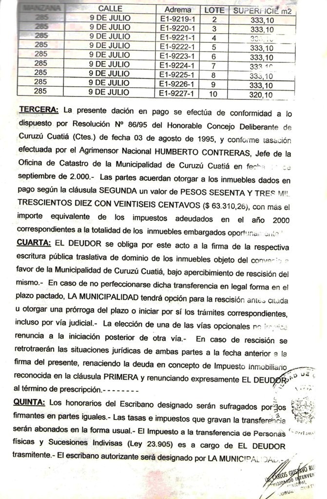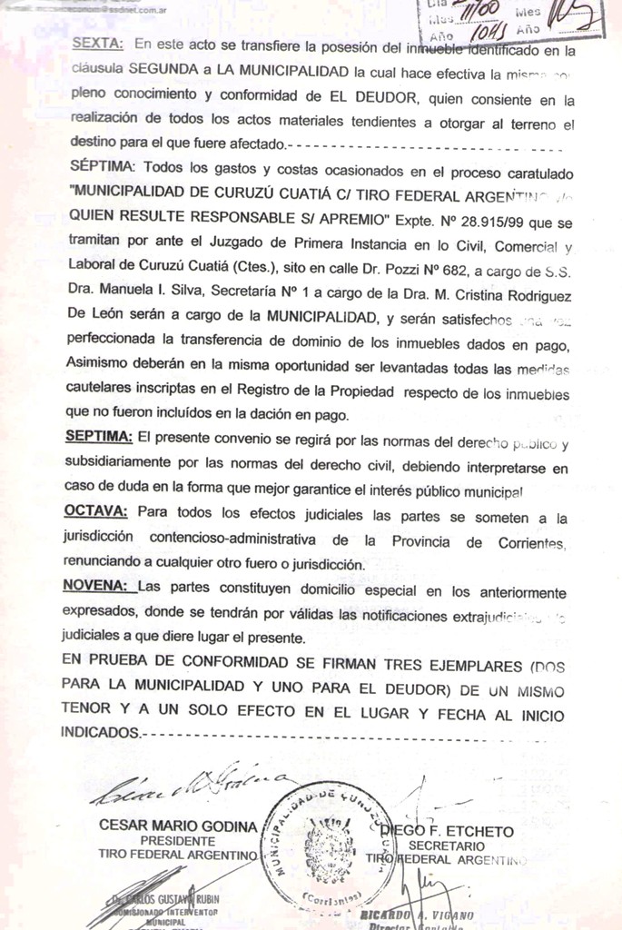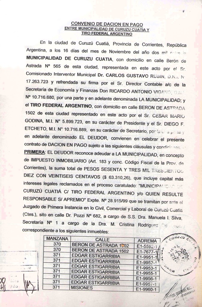 ORDENANZA Nº 1858 VISTO: El CONVENIO de DACION EN PAGO entre la MUNICIPALIDAD DE CURUZU CUATIA y el TIRO FEDERAL ARGENTINO, firmado el día 16 de noviembre de 2000, por el DR. CARLOS GUSTAVO RUBIN y el SEÑOR RICARDO ANTONIO VIGANO, COMISIONADO INTERVENTOR Y SECRETARIO DE ECONOMIA Y FINANZAS DE LA MUNICIPALIDAD DE CURUZU CUATIA respectivamente, y los SEÑORES CESAR MARIO GODINA y DIEGO F. ETCHETO, PRESIDENTE y SECRETARIO DEL TIRO FEDERAL ARGENTINO y CONSIDERANDO: Que es necesario proceder a HOMOLOGAR el mencionado CONVENIO. POR ELLO EL COMISIONADO INTERVENTOR EN ACUERDO DE SECRETARNOS RESUELVE CON FUERZA DE ORDENANZA ART.1º: HOMOLOGAR el CONVENIO de DACION EN PAGO entre la MUNICIPALIDAD DE CURUZU CUATIA y el TIRO FEDERAL ARGENTINO, firmado el día 16 de noviembre de 2000, por el DR. CARLOS GUSTAVO RUBIN y el SEÑOR RICARDO ANTONIO VIGANO, COMISIONADO INTERVENTOR Y SECRETARIO DE ECONOMIA Y FINANZAS DE LA MUNICIPALIDAD DE CURUZU CUATIA respectivamente, y los SEÑORES CESAR MARIO GODINA y DIEGO F. ETCHETO, PRESIDENTE y SECRETARIO DEL TIRO FEDERAL ARGENTINO, el cual se incorpora como anexo de la presente, formando parte integrante de la misma. ART.2º: Comuníquese, publíquese, regístrese y archívese. CURUZU CUATIA, 23 DE NOVIEMBRE 2000