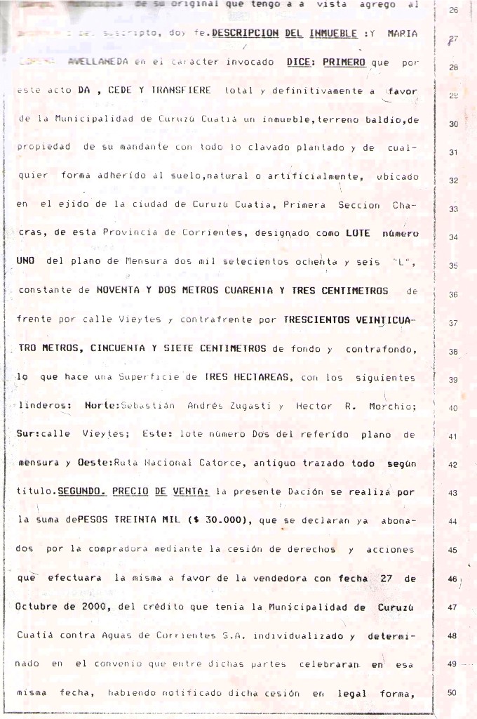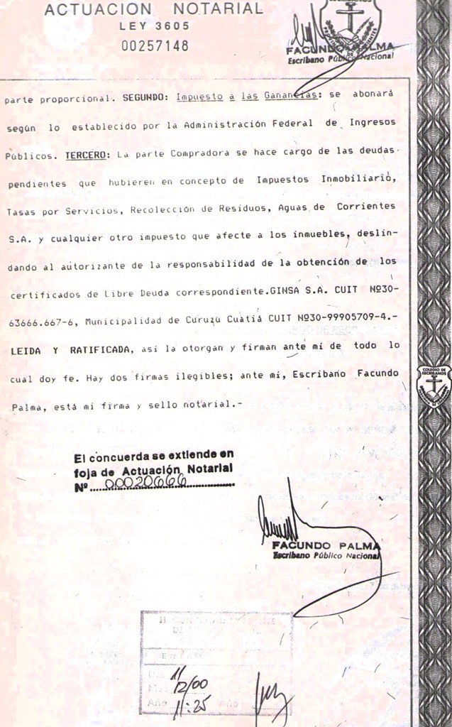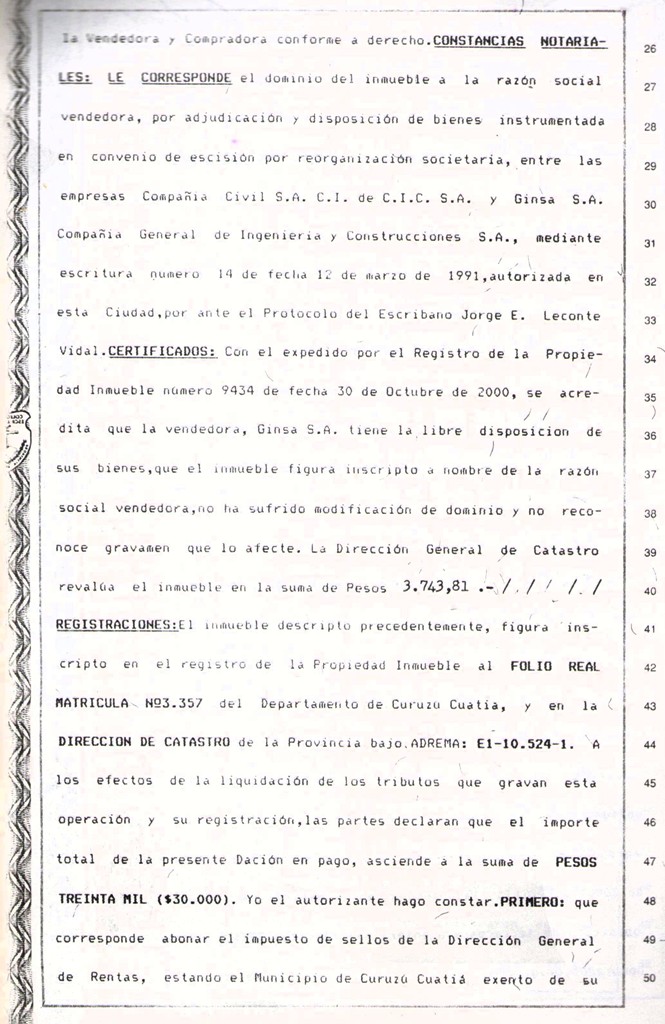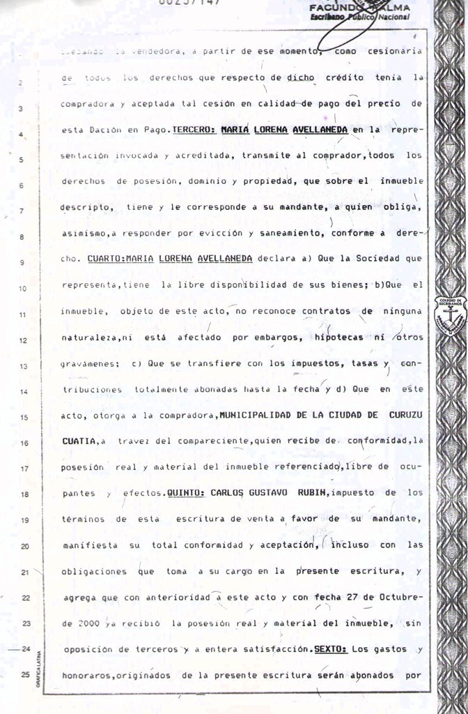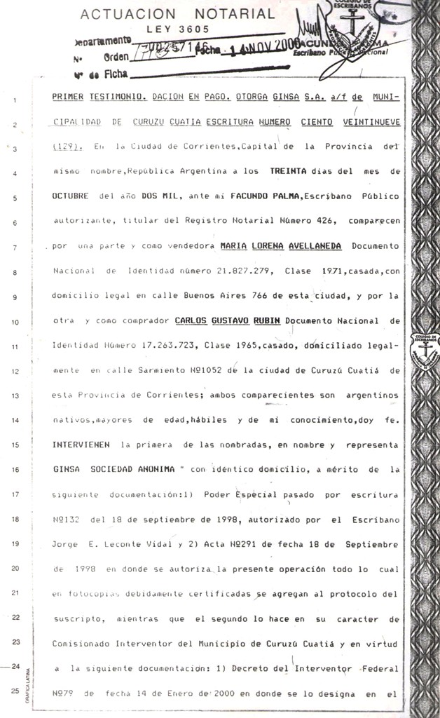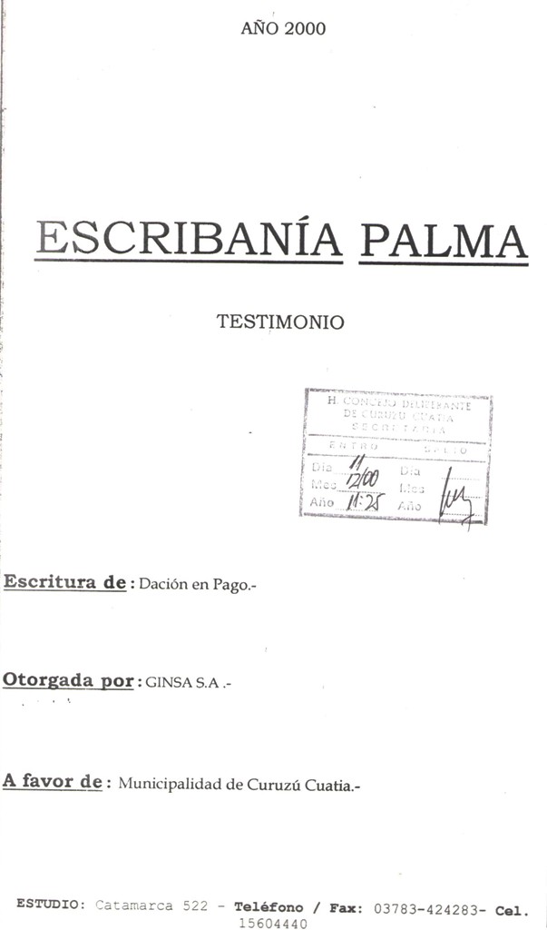 VISTO: El Convenio de DACION EN PAGO entre la MUNICIPALIDAD DE CURUZU CUATIA y la Empresa GINSA S.A., firmado el 30 de Octubre de 2000, por el Dr. CARLOS GUSTAVO RUBIN, Comisionado Interventor de la Municipalidad de Curuzú Cuatiá y la señora MARIA LORENA AVELLANDA en representación de la Empesa GINSA S.A.; y
