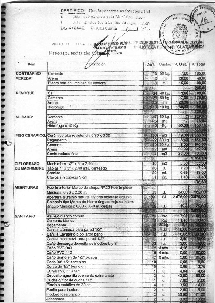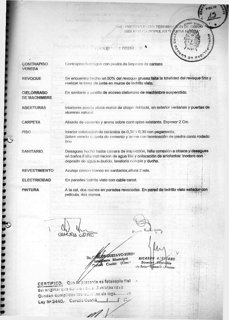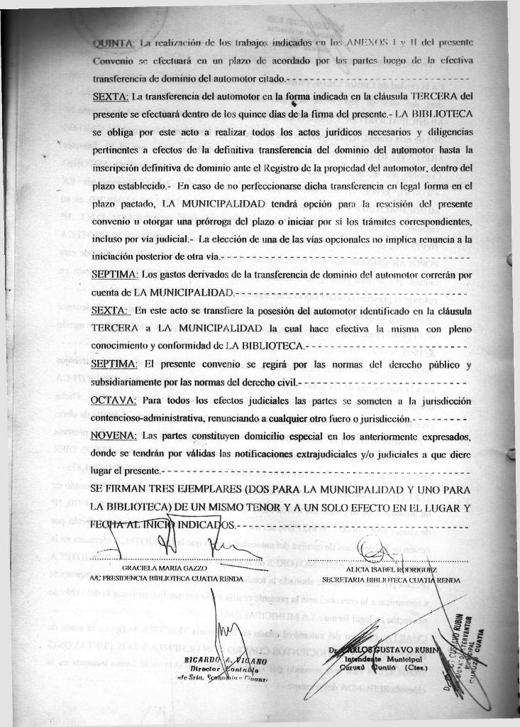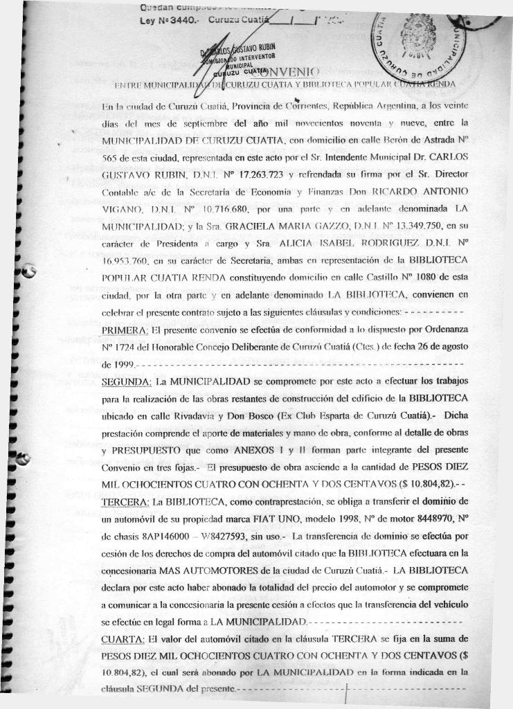 La ORDENANZA N° 1724 y el CONVENIO firmado el día 20 de septiembre de 1999 entre la MUNICIPALIDAD DE CURUZU CUATIA y LA BIBLIOTECA POPULAR CUATIA RENDA: representadas por el SEÑOR INTENDENTE MUNICIPAL DE CURUZU CUATIA. DR CARLOS GUSTAVO RUBIN y la SEÑORA PRESIDENTA DE LA BIBLIOTECA POPULAR CUATIA RENDA, ARQUITECTA GRACIELA MARIA GAZZO y
