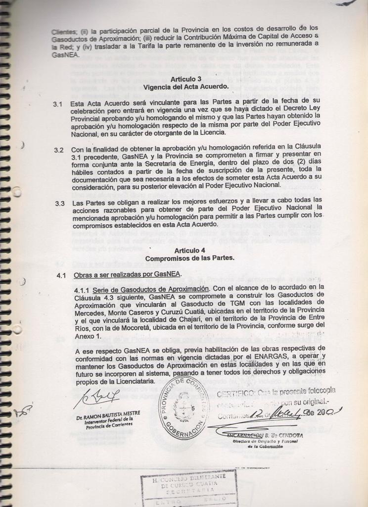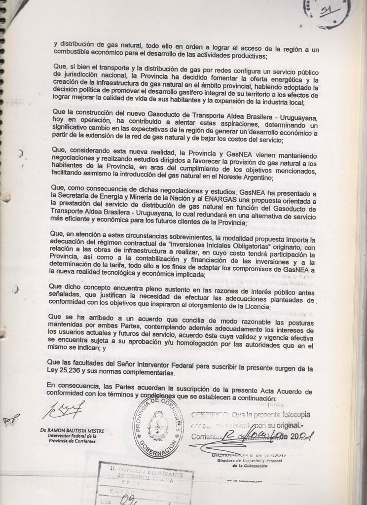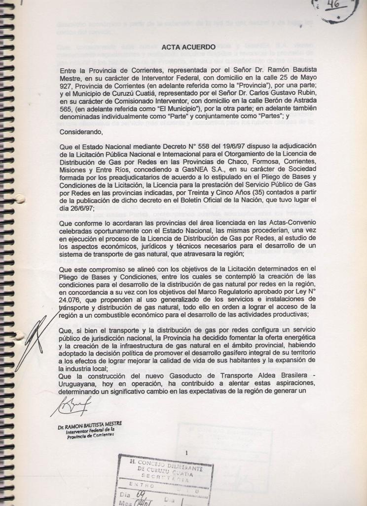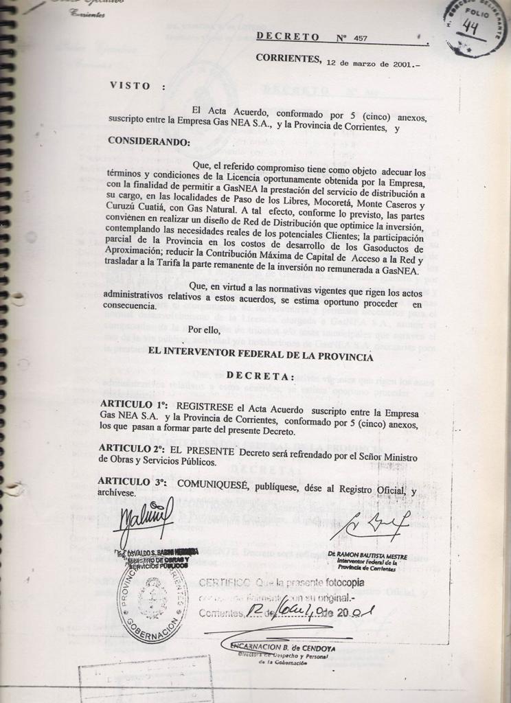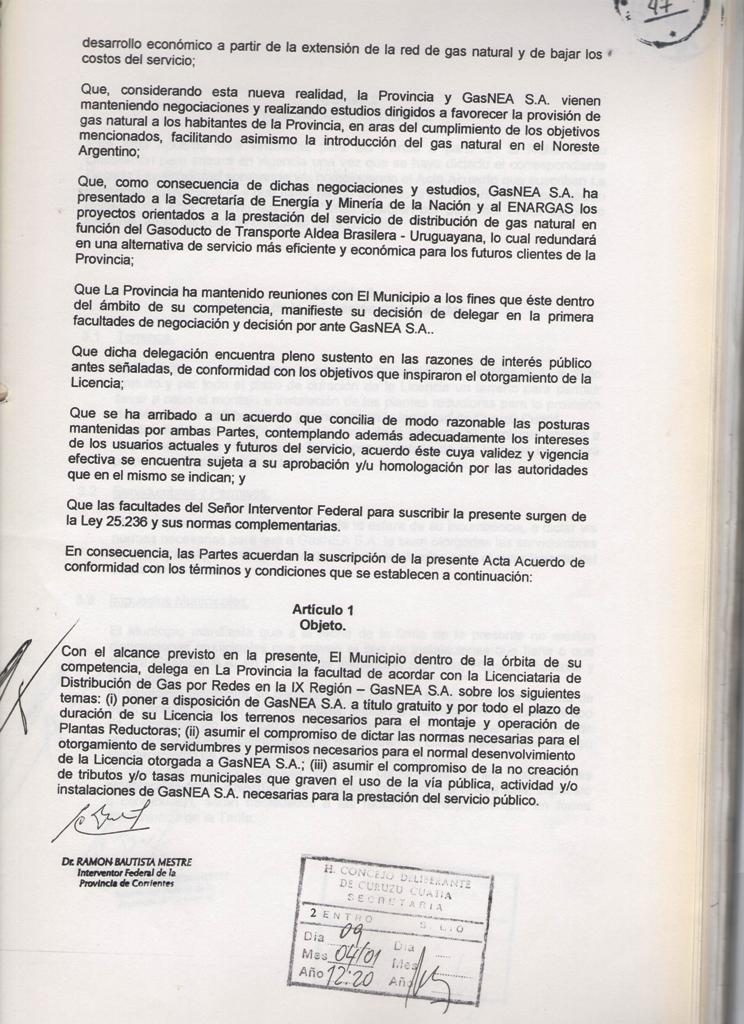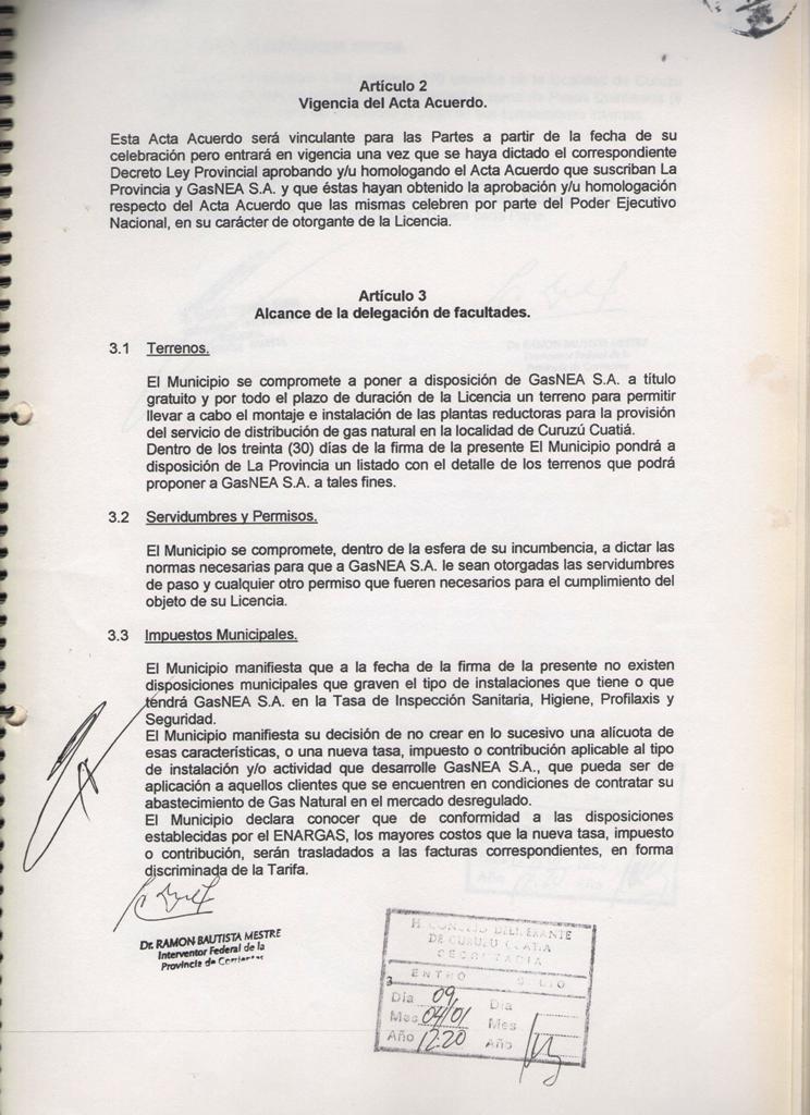 El Acta acuerdo suscripto entre la MUNICIPALIDAD DE CURUZU CUATIA y el SUPERIOR GOBIERNO DE LA PROVINCIA DE CORRIENTES, registrado en fecha 12 de Marzo de 2001, mediante Decreto Provincial No 460; referido a las obras de GAS NATURAL para nuestra ciudad y la MICROREGION del SUR CORRENTINO; CONSIDERANDO: Que dicho es complementario del suscripto entre el SUPERIOR GOBIERNO DE LA PROVINCIA DE CORRIENTES y la firma GAS NEA, registrado por Decreto Provincial No 457 de la misma fecha; Que mediante estos acuerdos se establecen las condiciones técnicas y económicas para las obras de abastecimiento de GAS NATURAL a nuestra zona, las cuales significan contar con energía barata y de buena calidad; nuevas fuentes de mano de obra y mayor desarrollo integral de la región; POR ELLO EL COMISIONADO INTERVENTOR EN ACUERDO DE SECRETARIOS RESUELVE CON FUERZA DE ORDENANZA ARTICULO l: HOMOLOGAR el acuerdo suscripto por el Señor COMISIONADO INTERVENTOR MUNICIPAL y el Señor INTERVENTOR FEDERAL DE LA PROVINCIA DE CORRIENTES en fecha 09 de Marzo de 2001; en referencia a las obras de abastecimiento de GAS NATURAL para la ciudad de CURUZU CUATIA y la región , cuyo texto autenticado forma parte de la presente.- ARTICULO 2: COMUNIQUESE, regístrese y archívese.- CURUZU CUATIA, 09 de abril de 2001.-