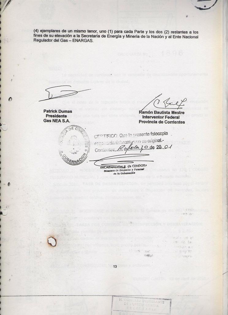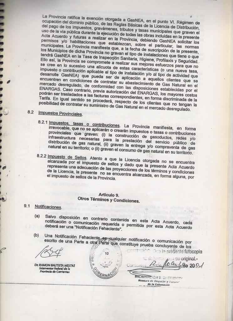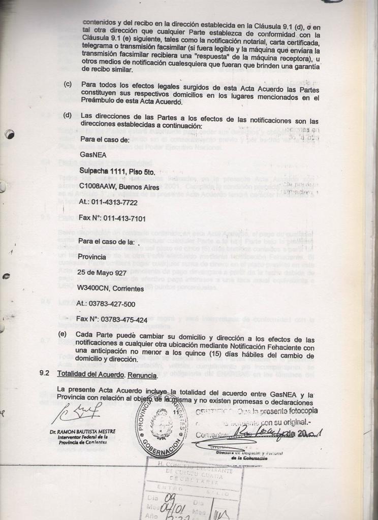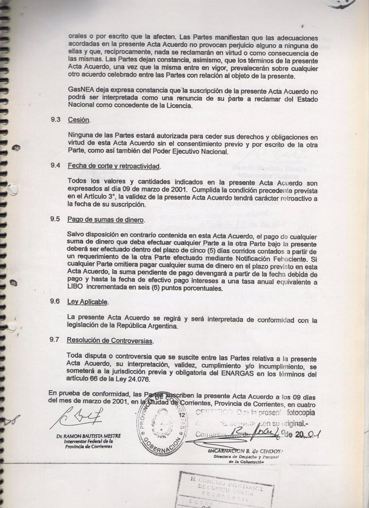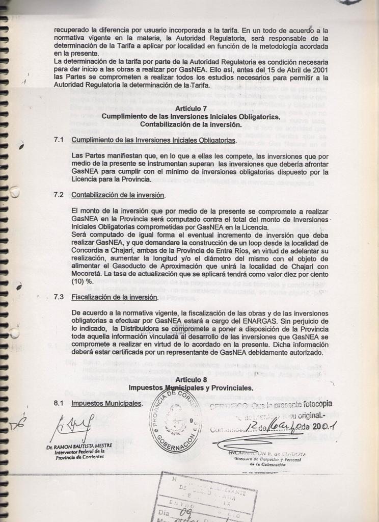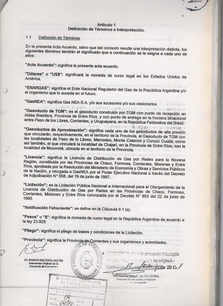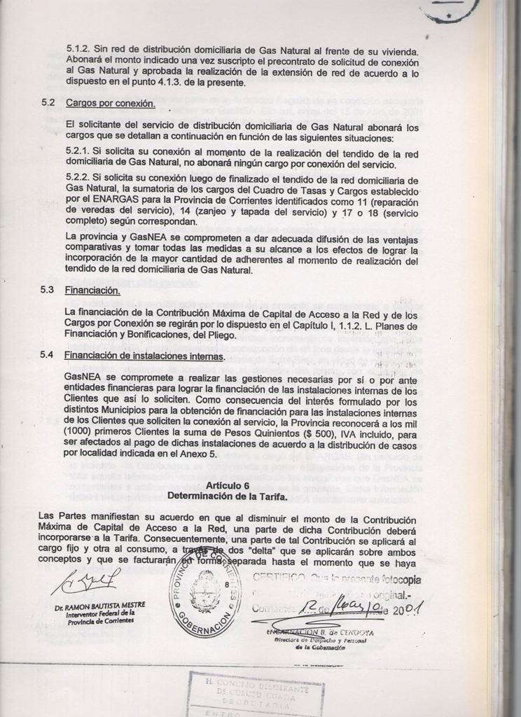 El Acta acuerdo suscripto entre la MUNICIPALIDAD DE CURUZU CUATIA y el SUPERIOR GOBIERNO DE LA PROVINCIA DE CORRIENTES, registrado en fecha 12 de Marzo de 2001, mediante Decreto Provincial No 460; referido a las obras de GAS NATURAL para nuestra ciudad y la MICROREGION del SUR CORRENTINO; CONSIDERANDO: Que dicho es complementario del suscripto entre el SUPERIOR GOBIERNO DE LA PROVINCIA DE CORRIENTES y la firma GAS NEA, registrado por Decreto Provincial No 457 de la misma fecha; Que mediante estos acuerdos se establecen las condiciones técnicas y económicas para las obras de abastecimiento de GAS NATURAL a nuestra zona, las cuales significan contar con energía barata y de buena calidad; nuevas fuentes de mano de obra y mayor desarrollo integral de la región; POR ELLO EL COMISIONADO INTERVENTOR EN ACUERDO DE SECRETARIOS RESUELVE CON FUERZA DE ORDENANZA ARTICULO l: HOMOLOGAR el acuerdo suscripto por el Señor COMISIONADO INTERVENTOR MUNICIPAL y el Señor INTERVENTOR FEDERAL DE LA PROVINCIA DE CORRIENTES en fecha 09 de Marzo de 2001; en referencia a las obras de abastecimiento de GAS NATURAL para la ciudad de CURUZU CUATIA y la región , cuyo texto autenticado forma parte de la presente.- ARTICULO 2: COMUNIQUESE, regístrese y archívese.- CURUZU CUATIA, 09 de abril de 2001.-
