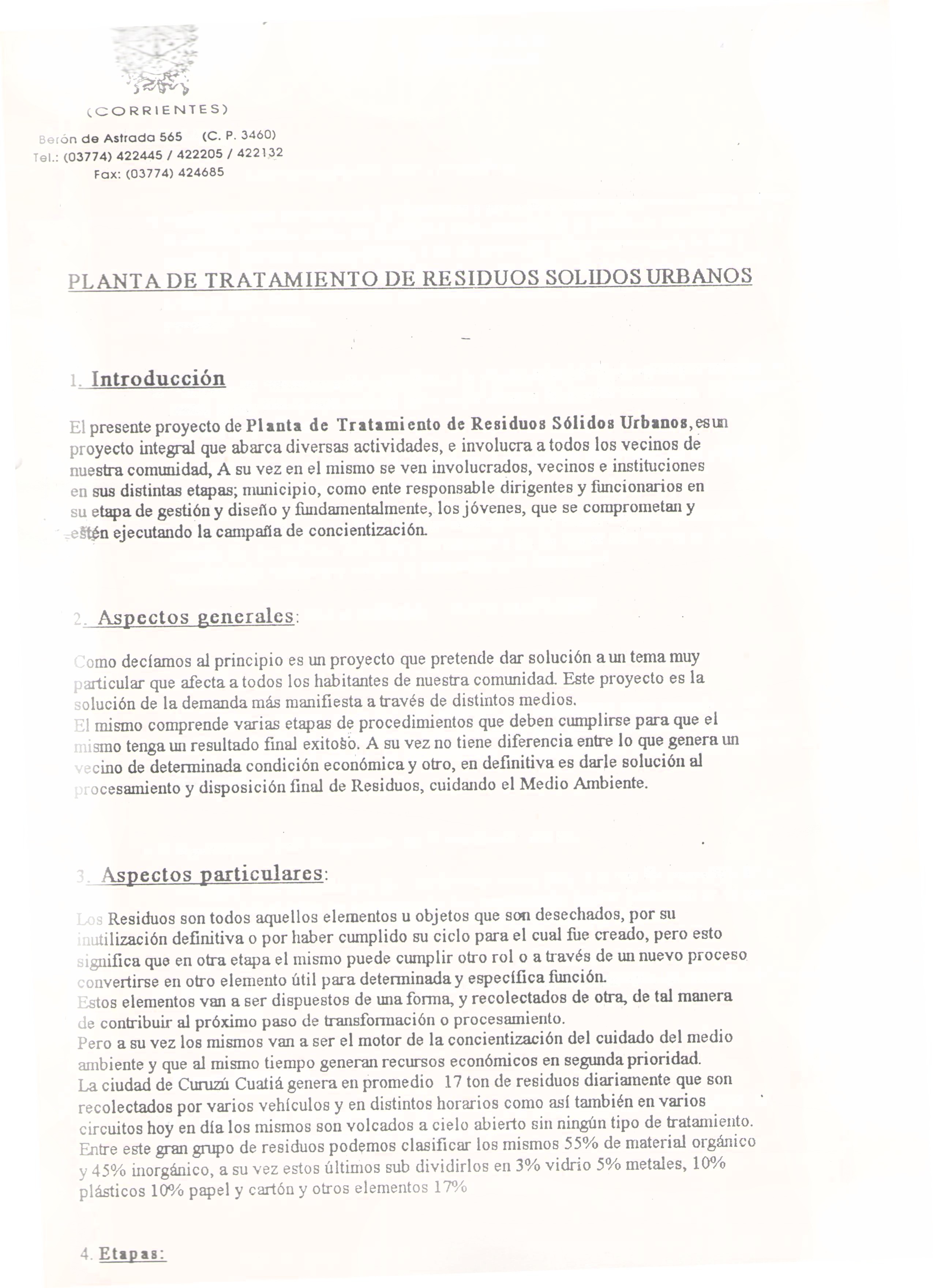 Art.2° - AFECTAR a la finalidad prevista en el ARTICULO PRIMERO de la presente, el inmueble de posesión municipal ubicado en la PRIMERA SECCION SARAN DI del DEPARTAMENTO CURUZU CUATIA, ficha Adrema E1-1065-2, con una superficie total de 27.800 m2 (veintisiete mil ochocientos metros cuadrados) identificadas como fracciones A y B, con los siguientes linderos NORTE: Lorenzo Ocampo, ESTE: Ex Ruta 14 y Valentina Castillo de Alonso, SUR: Ramón de Jesús Salas y OESTE: Sucesión de Angela Castillo. Identificado con el N° 1 en el Anexo B, que forma parte integrante de la presente.