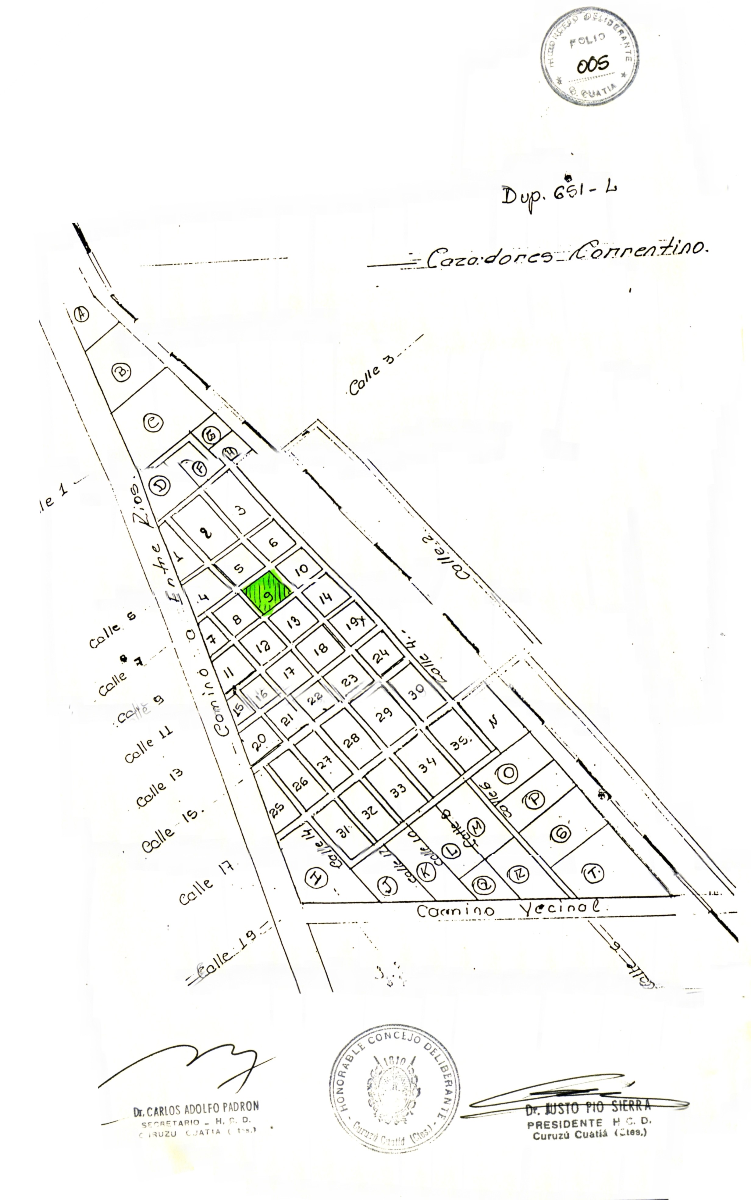 Art. 1o.- Imponer el nombre de "PLAZA DEL ESQUILADOR" al espacio demarcado como manzana N° 9, Mensura N° 651-L, entre las calles 6, 7, 8 y 9, de Cazadores Correntinos (Segunda Sección) Departamento de Curuzú Cuatiá (Corrientes), cuyo plano se adjunta, formando parte integrante de la presente.