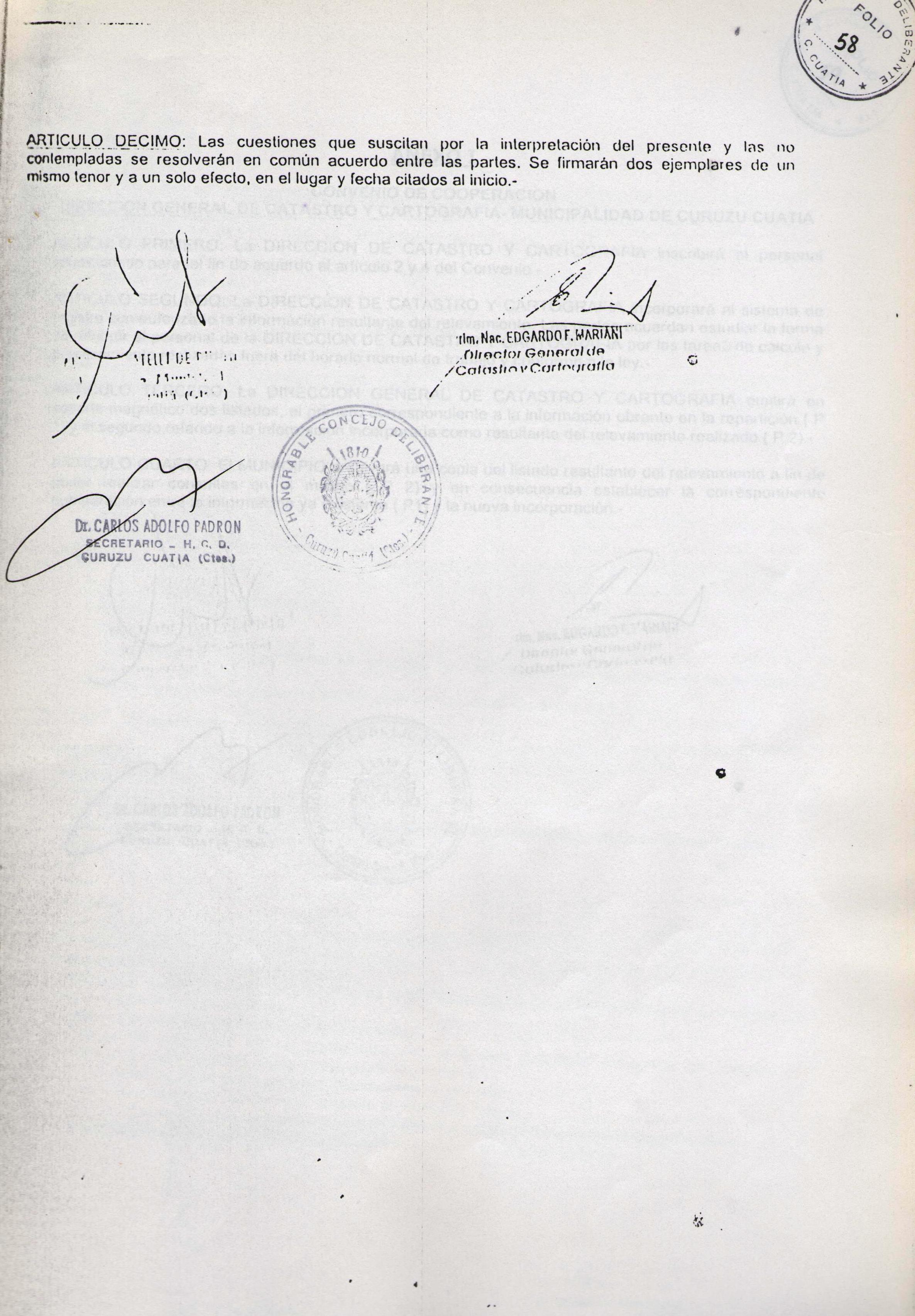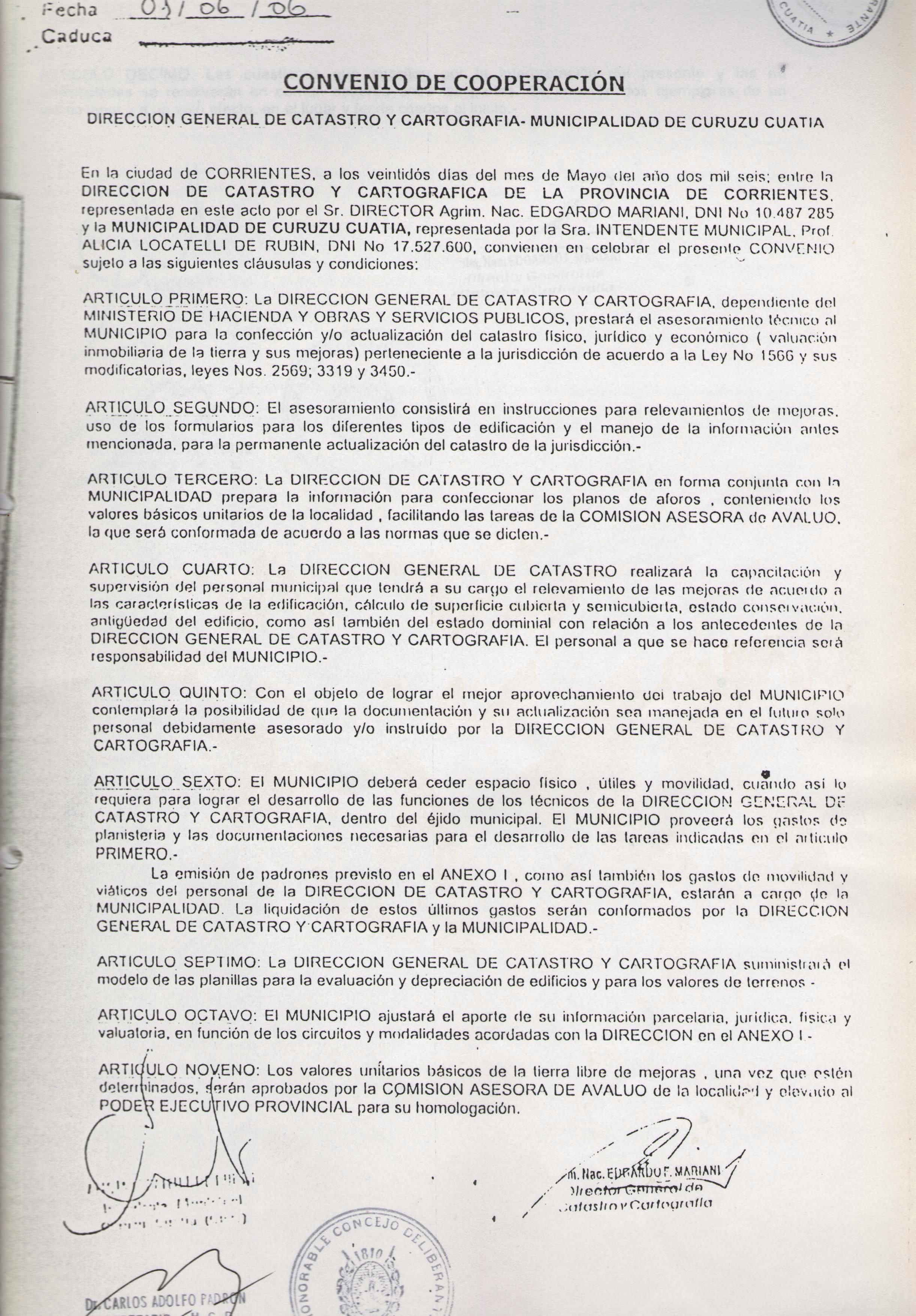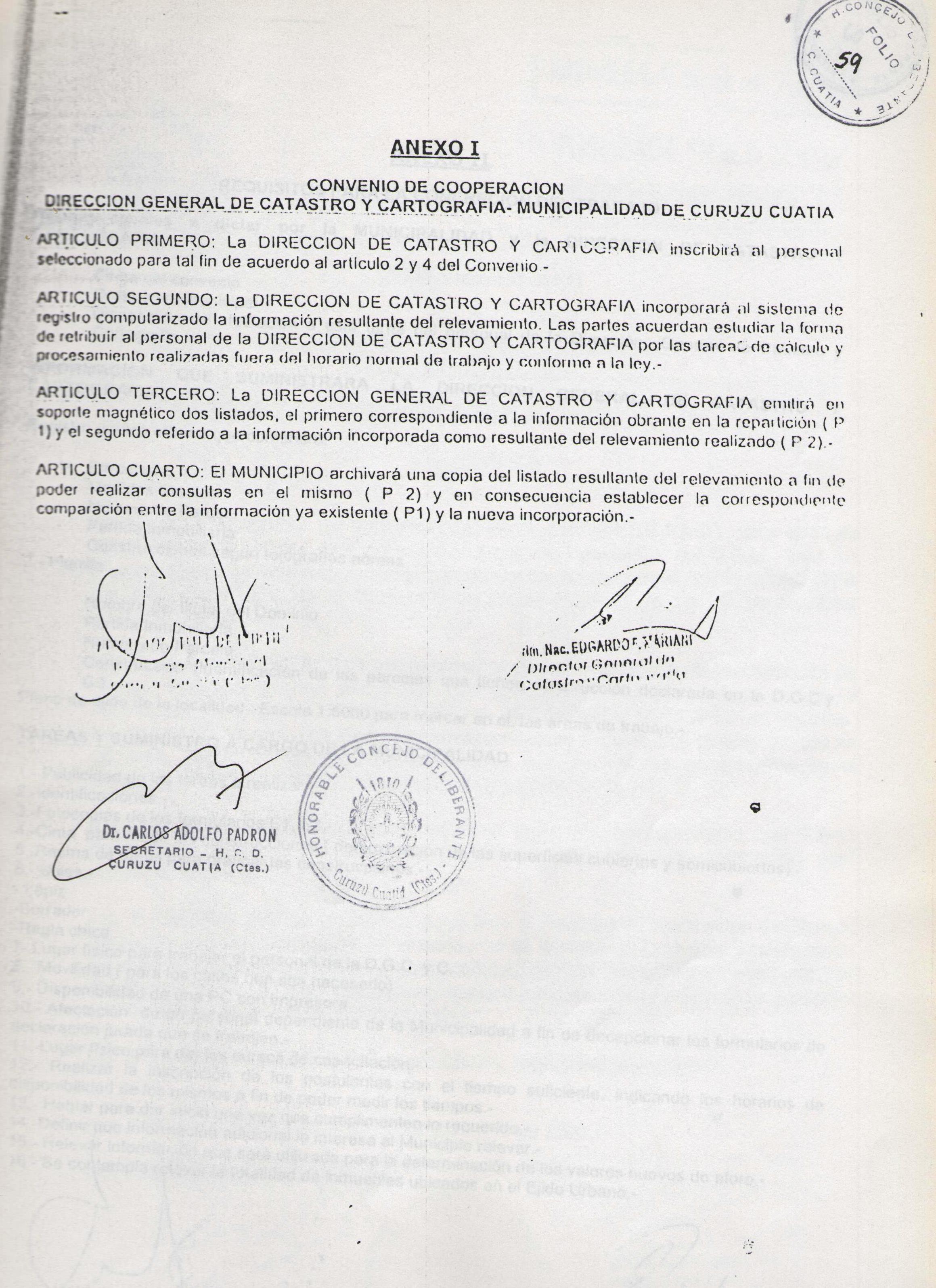 Art.1°.- HOMOLOGAR en todos sus términos el Convenio de Cooperación celebrado entre la Municipalidad de Curuzú Cuatiá y la Dirección General de Catastro y Cartografía de la Provincia de Corrientes, dependiente del Ministerio de Hacienda y Obras y Servicios Públicos.