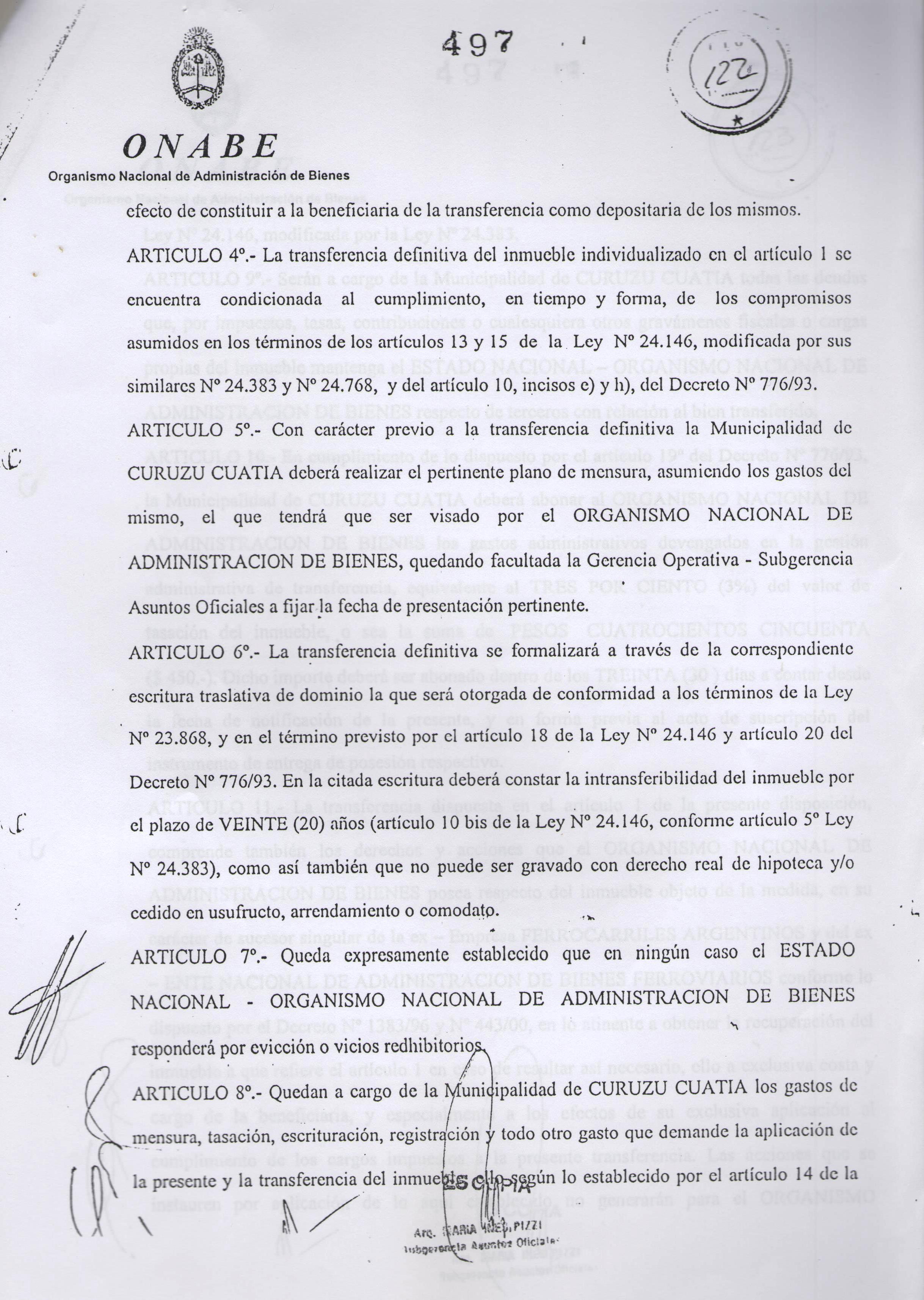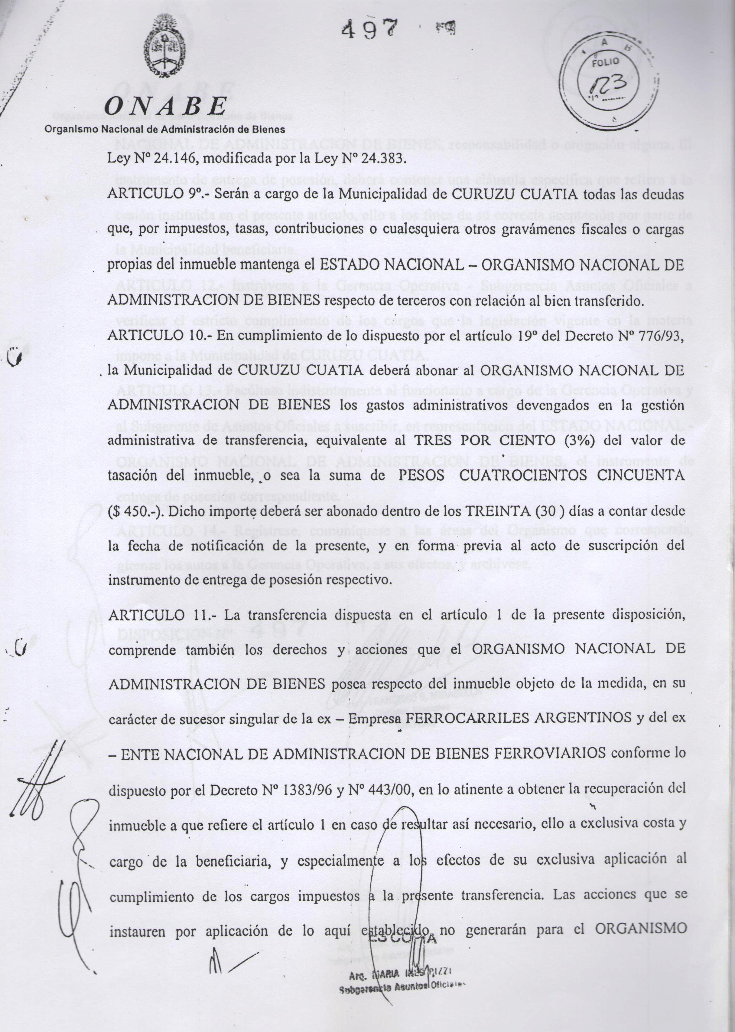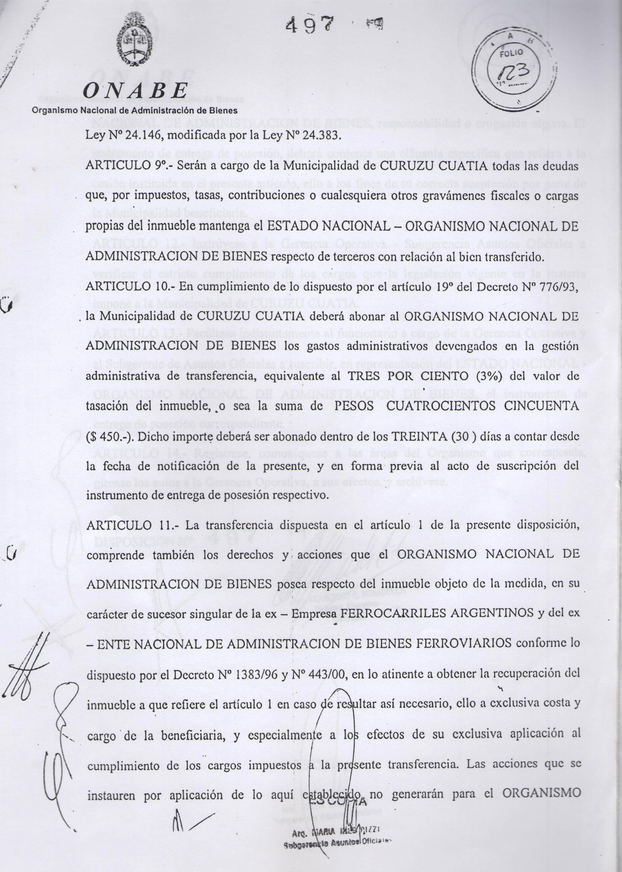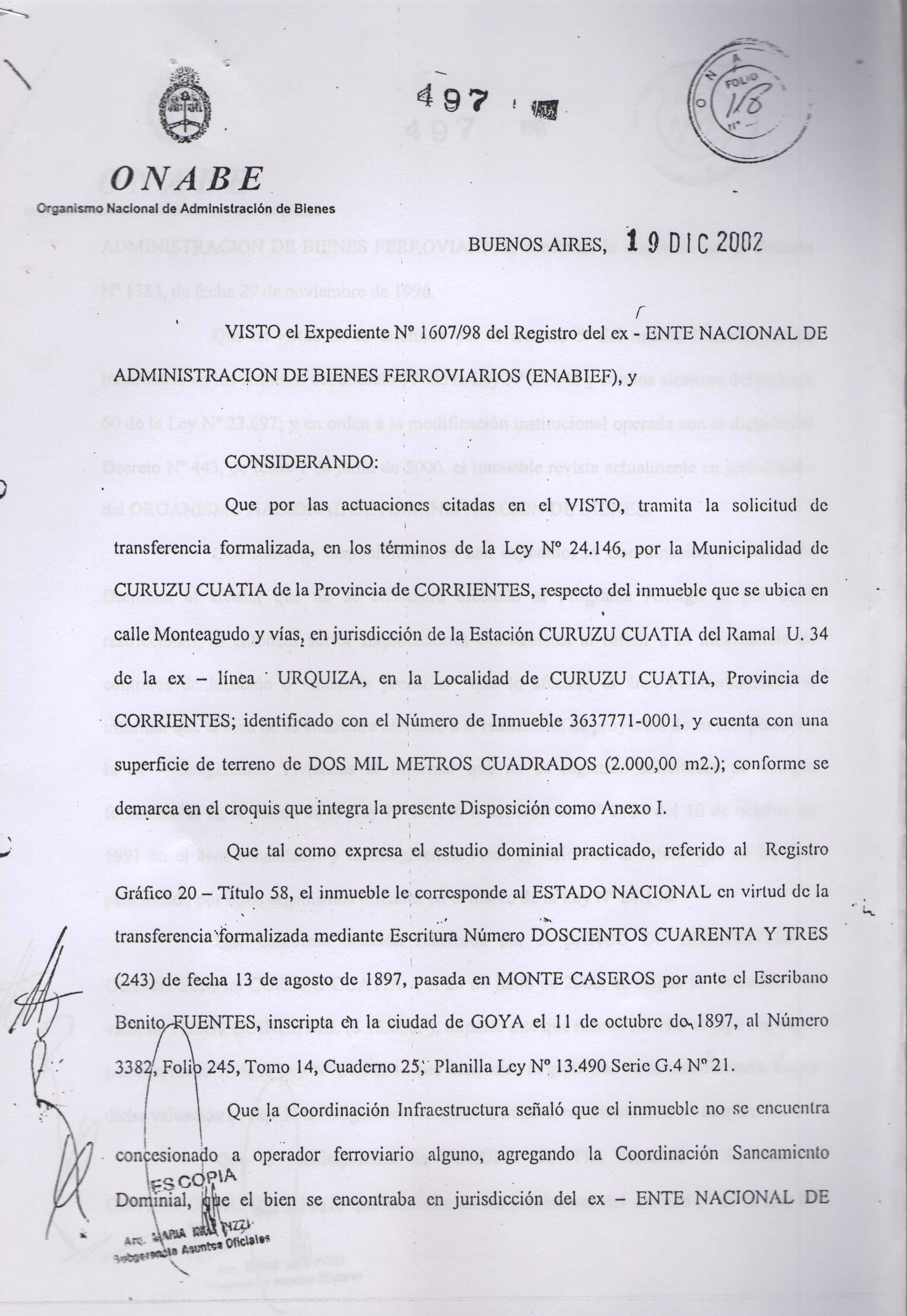 Art 1°.- ACEPTASE la transferencia dispuesta, mediante Disposición de la Dirección Ejecutiva del ORGANISMO NACIONAL DE ADMINISTRACIÓN DE BIENES N°497 de fecha 19/12/02, a favor de esta Municipalidad respecto del inmueble ubicado: en la Localidad de Curuzú Cuatiá, Provincia de Corrientes, en calle Monteagudo y vías, en jurisdicción de la Estación CURUZU CUATIA, Provincia de Corrientes, que se identifica bajo el Número de Inmueble 3637771-0001, y que cuenta con una superficie de terreno de DOS MIL METROS CUADRADOS (2.000,00 M2.).