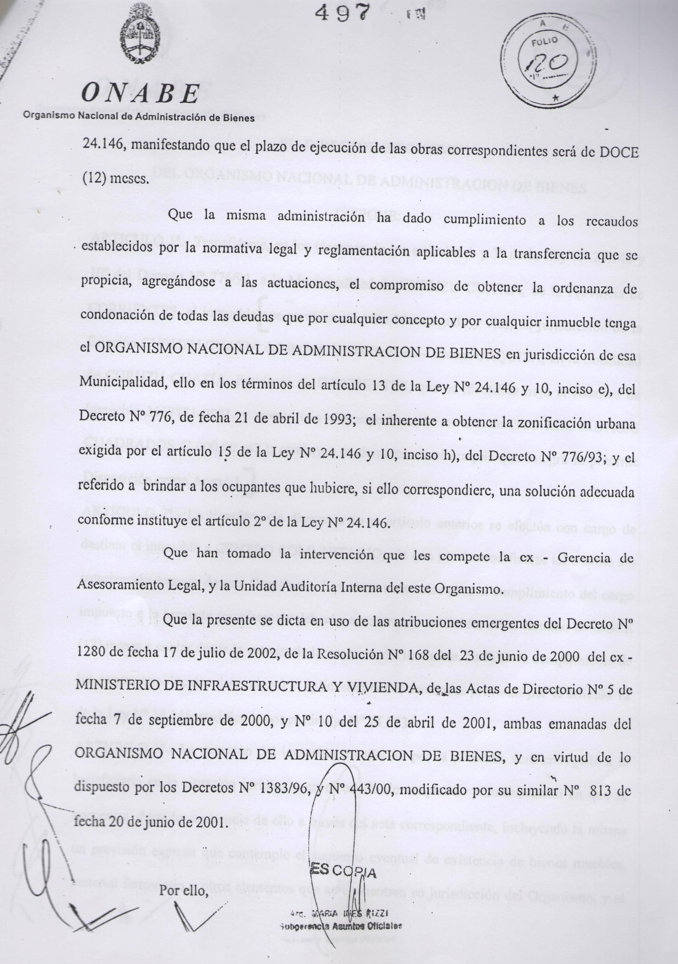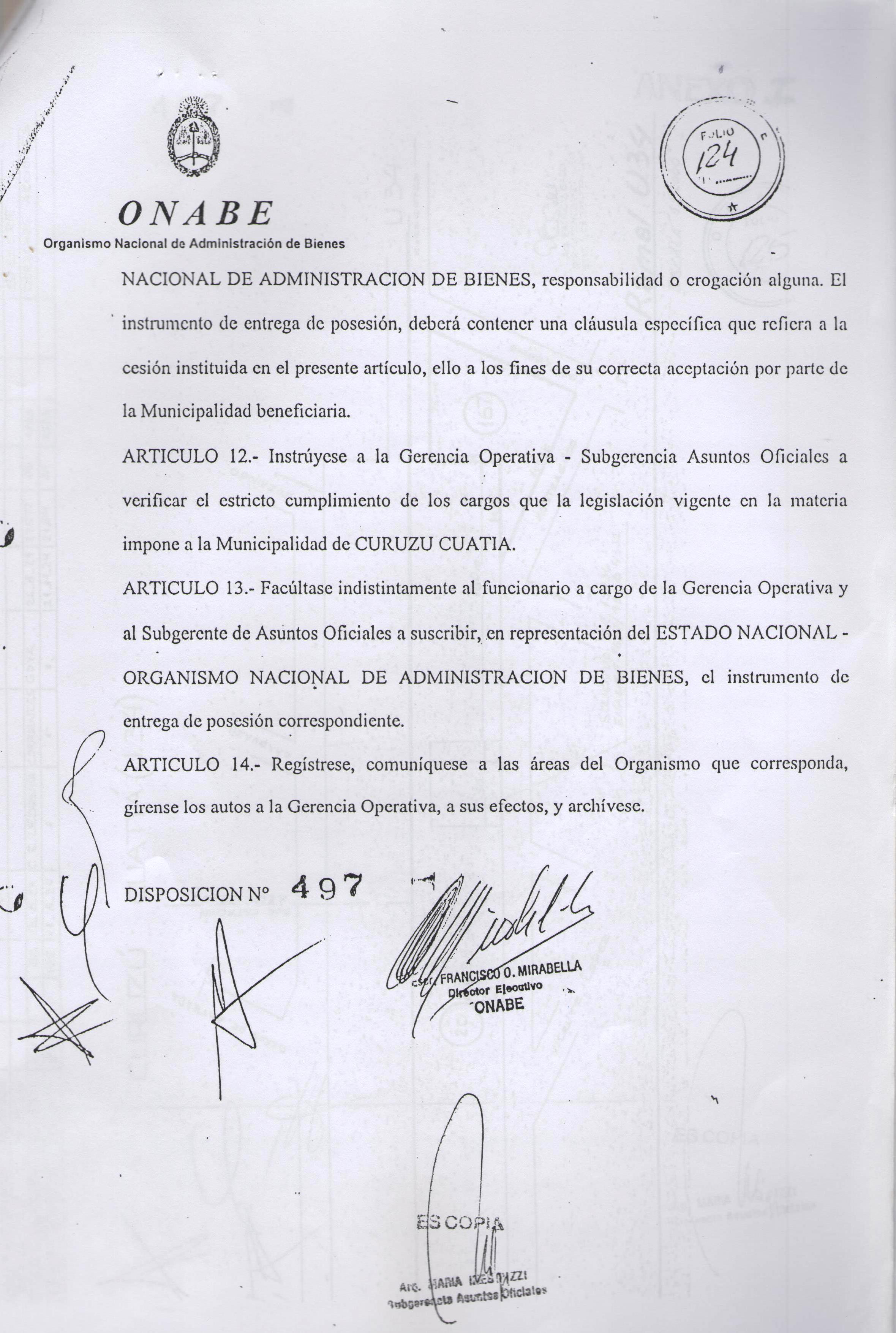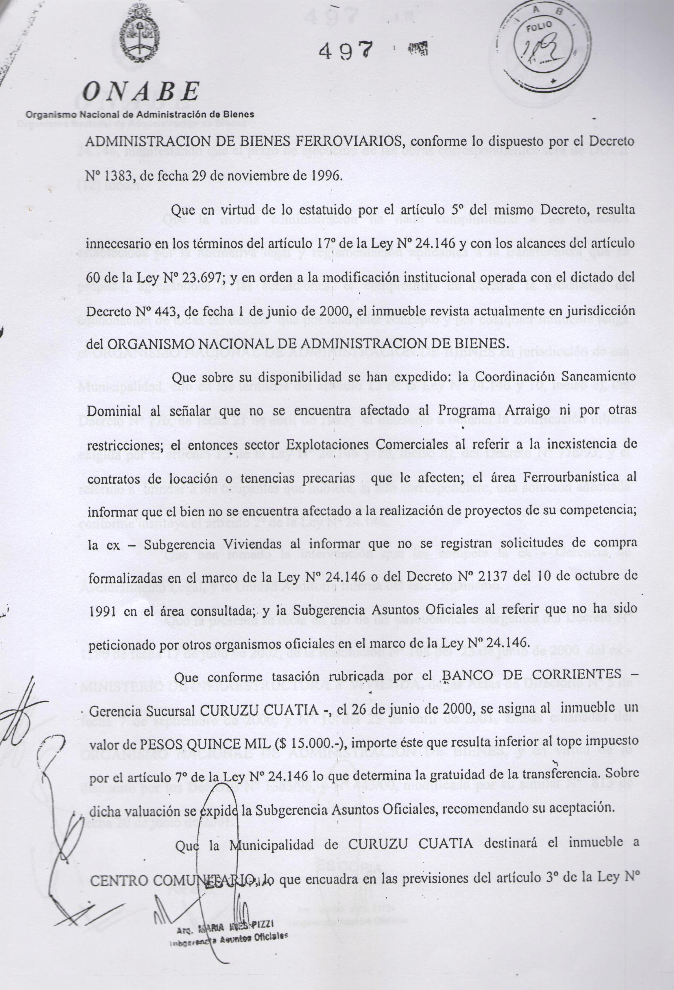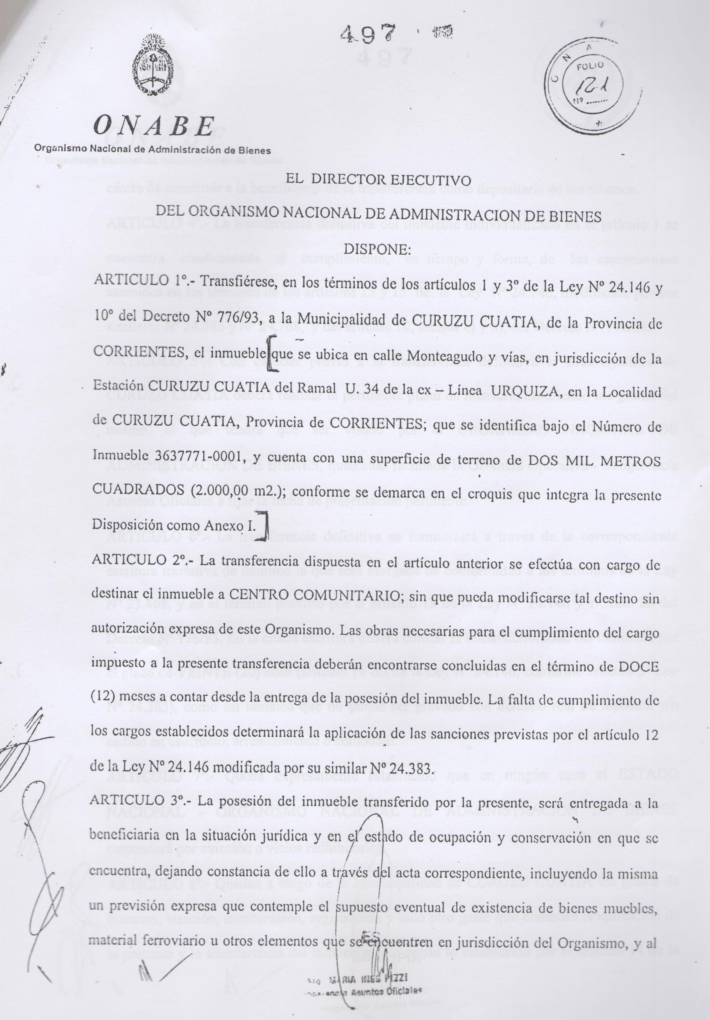 Art 1°.- ACEPTASE la transferencia dispuesta, mediante Disposición de la Dirección Ejecutiva del ORGANISMO NACIONAL DE ADMINISTRACIÓN DE BIENES N°497 de fecha 19/12/02, a favor de esta Municipalidad respecto del inmueble ubicado: en la Localidad de Curuzú Cuatiá, Provincia de Corrientes, en calle Monteagudo y vías, en jurisdicción de la Estación CURUZU CUATIA, Provincia de Corrientes, que se identifica bajo el Número de Inmueble 3637771-0001, y que cuenta con una superficie de terreno de DOS MIL METROS CUADRADOS (2.000,00 M2.).