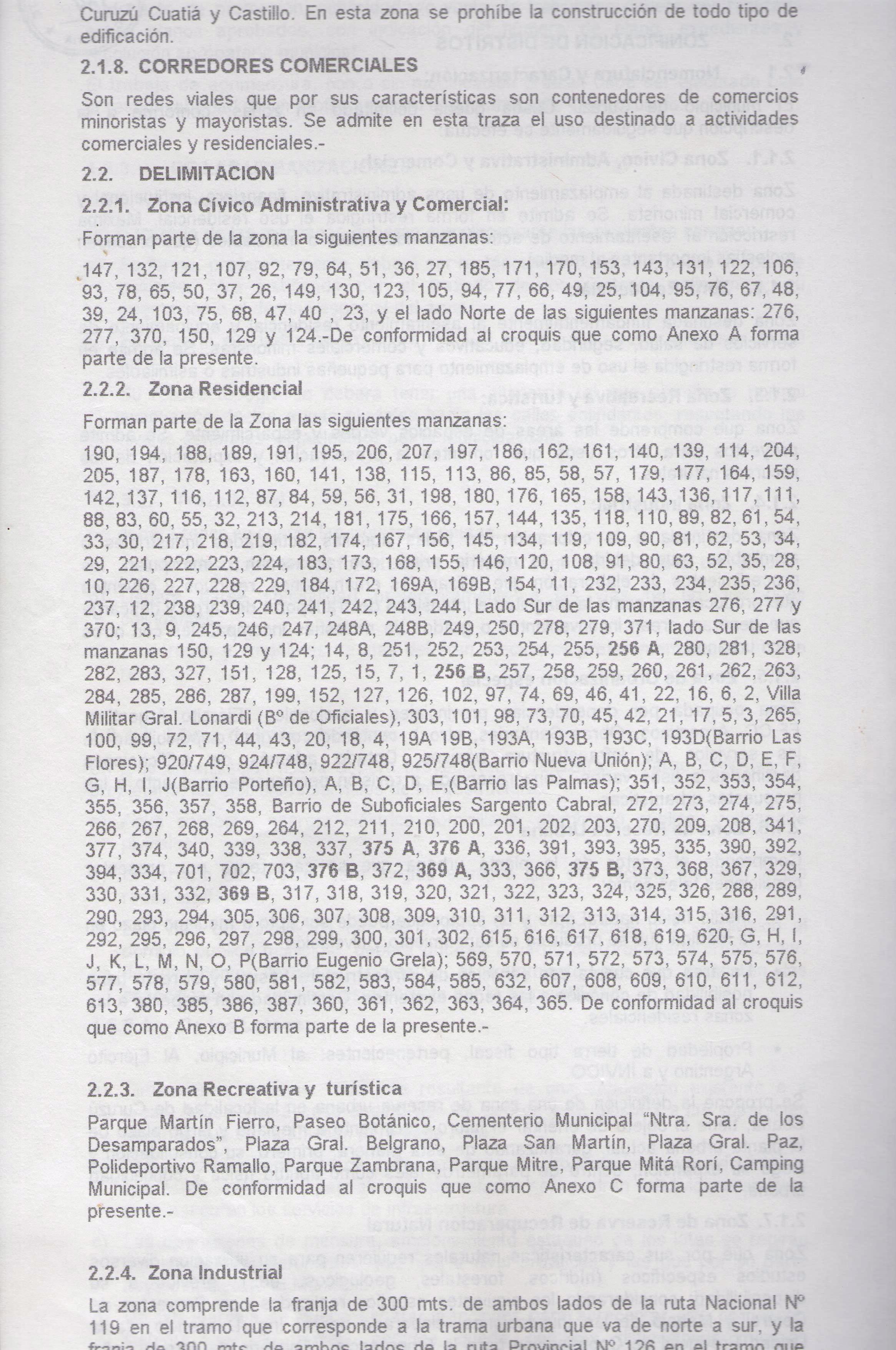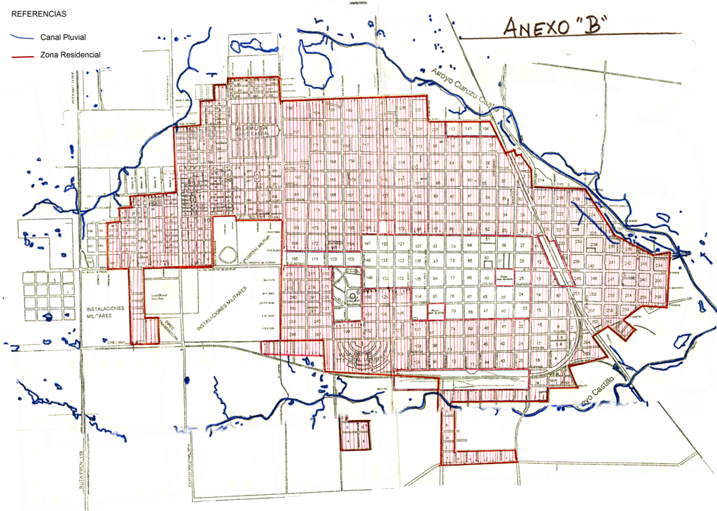 190, 194, 188, 189, 191, 195, 206, 207, 197, 186, 162, 161, 140, 139, 114, 204, 205, 187, 178, 163, 160, 141, 138, 115, 113, 86, 85, 58, 57, 179, 177, 164, 159, 142, 137, 116, 112, 87, 84, 59, 56, 31, 198, 180, 176, 165, 158, 143, 136, 117, 111, 88, 83, 60, 55, 32, 213, 214, 181, 175, 166, 157, 144, 135, 118, 110, 89, 82, 61, 54, 33, 30, 217, 218, 219, 182, 174, 167, 156, 145, 134, 119, 109, 90, 81, 62, 53, 34, 29, 221, 222, 223, 224, 183, 173, 168, 155, 146, 120, 108, 91, 80, 63, 52, 35, 28, 10, 226, 227, 228, 229, 184, 172, 169A, 169B, 154, 11, 232, 233, 234, 235, 236, 237, 12, 238, 239, 240, 241, 242, 243, 244, Lado Sur de las manzanas 276, 277 y 370; 13, 9, 245, 246, 247, 248A, 248B, 249, 250, 278, 279, 371, lado Sur de las manzanas 150, 129 y 124; 14, 8, 251, 252, 253, 254, 255, 256 A, 280, 281, 328, 282, 283, 327, 151, 128, 125, 15, 7, 1, 256 B, 257, 258, 259, 260, 261, 262, 263, 284, 285, 286, 287, 199, 152, 127, 126, 102, 97, 74, 69, 46, 41, 22, 16, 6, 2, Villa Militar Gral. Lonardi (Bº de Oficiales), 303, 101, 98, 73, 70, 45, 42, 21, 17, 5, 3, 265, 100, 99, 72, 71, 44, 43, 20, 18, 4, 19A 19B, 193A, 193B, 193C, 193D(Barrio Las Flores); 920/749, 924/748, 922/748, 925/748(Barrio Nueva Unión); A, B, C, D, E, F, G, H, I, J(Barrio Porteño), A, B, C, D, E,(Barrio las Palmas); 351, 352, 353, 354, 355, 356, 357, 358, Barrio de Suboficiales Sargento Cabral, 272, 273, 274, 275, 266, 267, 268, 269, 264, 212, 211, 210, 200, 201, 202, 203, 270, 209, 208, 341, 377, 374, 340, 339, 338, 337, 375 A, 376 A, 336, 391, 393, 395, 335, 390, 392, 394, 334, 701, 702, 703, 376 B, 372, 369 A, 333, 366, 375 B, 373, 368, 367, 329, 330, 331, 332, 369 B, 317, 318, 319, 320, 321, 322, 323, 324, 325, 326, 288, 289, 290, 293, 294, 305, 306, 307, 308, 309, 310, 311, 312, 313, 314, 315, 316, 291, 292, 295, 296, 297, 298, 299, 300, 301, 302, 615, 616, 617, 618, 619, 620, G, H, I, J, K, L, M, N, O, P(Barrio Eugenio Grela); 569, 570, 571, 572, 573, 574, 575, 576, 577, 578, 579, 580, 581, 582, 583, 584, 585, 632, 607, 608, 609, 610, 611, 612, 613, 380, 385, 386, 387, 360, 361, 362, 363, 364, 365. De conformidad al croquis que como Anexo B forma parte de la presente.-