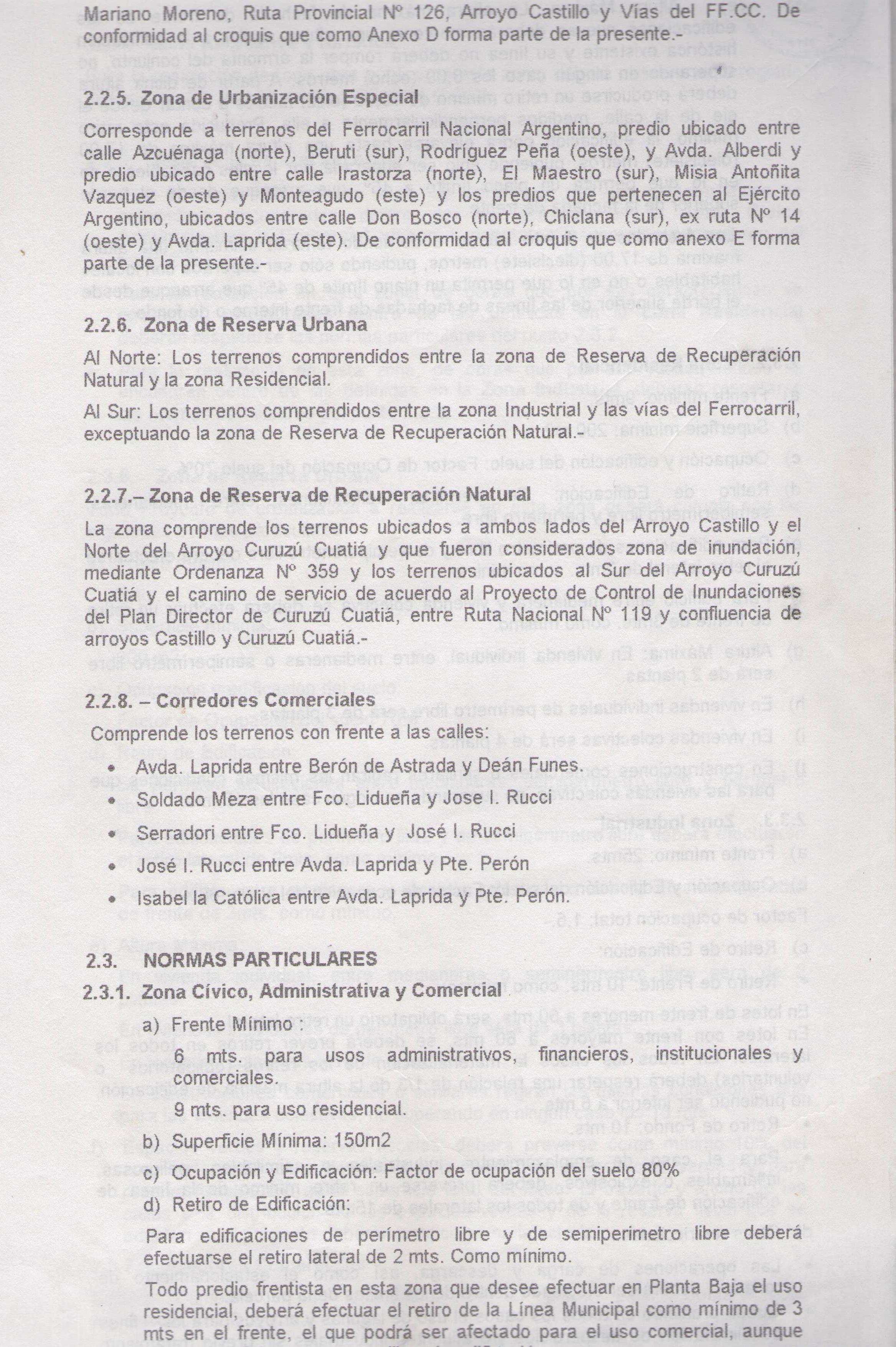 La zona comprende los terrenos ubicados a ambos lados del Arroyo Castillo y el Norte del Arroyo Curuzú Cuatiá y que fueron considerados zona de inundación, mediante Ordenanza Nº 359 y los terrenos ubicados al Sur del Arroyo Curuzú Cuatiá y el camino de servicio de acuerdo al Proyecto de Control de Inundaciones del Plan Director de Curuzú Cuatiá, entre Ruta Nacional Nº 119 y confluencia de arroyos Castillo y Curuzú Cuatiá.-