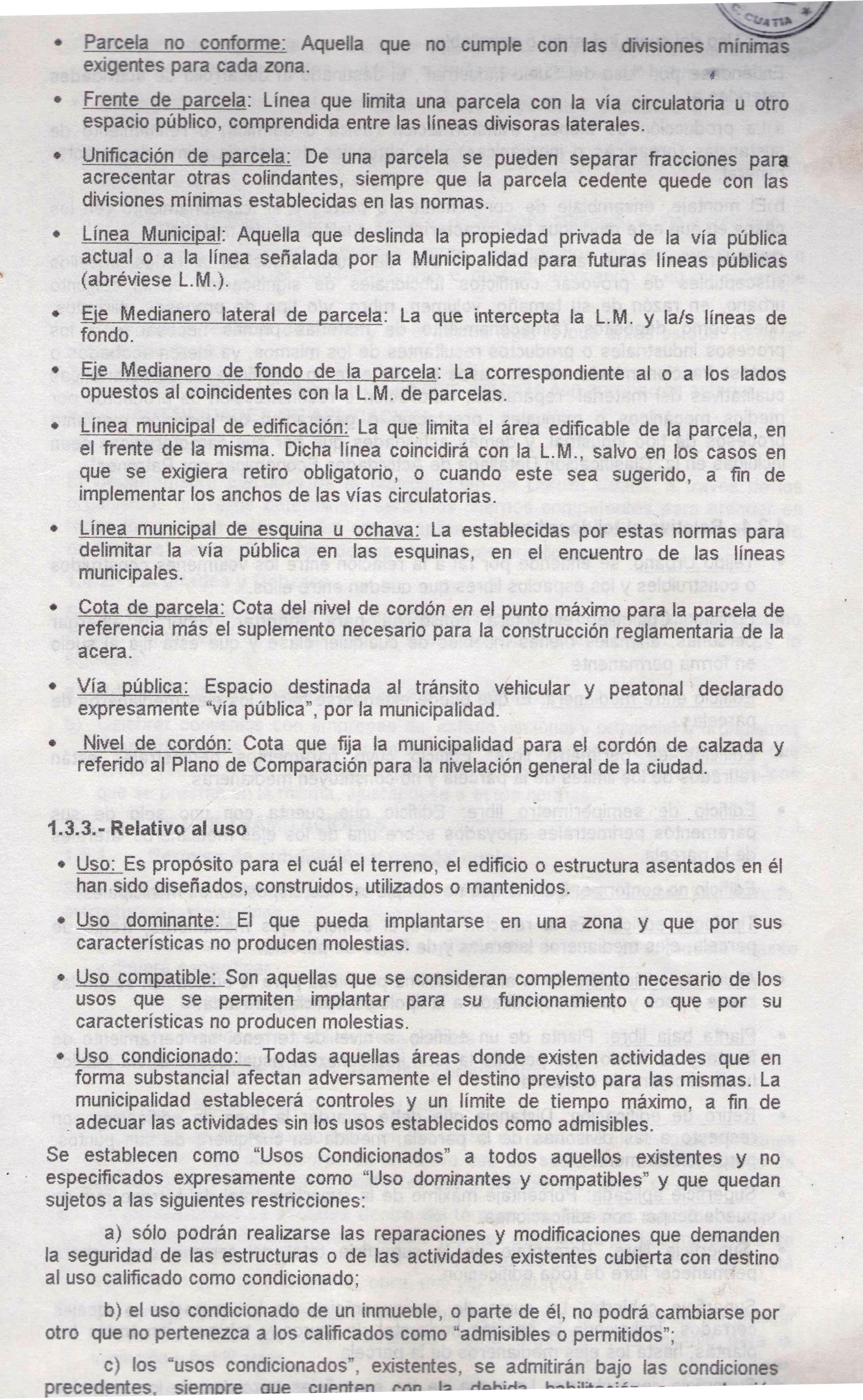 · Uso condicionado: Todas aquellas áreas donde existen actividades que en forma substancial afectan adversamente el destino previsto para las mismas. La municipalidad establecerá controles y un límite de tiempo máximo, a fin de adecuar las actividades sin los usos establecidos como admisibles.