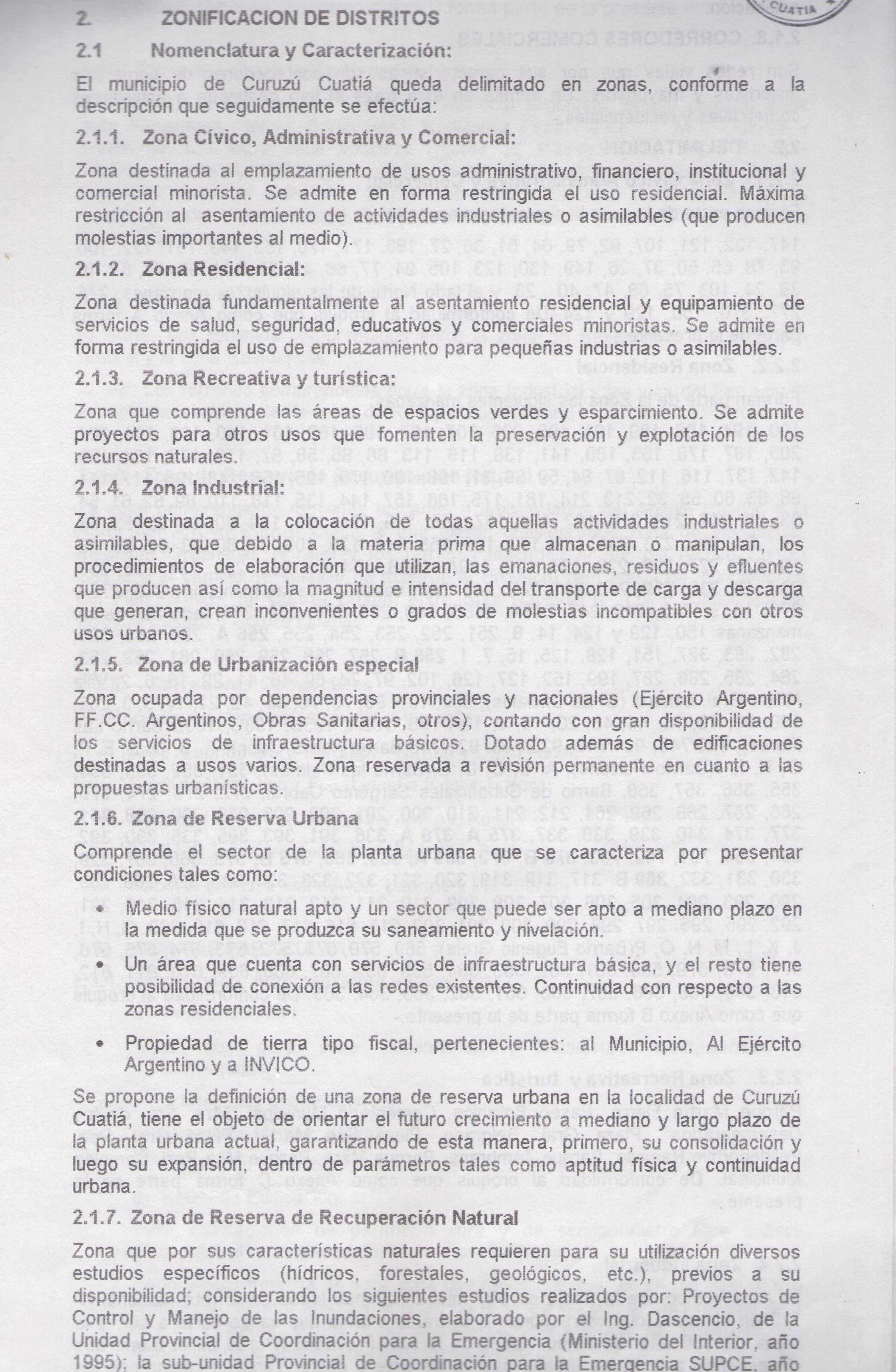 Se propone la definición de una zona de reserva urbana en la localidad de Curuzú Cuatiá, tiene el objeto de orientar el futuro crecimiento a mediano y largo plazo de la planta urbana actual, garantizando de esta manera, primero, su consolidación y luego su expansión, dentro de parámetros tales como aptitud física y continuidad urbana.