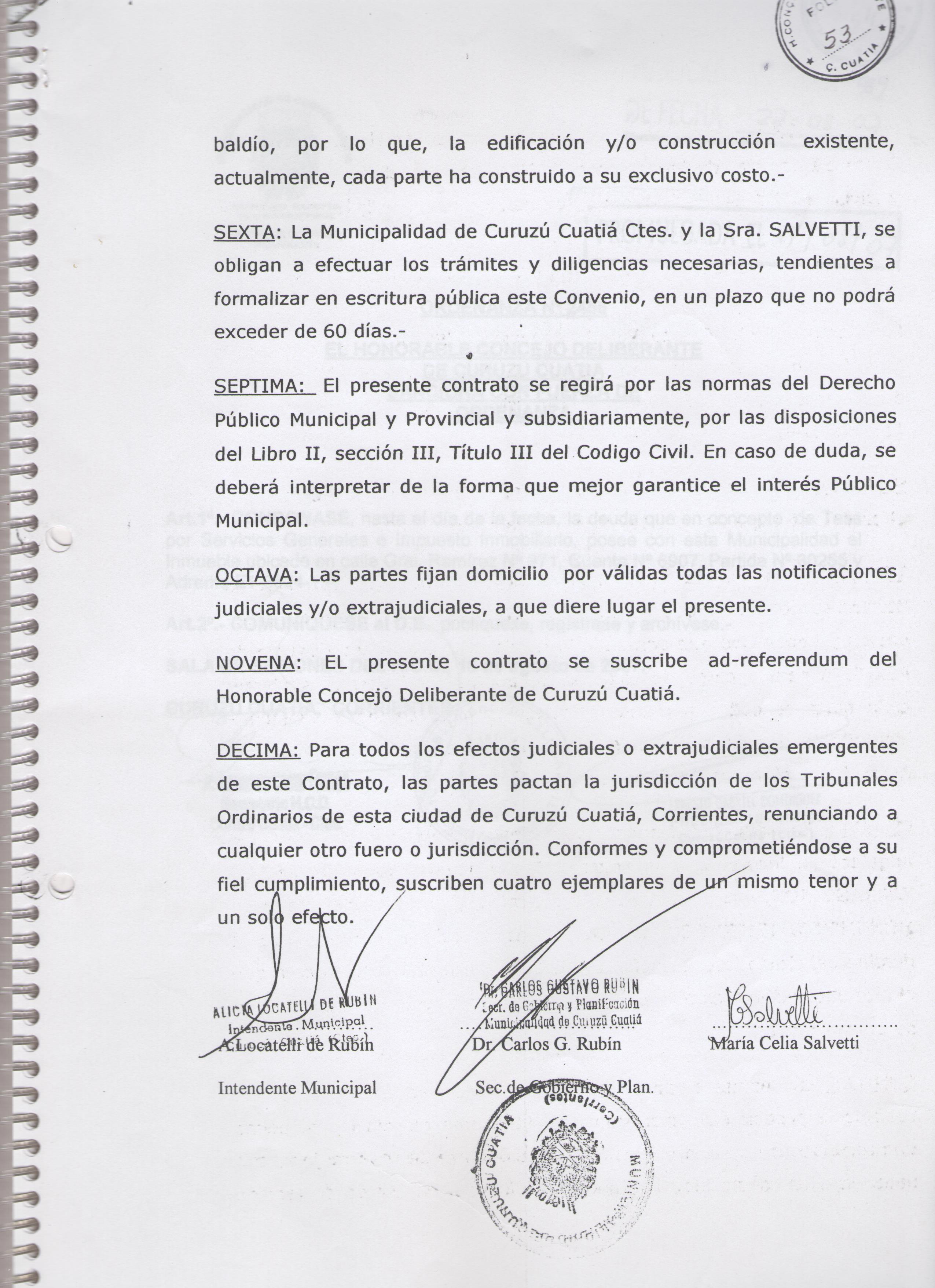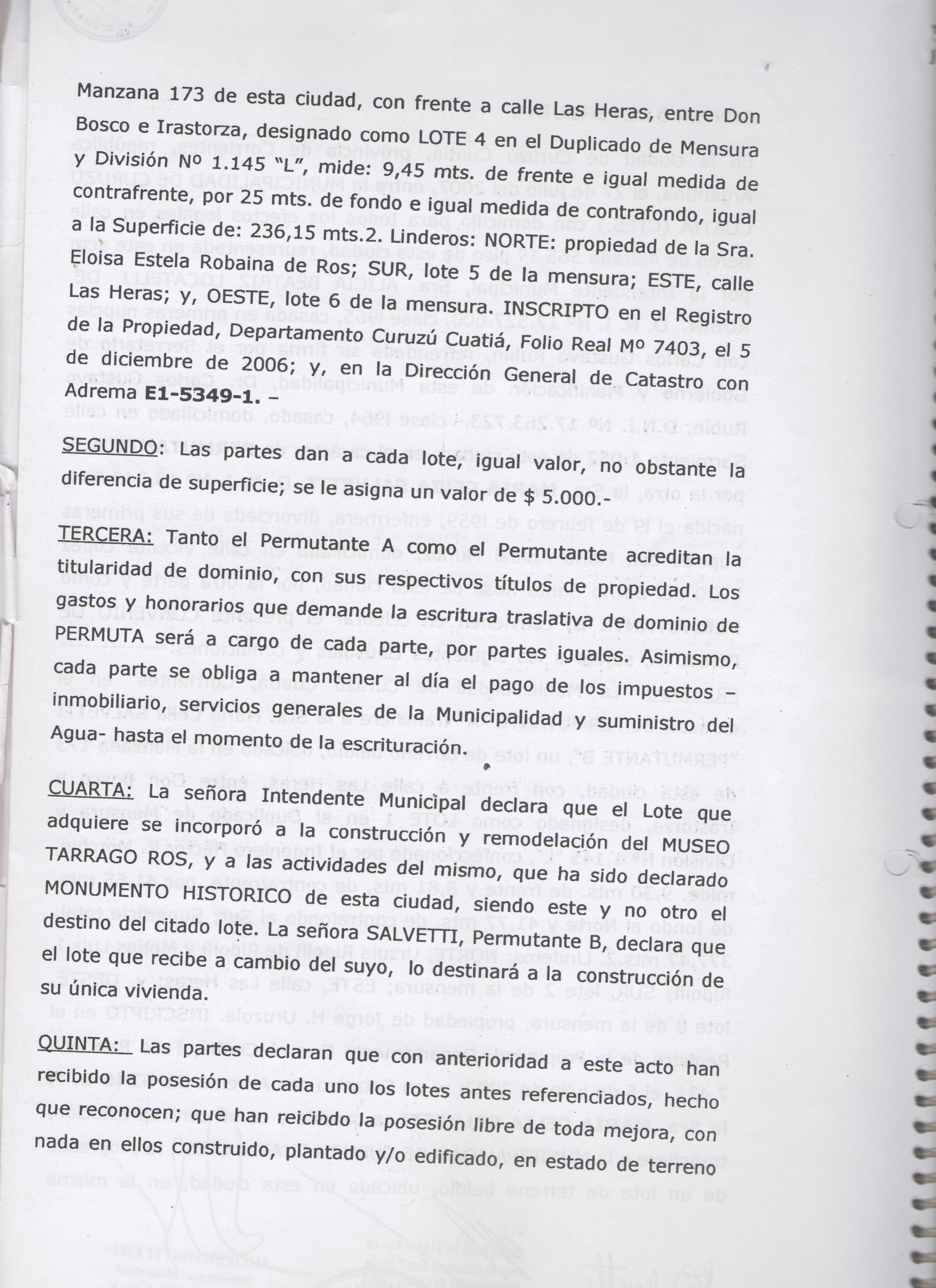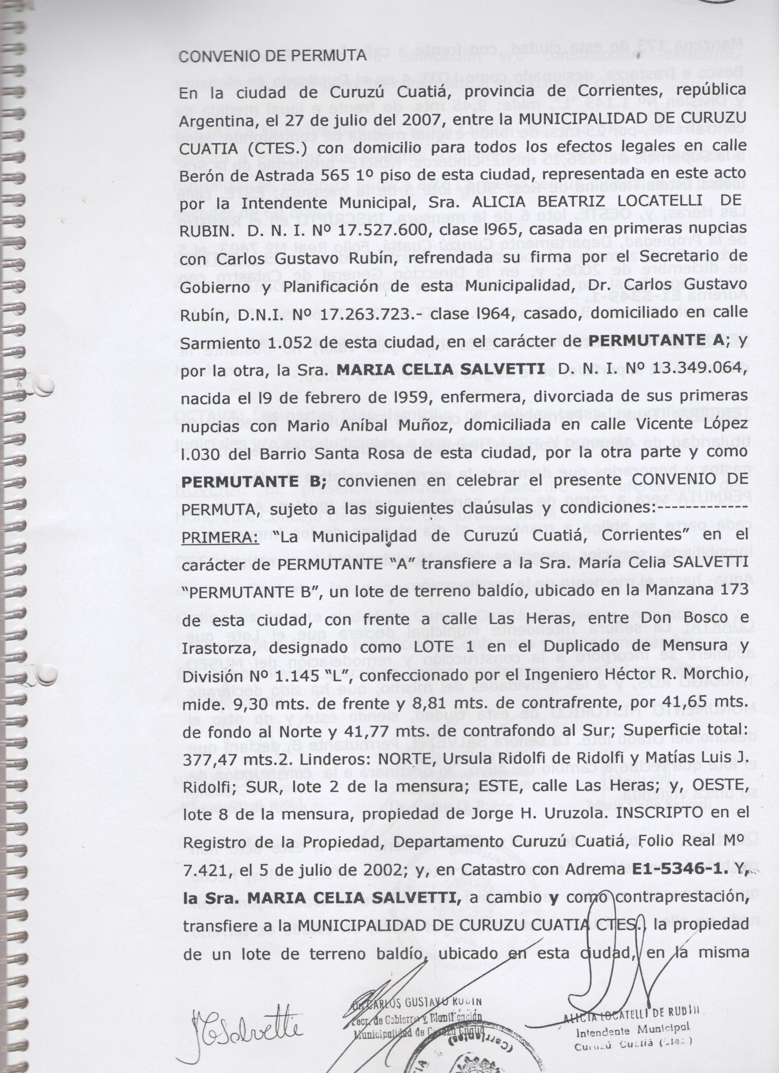 Art.1º.- APRUEBASE el Convenio de Permuta suscripto entre esta Municipalidad y la Sra. María Celia Salvetti, DNI 13.349.064, por el que se transfiere un lote de terreno ubicado en la Manzana 173, ubicado entre la calle Las Heras, entre Don Bosco e Irastorza, a cambio del lote de terreno ubicado en la misma manzana, con frente a la calle Las Heras, entre Don Bosco e Irastorza, cuyos demás datos identificatorios de ambos terrenos figuran en el Convenio de Permuta, que forma parte como Anexo 1 de la presente Ordenanza.-