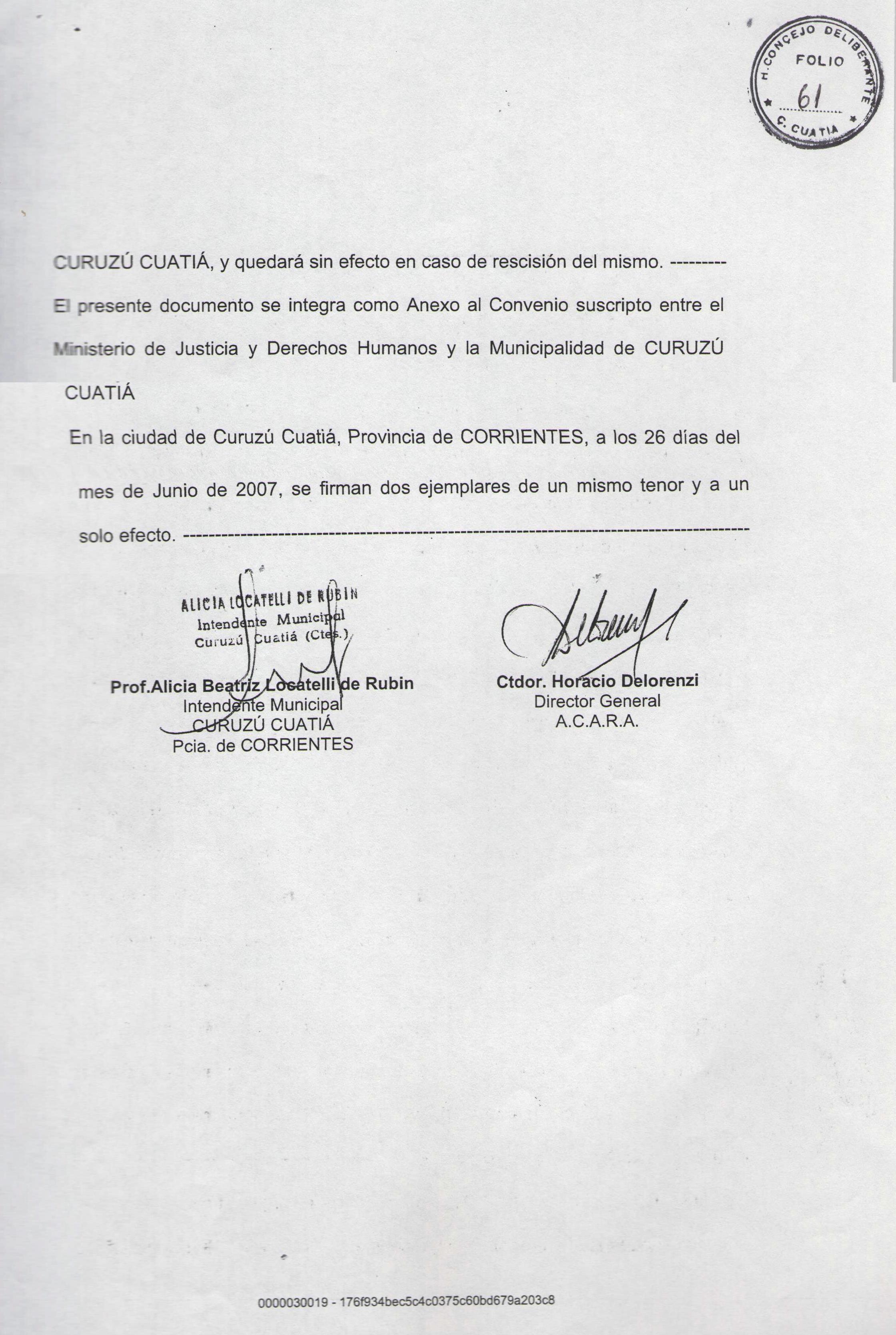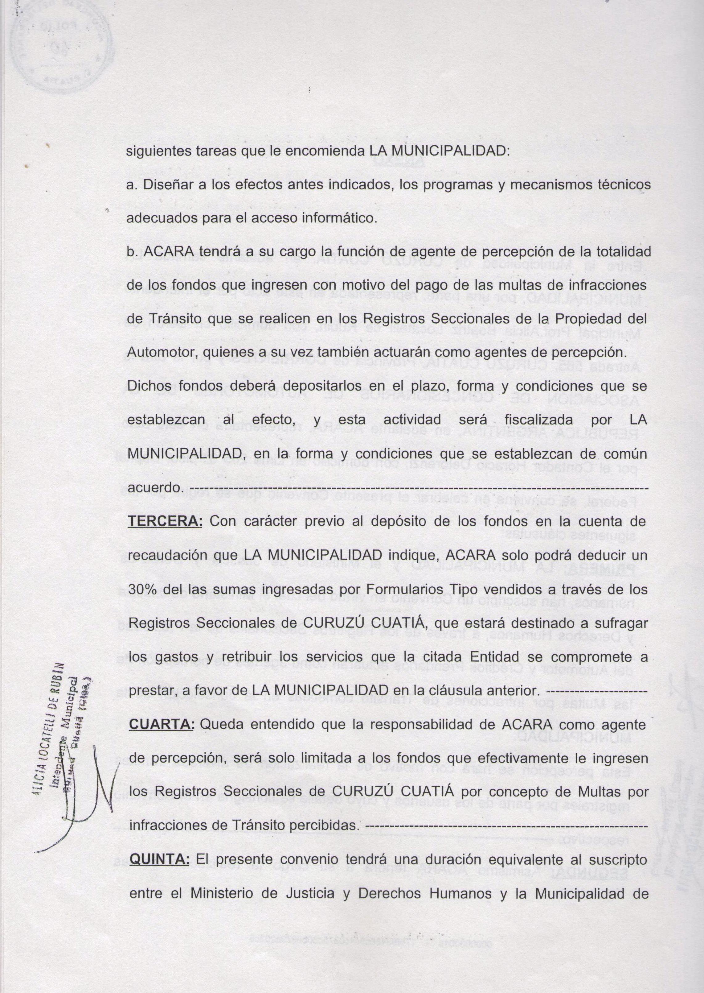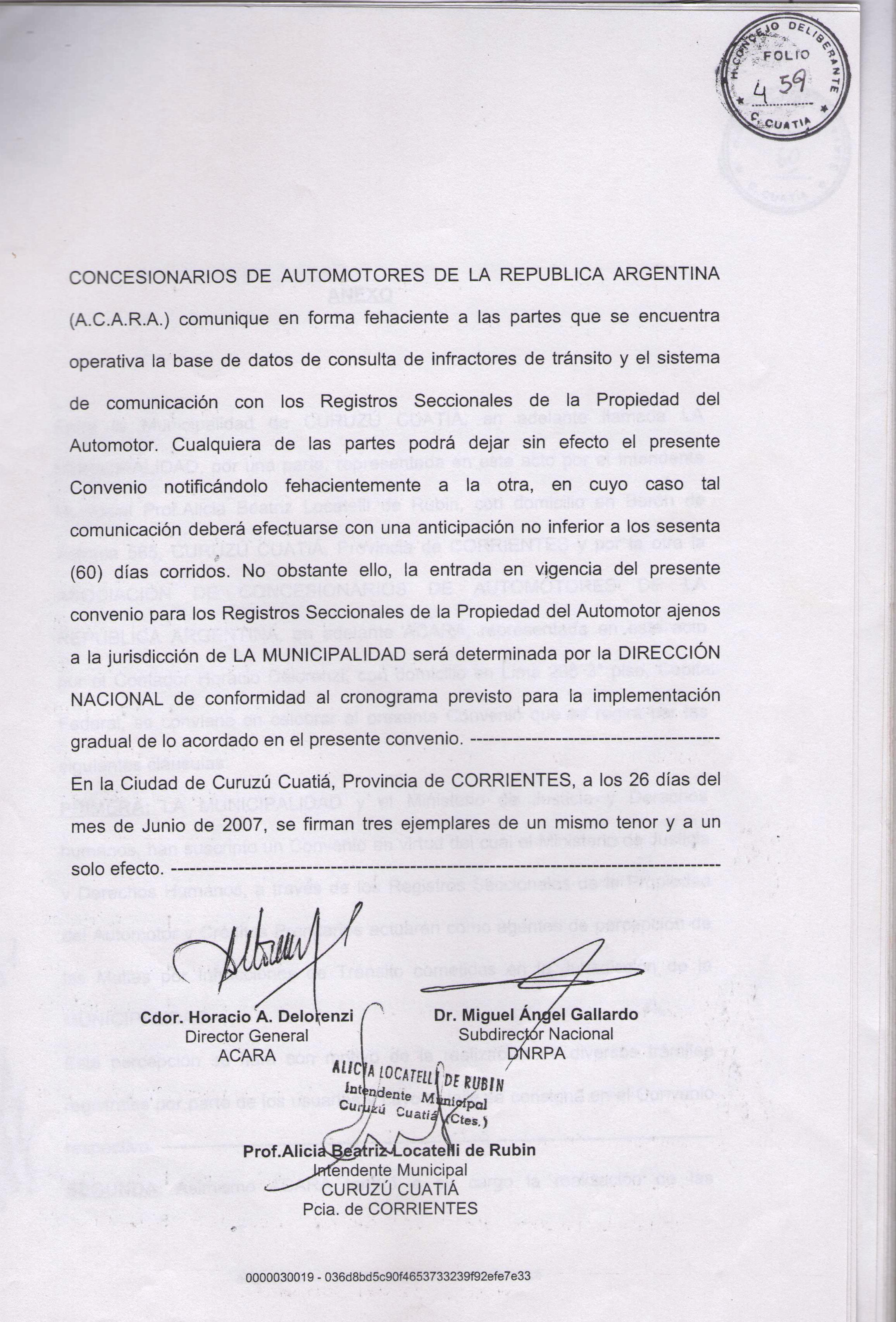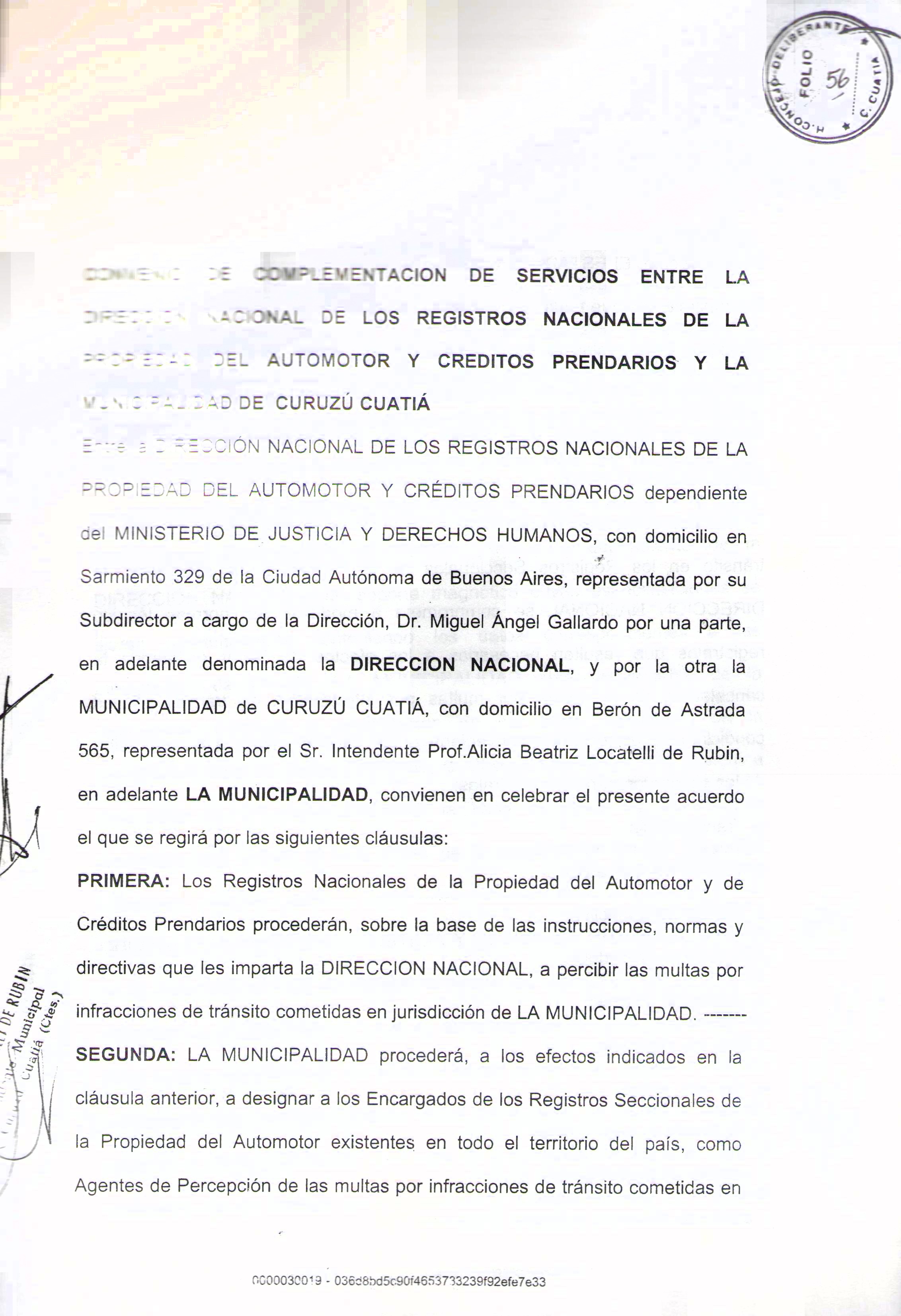 Art.1º.- Homologase el Convenio y su correspondiente Anexo celebrado el 26 de junio de 2007 entre la MUNICIPALIDAD DE CURUZU CUATIA y la DIRECCION NACIONAL de los REGISTROS NACIONALES de la PROPIEDAD AUTOMOTOR y CREDITOS PRENDARIOS, referido al Sistema Unificado de Gestión de Infracciones de Tránsito (SUGIT) y que obra adjunto a la presente.