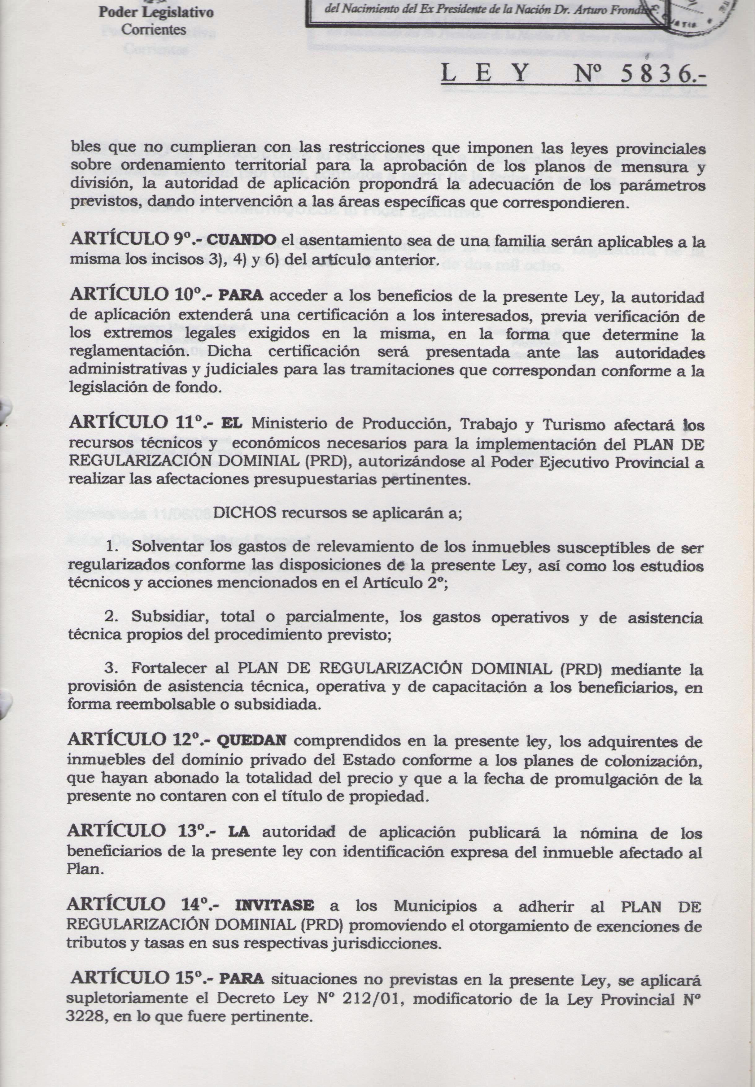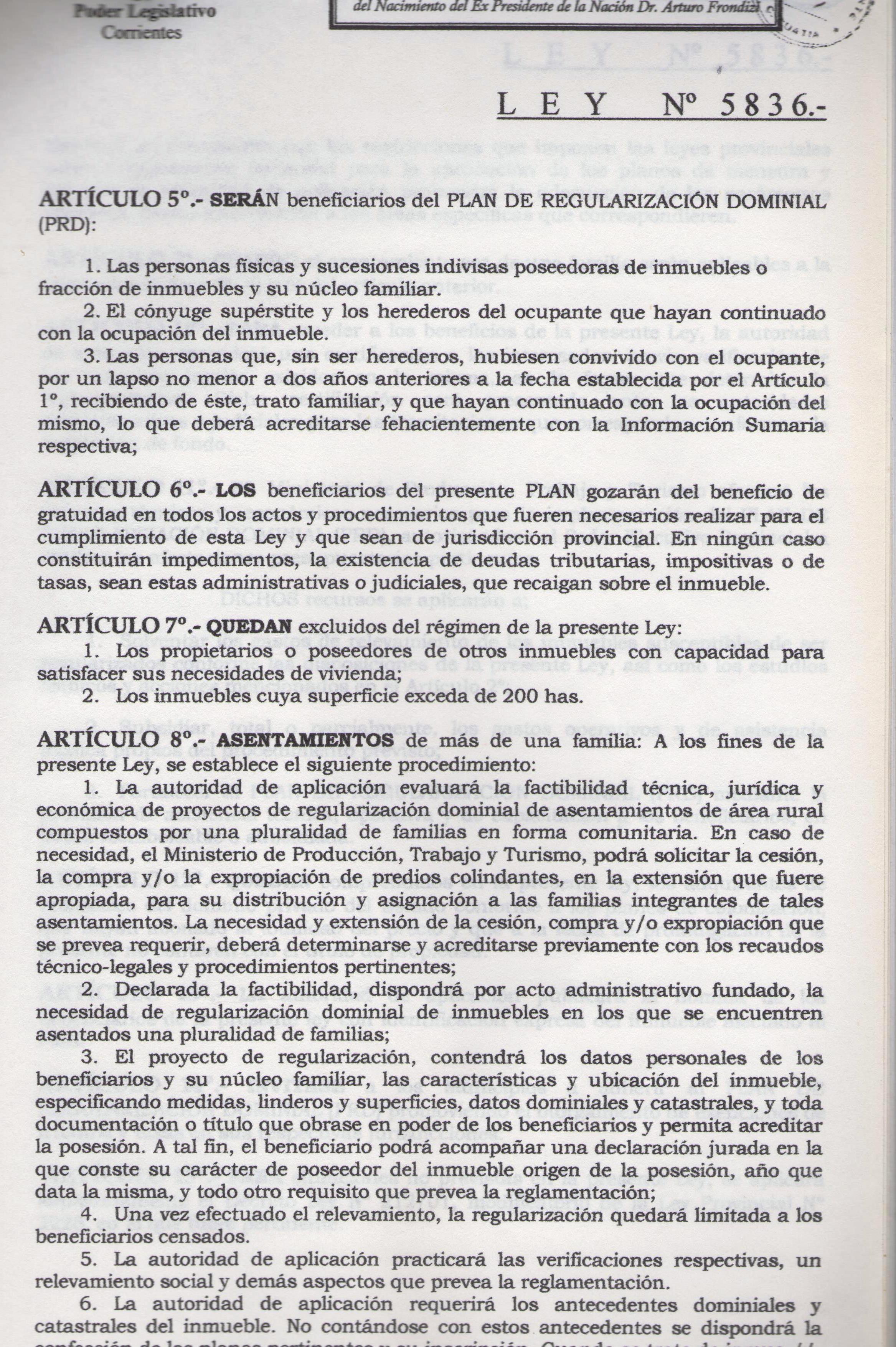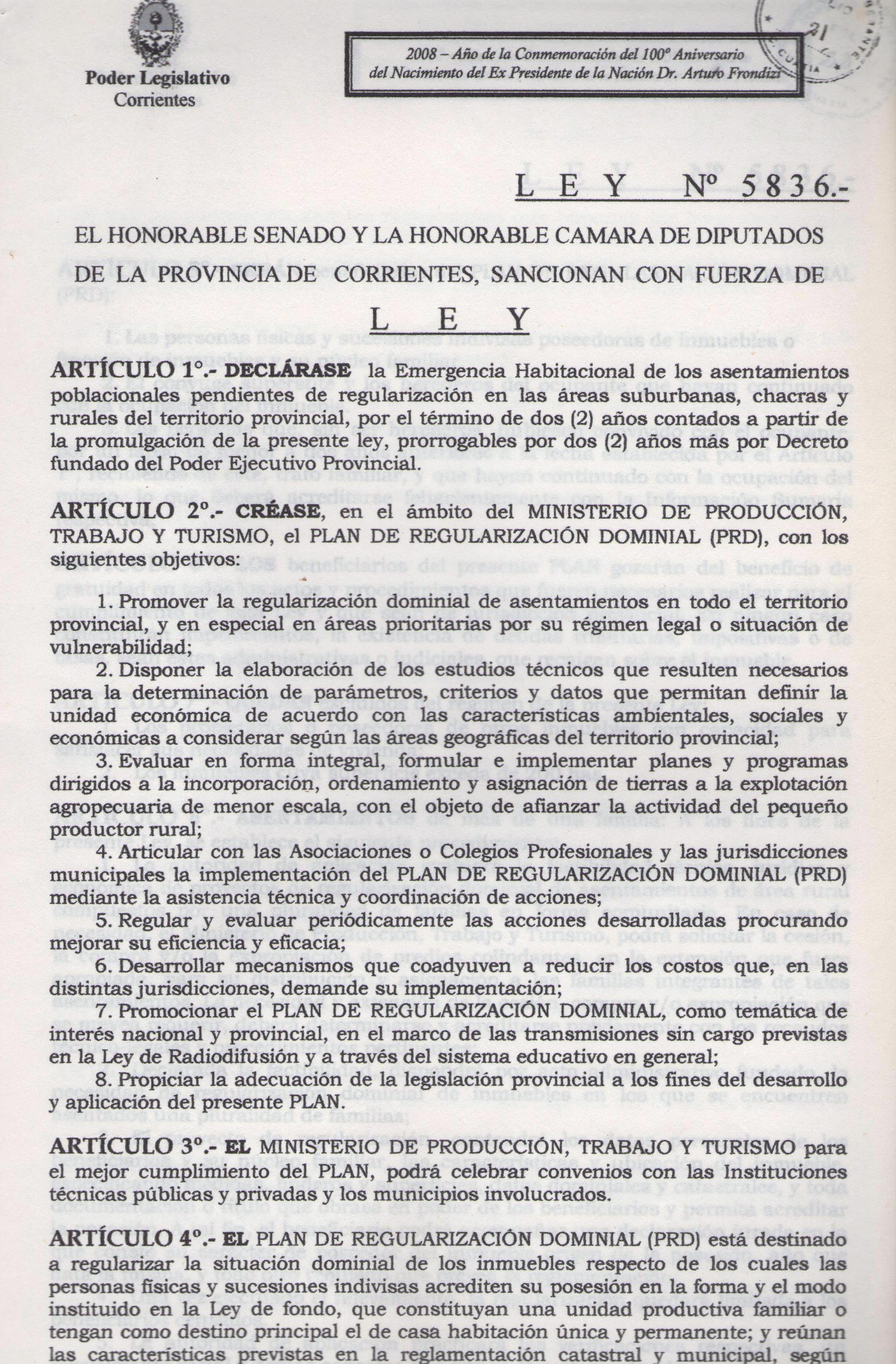 Art. 1º.- ADHERIR a la Ley Provincial Nº 5836, PLAN DE REGULARIZACION DOMINIAL (PRD).