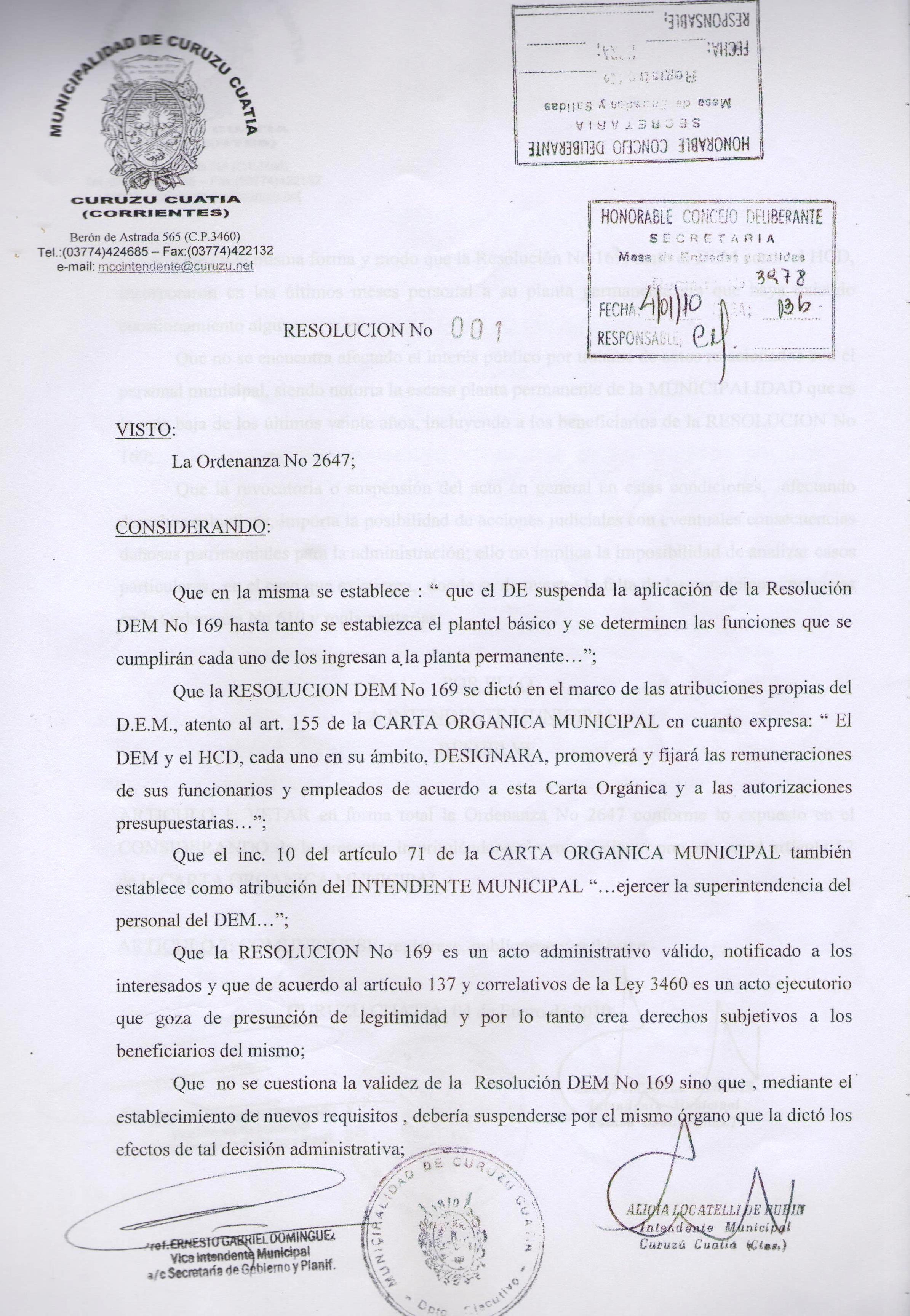 Art. 1°.- QUE el D.E. suspenda la aplicación de la Resolución del D.E. Nº 169 del 7 de diciembre del 2009, hasta tanto se establezca el Plantel básico y se determine las funciones que cumplirán cada uno de los que ingresan a la Planta Permanente.