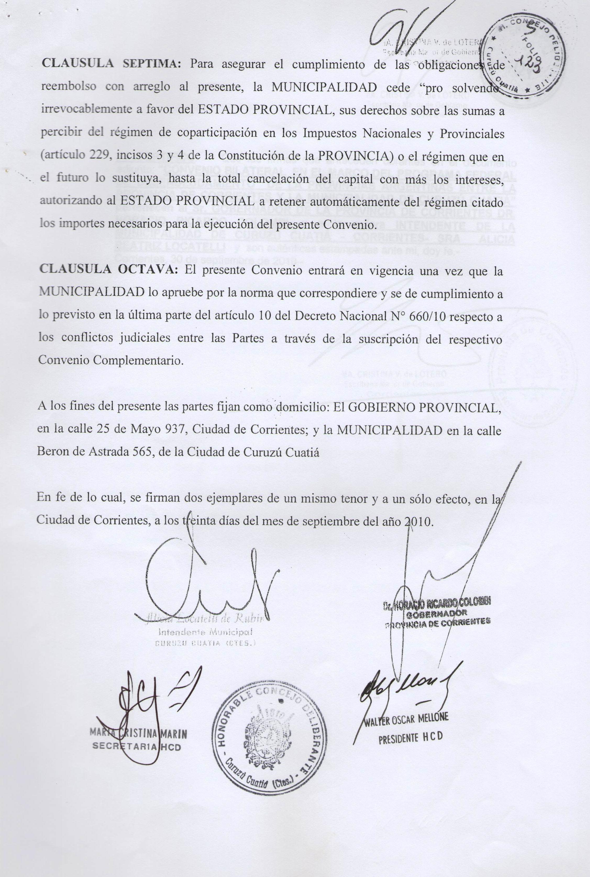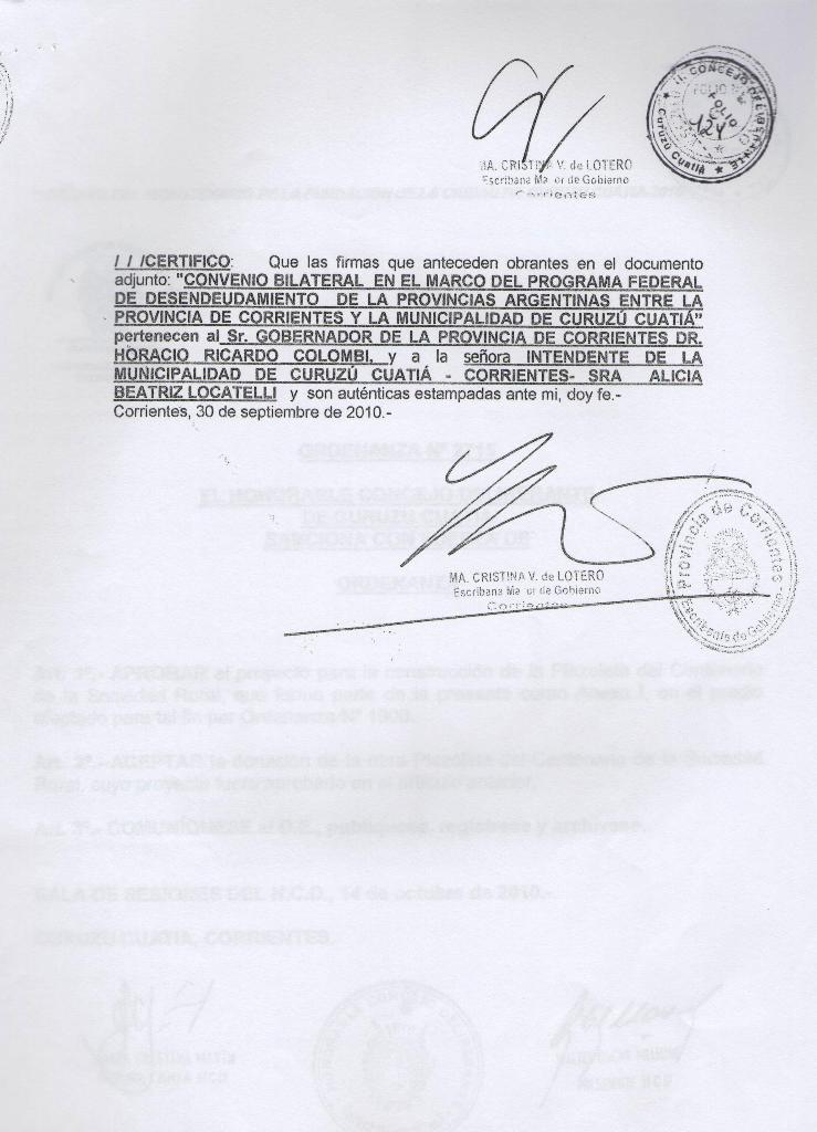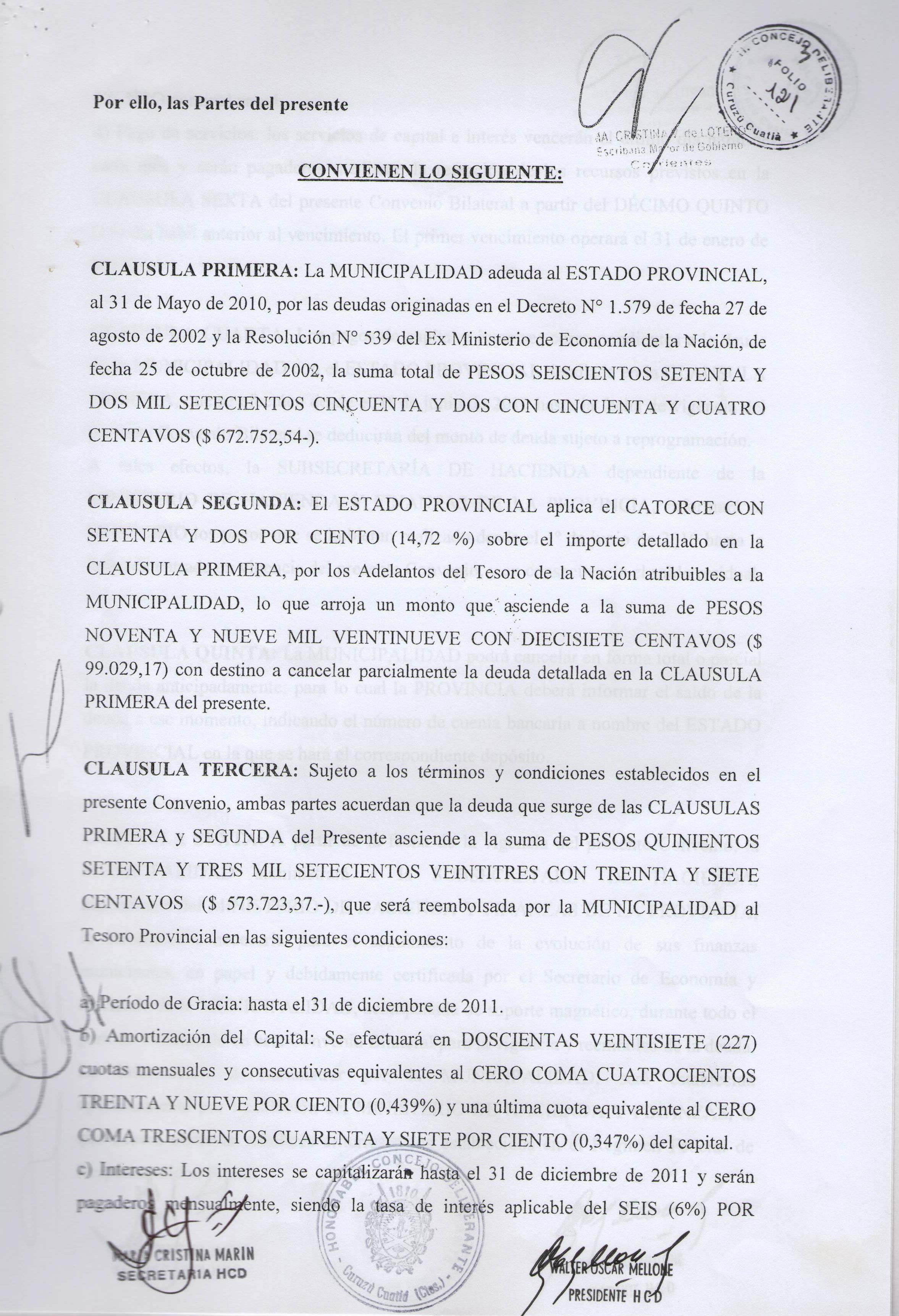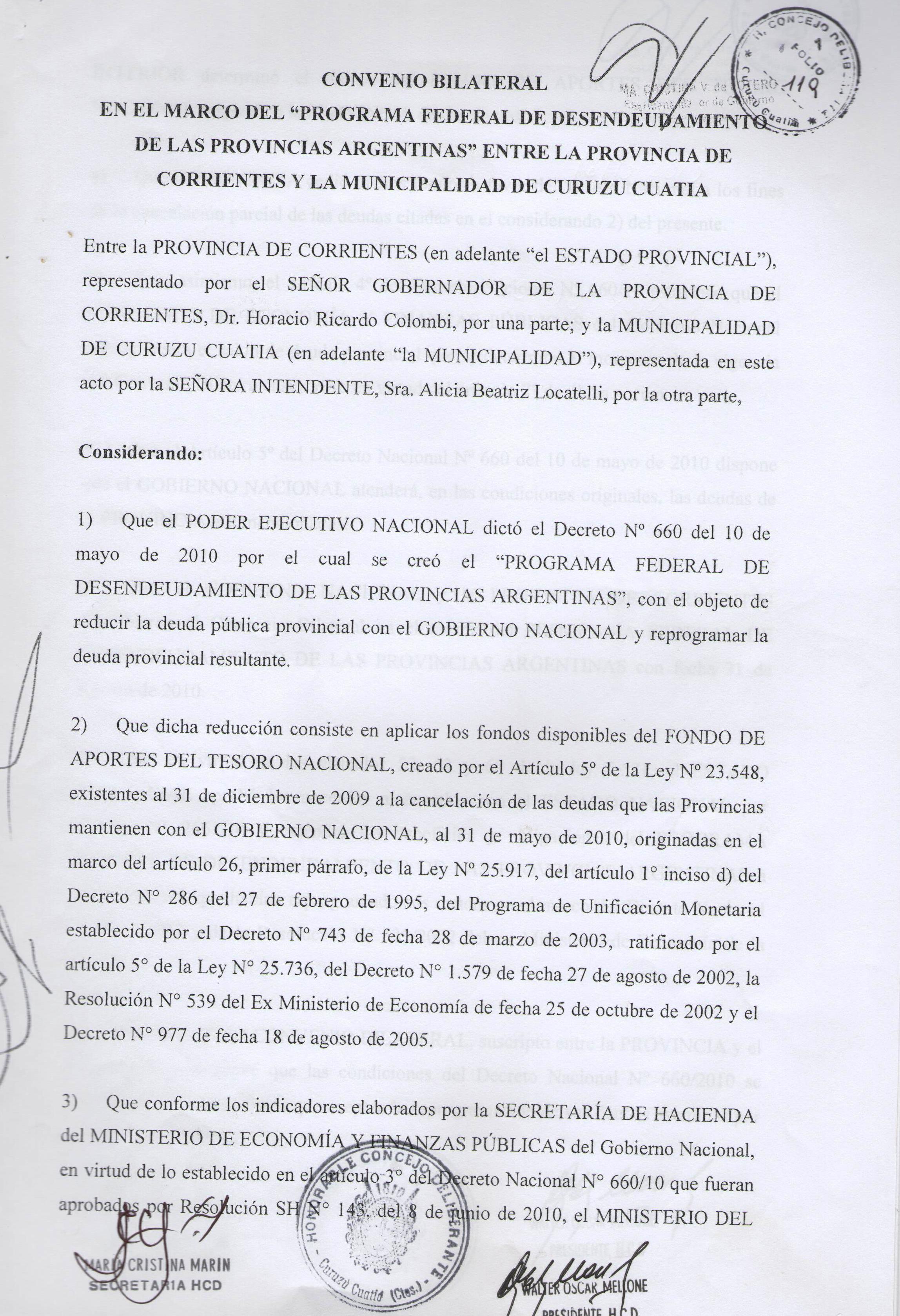 Art.1º.- APROBAR en todos sus tárminos el CONVENIO BILATERAL, cuya copia se adjunta como anexo que forma parte de la presente, suscripto por la Señora INTENDENTE MUNICIPAL en el marco del -œPROGRAMA FEDERAL DE DESENDEUDAMIENTO DE LAS PROVINCIAS ARGENTINAS-, originado en el Decreto Nacional Nº 660/10 y aprobado por el Decreto Provincial Nº 2661/10, por el cual se reprograman las deudas del MUNICIPIO DE CURUZU CUATIA comprendidas en el marco del Decreto Nacional Nº 1579/2002 y Resolución Nº 539/2002 del ex Ministerio de Economía de la Nación, que ascienden al 31 de mayo del 2010 a la suma total de PESOS SEISCIENTOS SETENTA Y DOS MIL SETECIENTOS CINCUENTA Y DOS CON CINCUENTA Y CUATRO CENTAVOS ( $ 672.752,54.-)