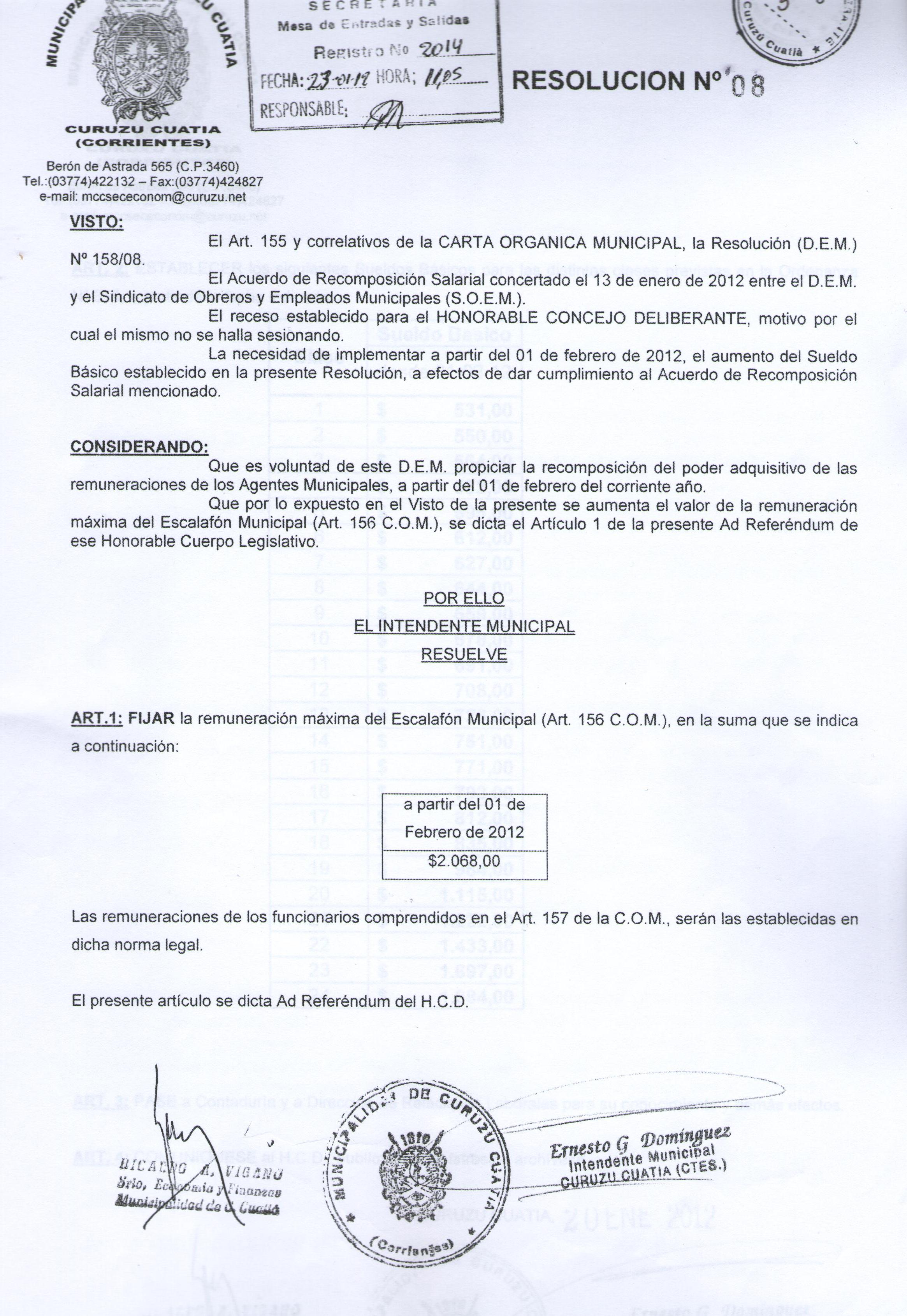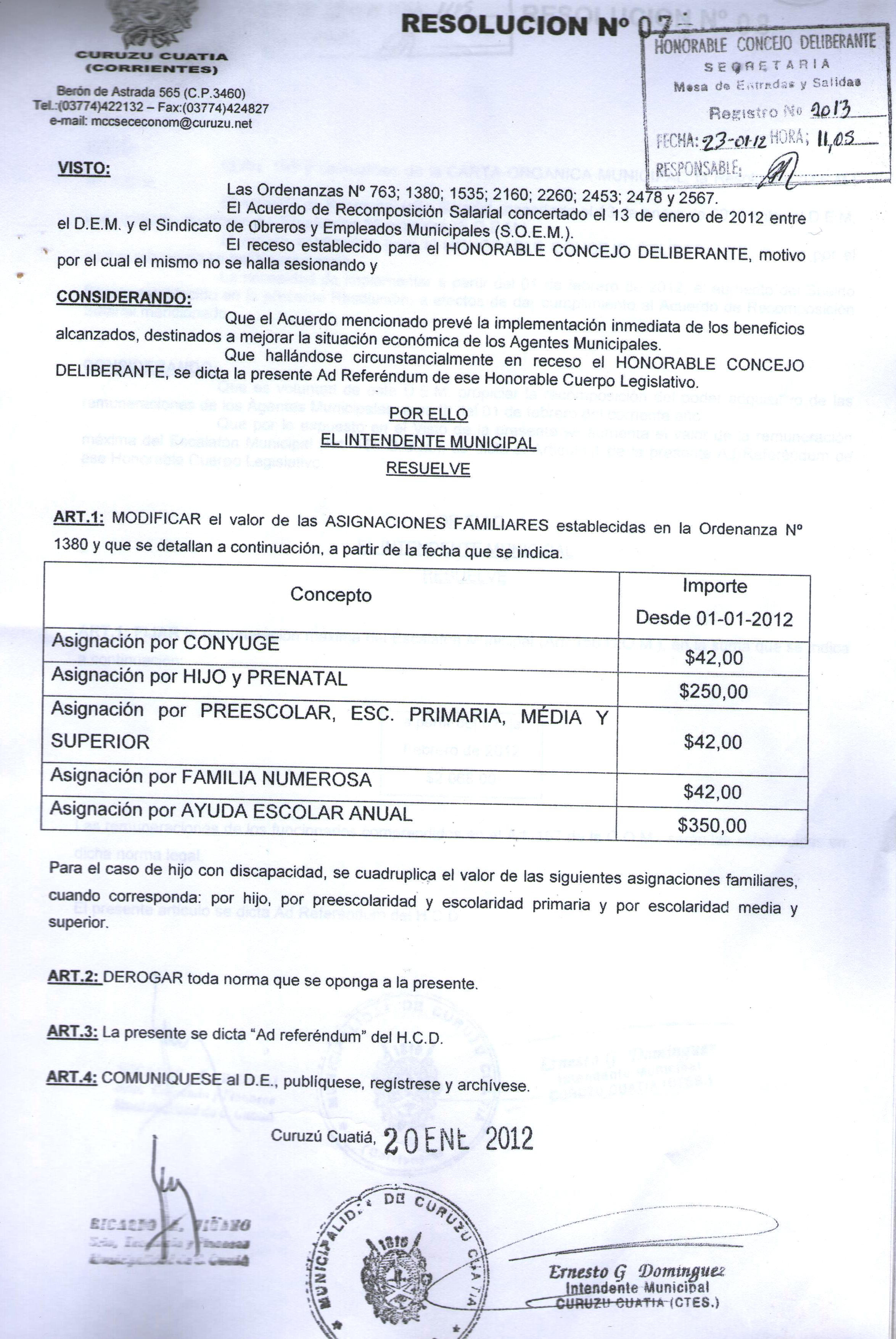 Art.1º.- HOMOLOGAR las resoluciones 07/12 y 08/12 del D.E.M. fijando laremuneración máxima del escalafón municipal y modificación de asignaciones familiares, dictadas “ad-referéndum” de este H.C.D. que forma parte de la presente como anexo I