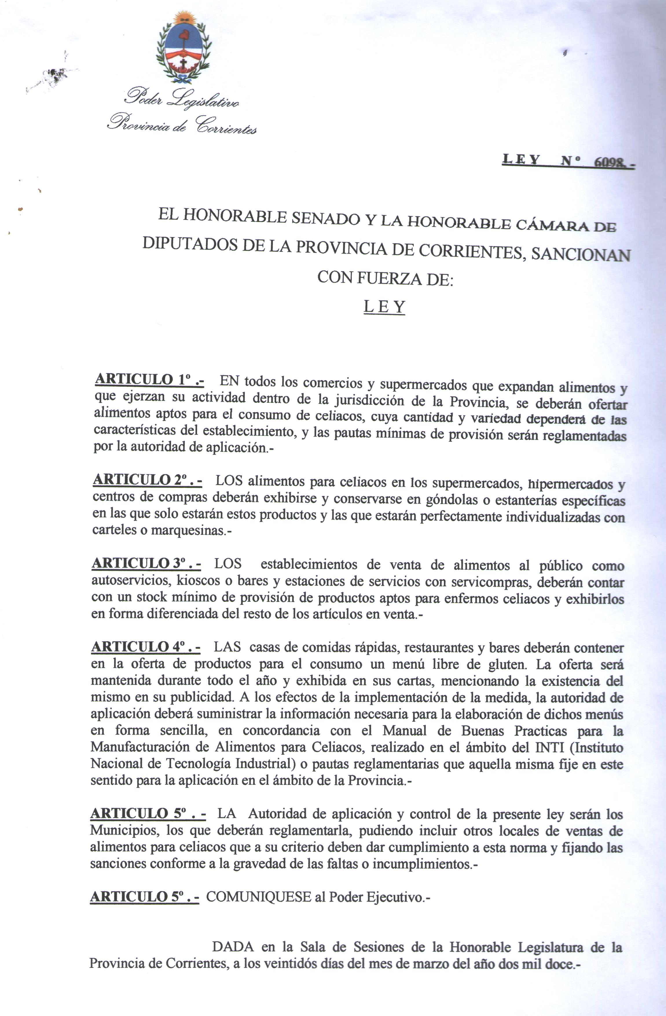 Art.1º.- ADHERIR a la Ley Provincial N° 6098, que establece la comercialización de alimentos aptos para consumo de celíacos.
