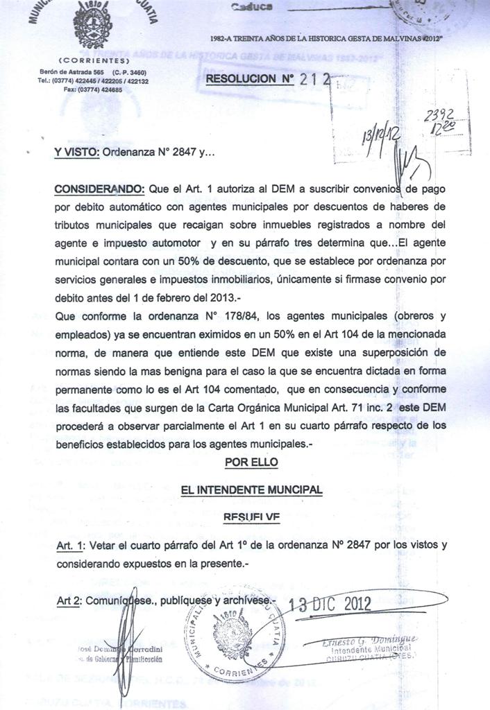 Art 1°.- AUTORIZAR al DEM a suscribir convenios de pago por débito automático con agentes municipales por descuentos de haberes de tributos municipales que recaigan sobre inmuebles registrados a nombre del agente e impuesto Automotor. • El agente municipal firmará una autorización de descuento de haberes a favor del Municipio por los impuestos municipales. • El DEM descontará de los haberes del agente las cuotas de convenios de pago y vencimientos mensuales. • El agente municipal contará con un 50% de descuento que se establece por ordenanza por Servicios Generales e Impuesto Inmobiliario, únicamente si firmase el convenio por débito antes del 1o de febrero del 2013. • Mensualmente el agente recibirá en su sobre de pago el comprobante de los impuestos abonados.