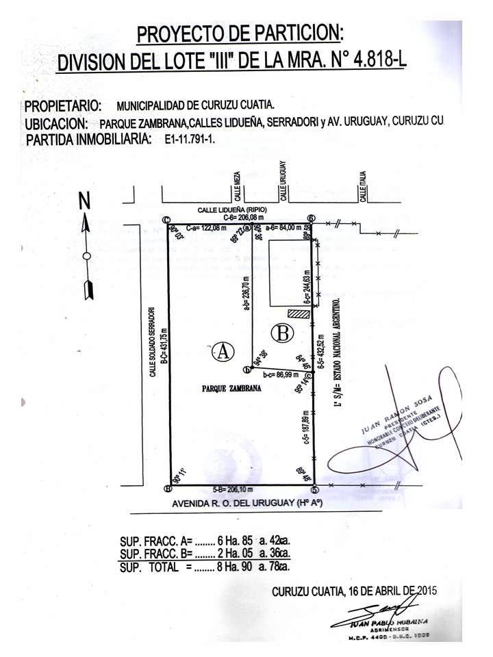 Inscripto en el RPI a nombre de la Municipalidad de Curuzú Cuatiá y en la Dirección General de Catastro bajo Adrema E1-11791-1 (e.m.e)