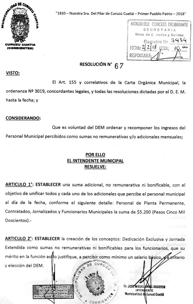 Art.1º.- HOMOLOGAR la Resolución N° 67/18 del DEM, de fecha 16 de enero de 2018 la que se agrega como Anexo I de la presente.