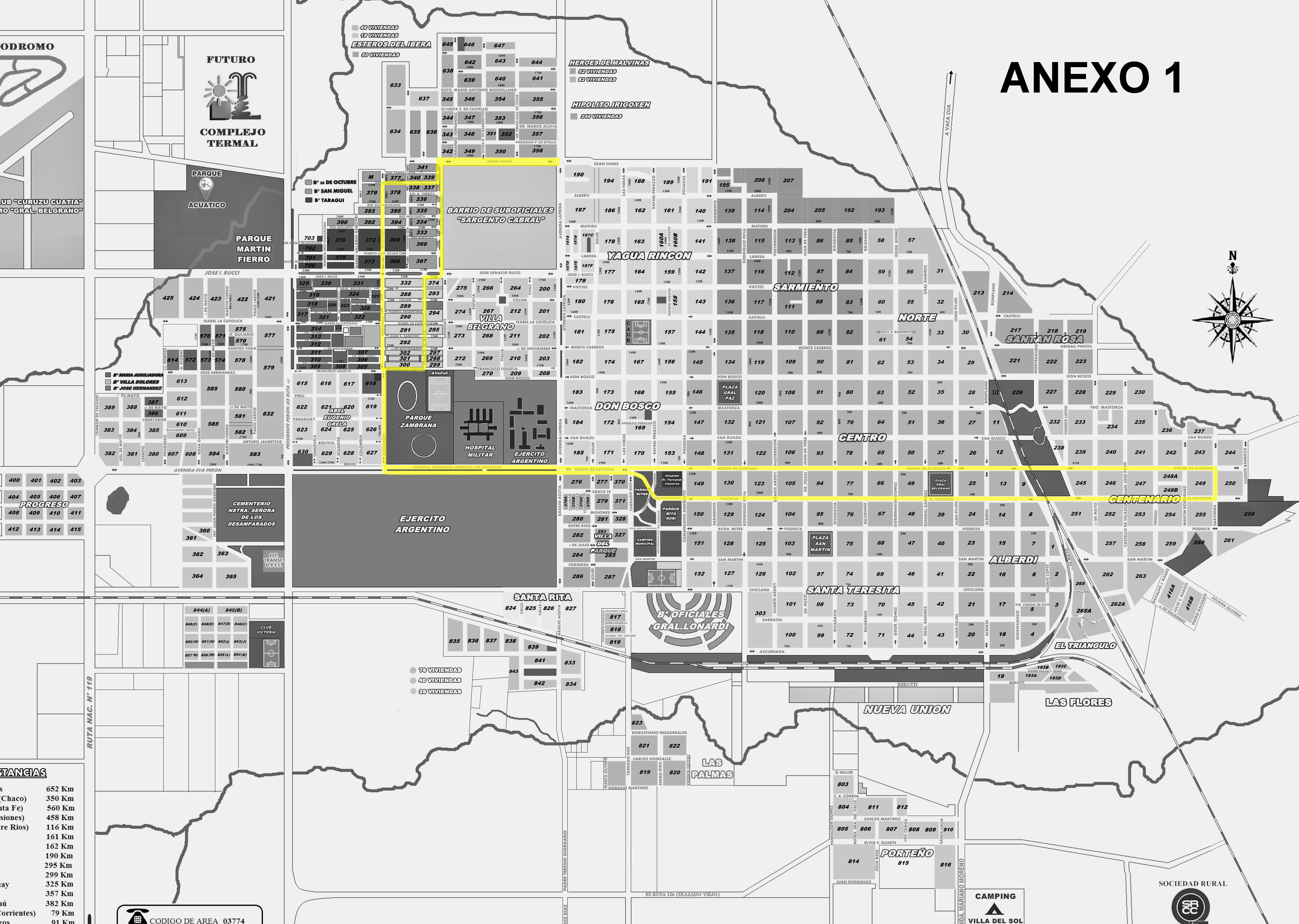 “Línea 1: Berón de Astrada y Saavedra; Berón de Astrada y French; Berón de Astrada y 25 de Mayo; Avda. España y Misia Antoñita Vázquez; Avda. España y Bonpland; Berón de Astrada y Gobernador Gómez; Berón de Astrada y Rivadavia; Berón de Astrada y Pueyrredón; Berón de Astrada y Posadas; Berón de Astrada luego de su intersección con las Heras; Berón de Astrada antes de su intersección con Avda. Laprida; Serradori y Brasil, ambas manos; Serradori y Paraguay, ambas manos; Serradori antes de su intersección con Francisco Lidueña; Soldado Meza y Francisco Lidueña; Soldado Meza antes de su intersección con Isabel la Católica; Soldado Meza y Crucero Gral. Belgrano; Avda. Bicentenario y Río Miriñay; Avda. Bicentenario y Río Santa Lucía; Deán Funes y Juana Barrientos, ambas manos; Deán Funes antes de su intersección con Avda. Laprida; Avda. Bicentenario y Dean Funes; Rio Corrientes y Serradori; Serradori y Rio Aguapey; Serradori antes de su intersección con Crucero Gral. Belgrano; Serradori y pasaje Dr. Amancio Moral; Serradori y pasaje Sargento Cabral; Berón de Astrada al 1650; Berón de Astrada luego de su intersección con Poeta Edgar Estigarribia; Elenna Bonatti Rocca y Comandante Andresito; Castillo luego de su intersección con Duarte Ardoy; Castillo luego de su intersección con Rivadavia; Castillo antes de su intersección con Gobernador Gómez; Caá Guazú al 520; Caá Guazú y Bonpland; Bonpland y Av. España; El Maestro y Alberdi; El Maestro y 25 de Mayo; El Maestro y French y El Maestro y Saavedra”.