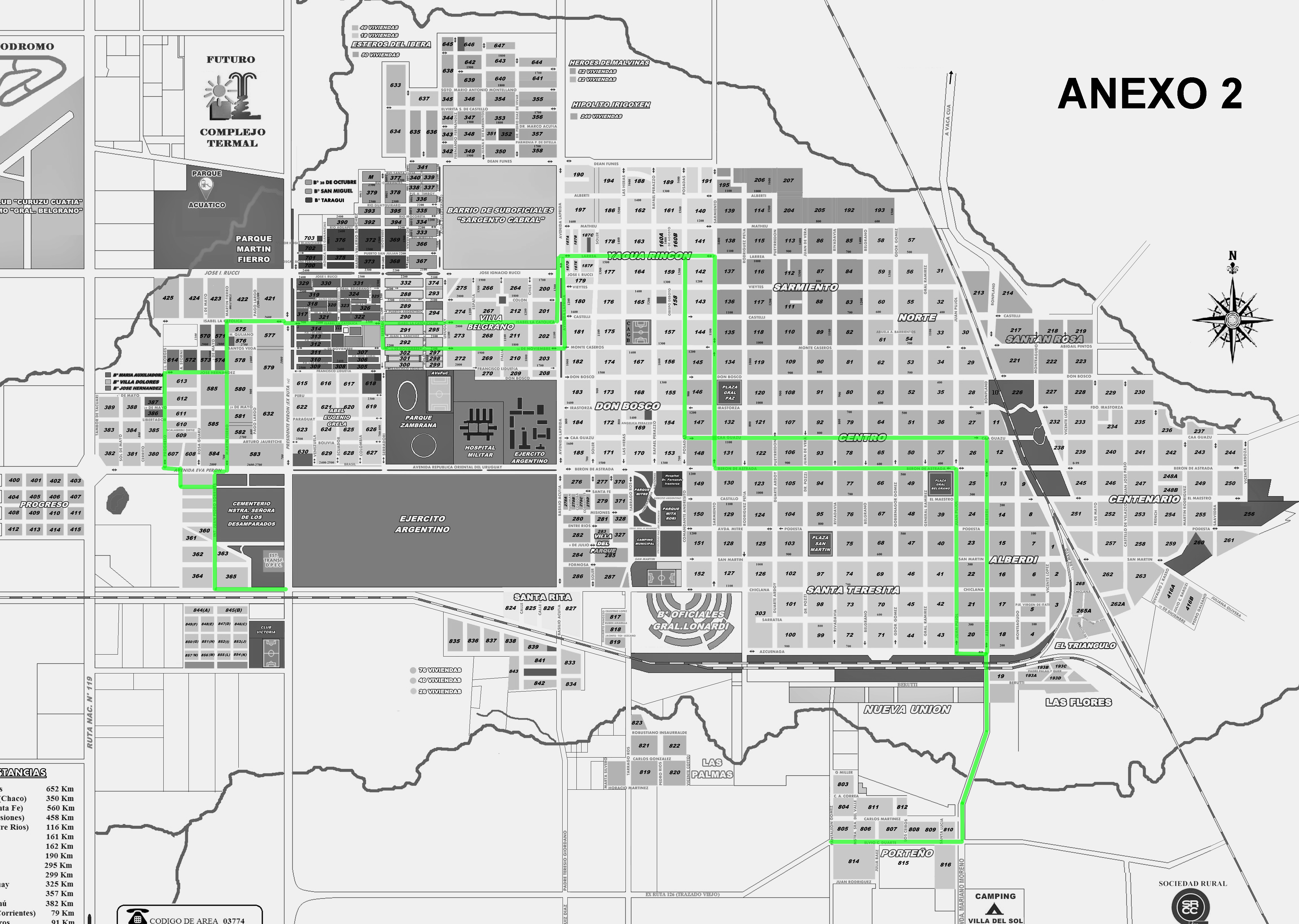 “Línea 2: Chiclana y Juan Pedro Sorribes; Juan Pedro Sorribes y concejal Milciades Aranda; Juan Pedro Sorribes y concejal José Rivas; Juan Pedro Sorribes y Avda. Eva D. de Perón acera Oeste; en calle sin nombre (lado oeste de la Escuela N° 7 Juan Balestra); Avda. Eva Duarte de Perón y Progreso; José Hernández (entre Alfonsina Storni y Rosa Guarú); Martin Fierro y Santos Vega; Isabel la Católica y Pago Largo, ambas manos; Isabel la Católica y Presidente Perón, ambas manos; Isabel la Católica y Serradori, ambas manos; 16 de Noviembre y Uruguay; 16 de Noviembre y España; 16 de Noviembre y Avda. Laprida; Avda. Laprida y antes de su intersección con I. Rucci; Larrea y Dante Bravo; Larrea y Las Heras; Larrea y Posadas; Posadas y Castelli; Posadas, antes de su intersección con Don Bosco; Posadas al 850; Caá Guazú a 20 mts aproximadamente luego de la intersección de Juan de Vera; Caá Guazú al 520; Caá Guazú y Bonpland; Bonpland y Av. España; Alberdi y San Martin; Alberdi y Sarratea; Avda. Mariano Moreno y Berutti; Ceferino Duarte y Santa Lucia; Ceferino Duarte y Julia Báez; Ceferino Duarte y Pantaleón Gómez; Juan Pujol antes de su intersección con Sarratea; Juan Pujol y San Martin; Juan Pujol al 600 (frente a Casa Parroquial); Berón de Astrada y Rivadavia; Berón de Astrada y Pueyrredón; Sarmiento al 751; Sarmiento al 900 (frente a Plaza Gral. Paz); Sarmiento y Monte Caseros; Sarmiento y Vieytes; Larrea al 1.250; Isabel la Católica y Avda. Laprida; Isabel la Católica y España; Isabel la Católica y Uruguay”.